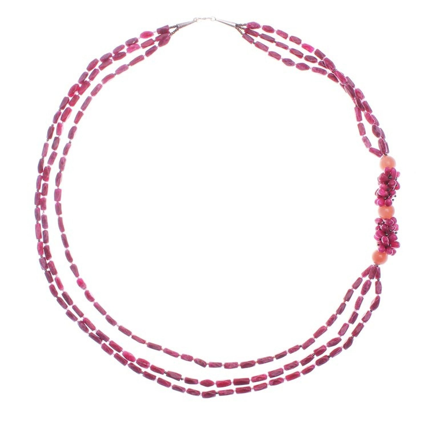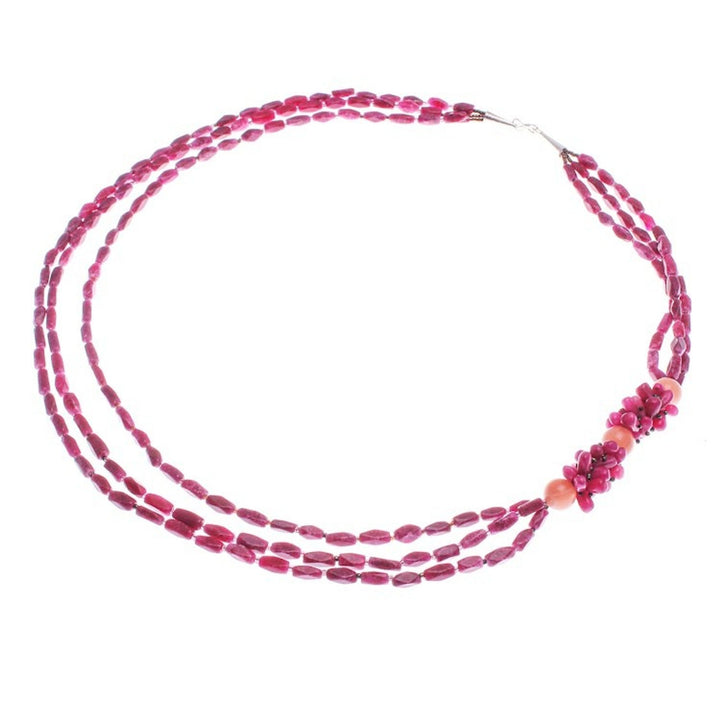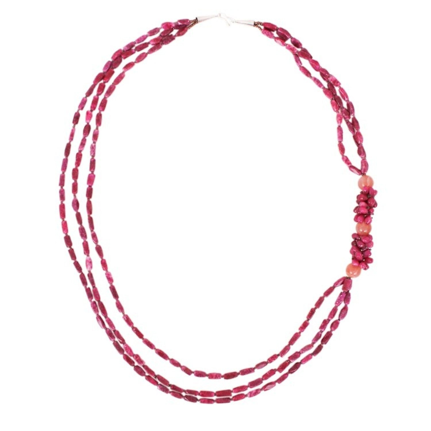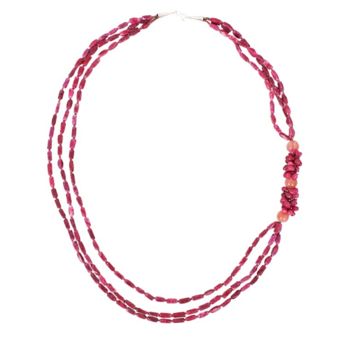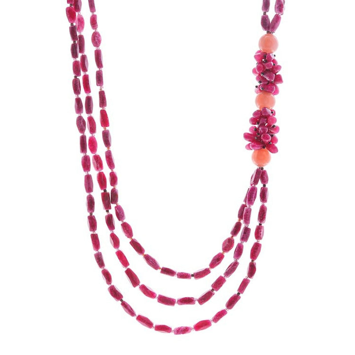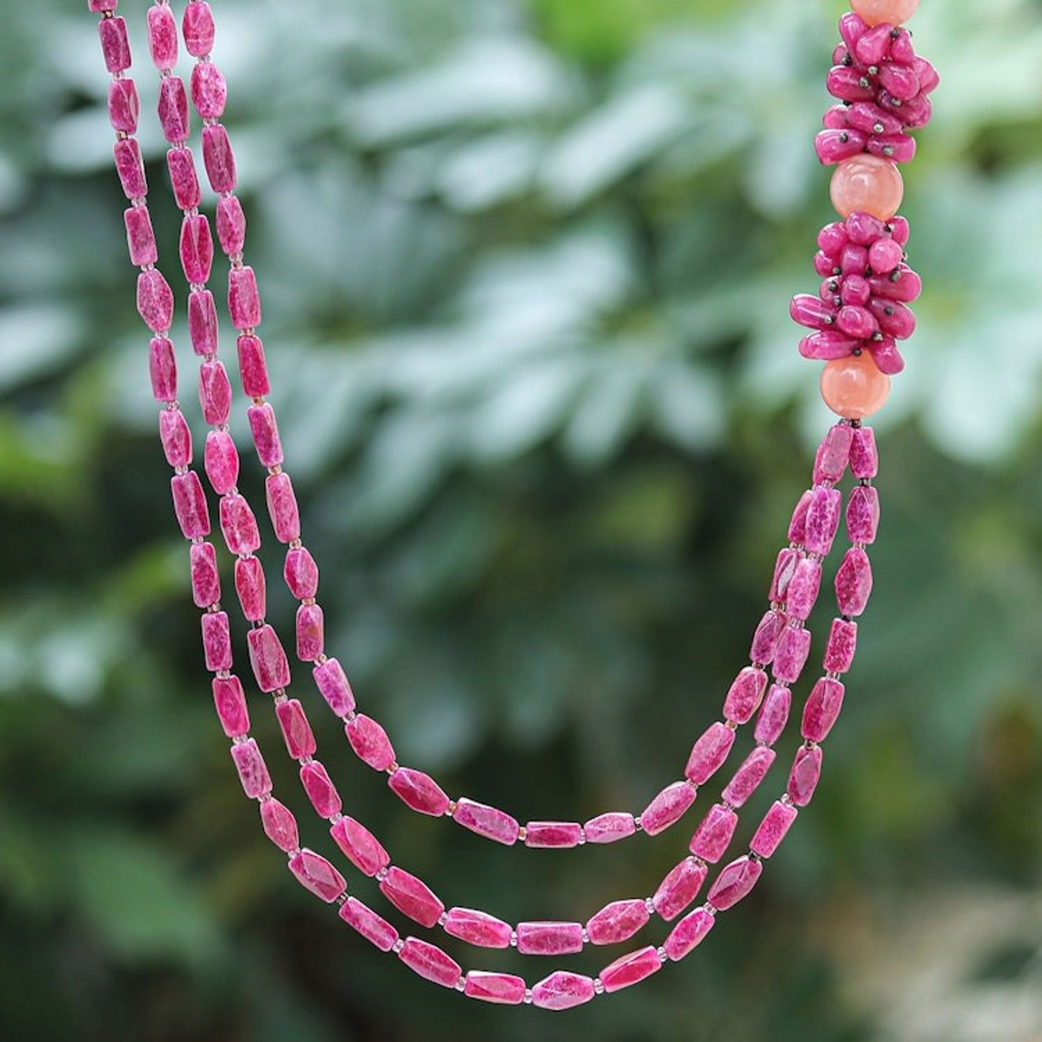 This Hand Crafted Pink Quartz Glass Long Beaded Strand Necklace 'Pink Fantasy' by Sukanya Thongperm is a bohemian and exotic three-strand long necklace handcrafted with quartz and glass beads in vibrant hues of pink. It's a statement piece designed to be fashionable. She is a self-taught designer who draws inspiration from exhibitions and her own imagination.