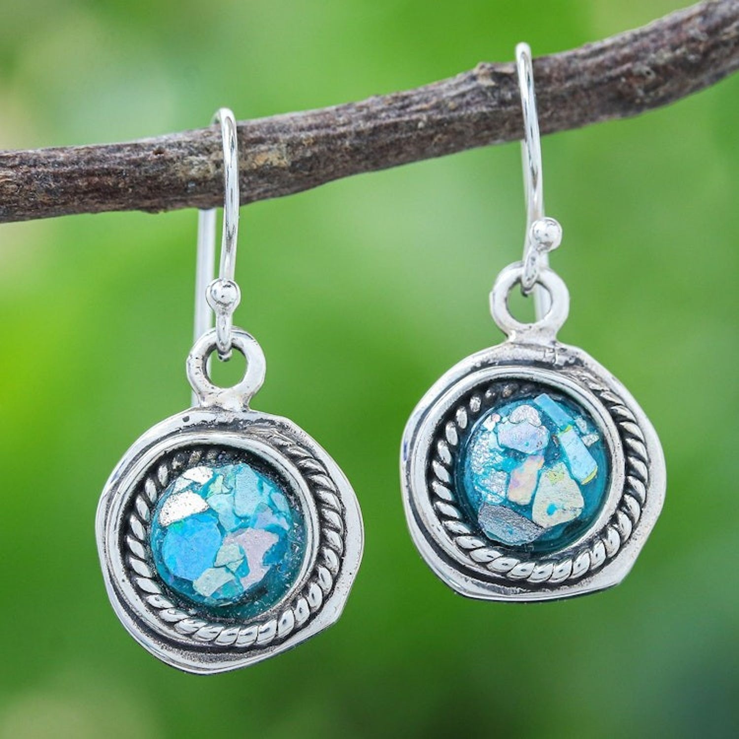 These Hand Crafted Roman Glass Dangle Earrings 'Glacier Bay' by Michael Krainer are a gorgeous pair of glass earrings that allow you to wear a piece of history on your ears. They are crafted from ancient Roman glass, which is recovered from archaeological dig sites up to 2,000 years old. Sterling silver accents complement the iridescent glass perfectly. Their jewelry combines tradition with innovation, crafted with care and infused with love.