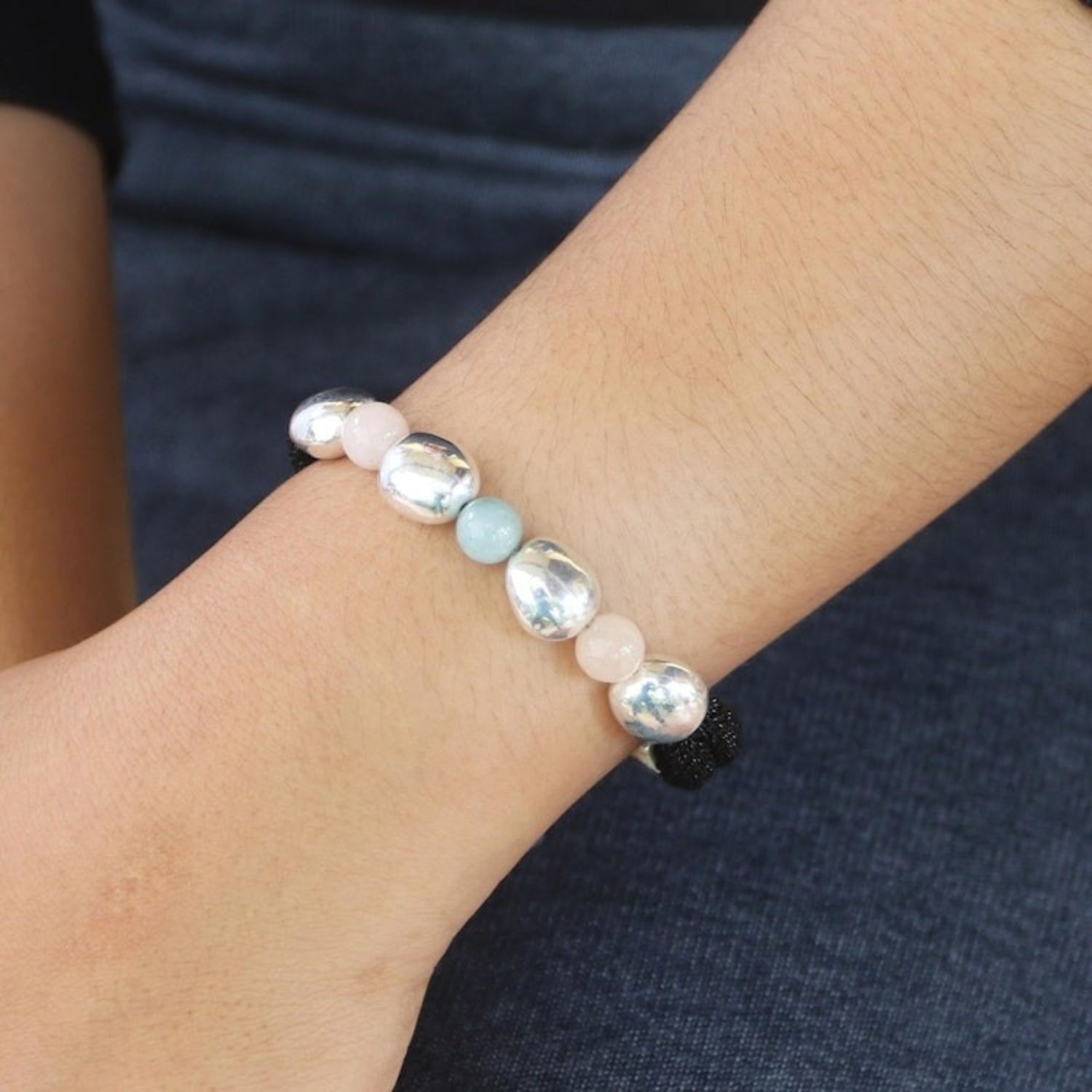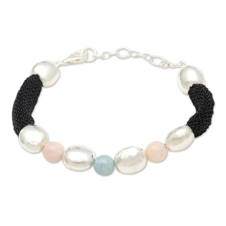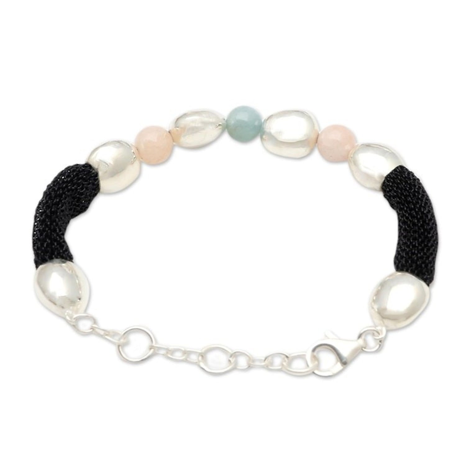 This Hand Crafted Rose Quartz and Beryl Beaded Bracelet 'Candy Crush' by Ayu Widiani is a lovely bracelet with soft, pastel gemstones and cool silver contrasting with deep black. The artisan combines aqua beryl orbs with rose quartz gemstones and gleaming sterling silver plated brass beads, while black mesh panels add an unexpected yet welcome touch. Her jewelry reflects the spirit of Bali.