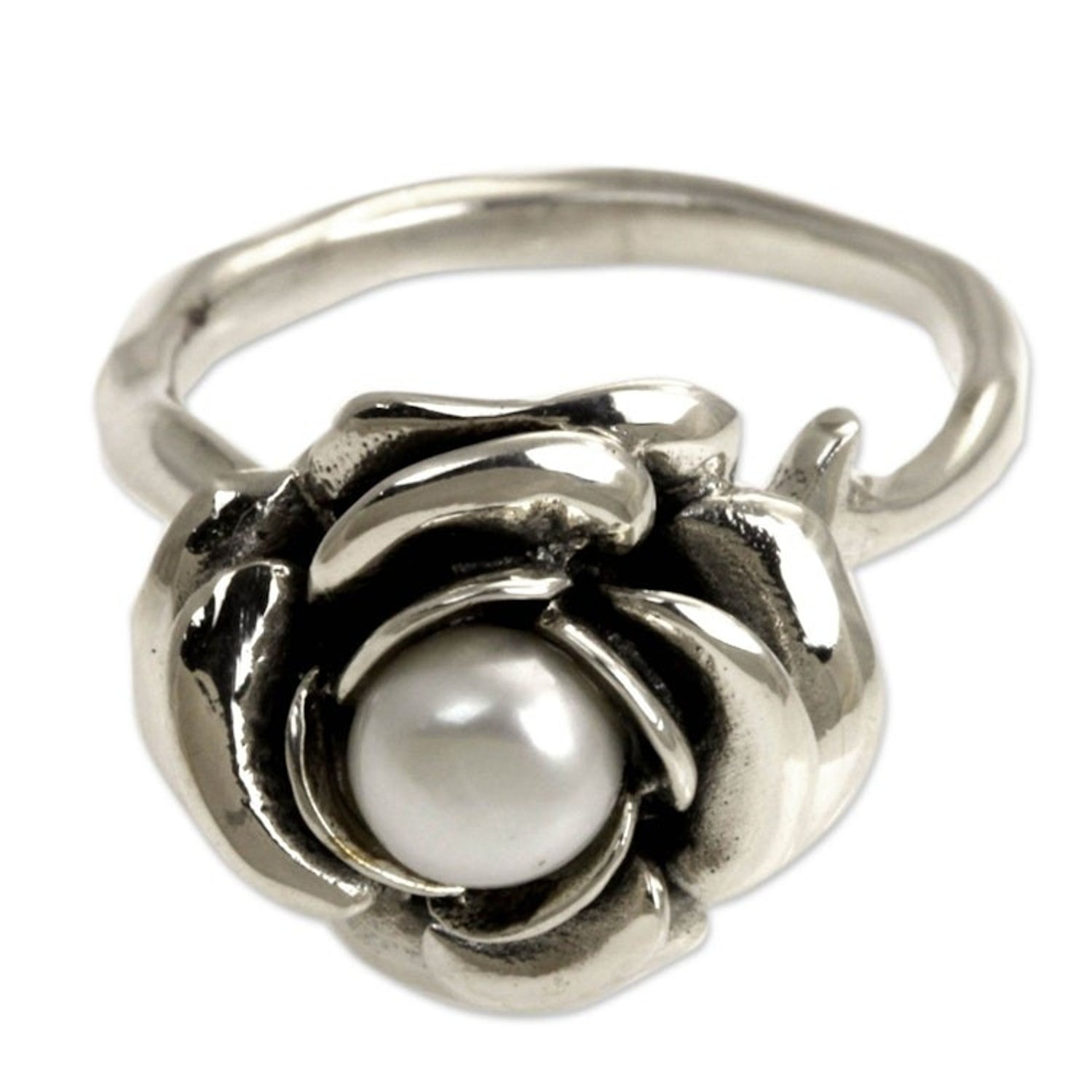 This Hand Crafted Sterling Silver and Pearl Flower Ring 'White Rose' by Nyoman Rena is a beautiful ring that centers a pristine rose in sterling silver, centered by a lustrous white pearl. By blending his carving skills with metalwork, Rena developed a distinctive style that captures both Balinese heritage and contemporary design.