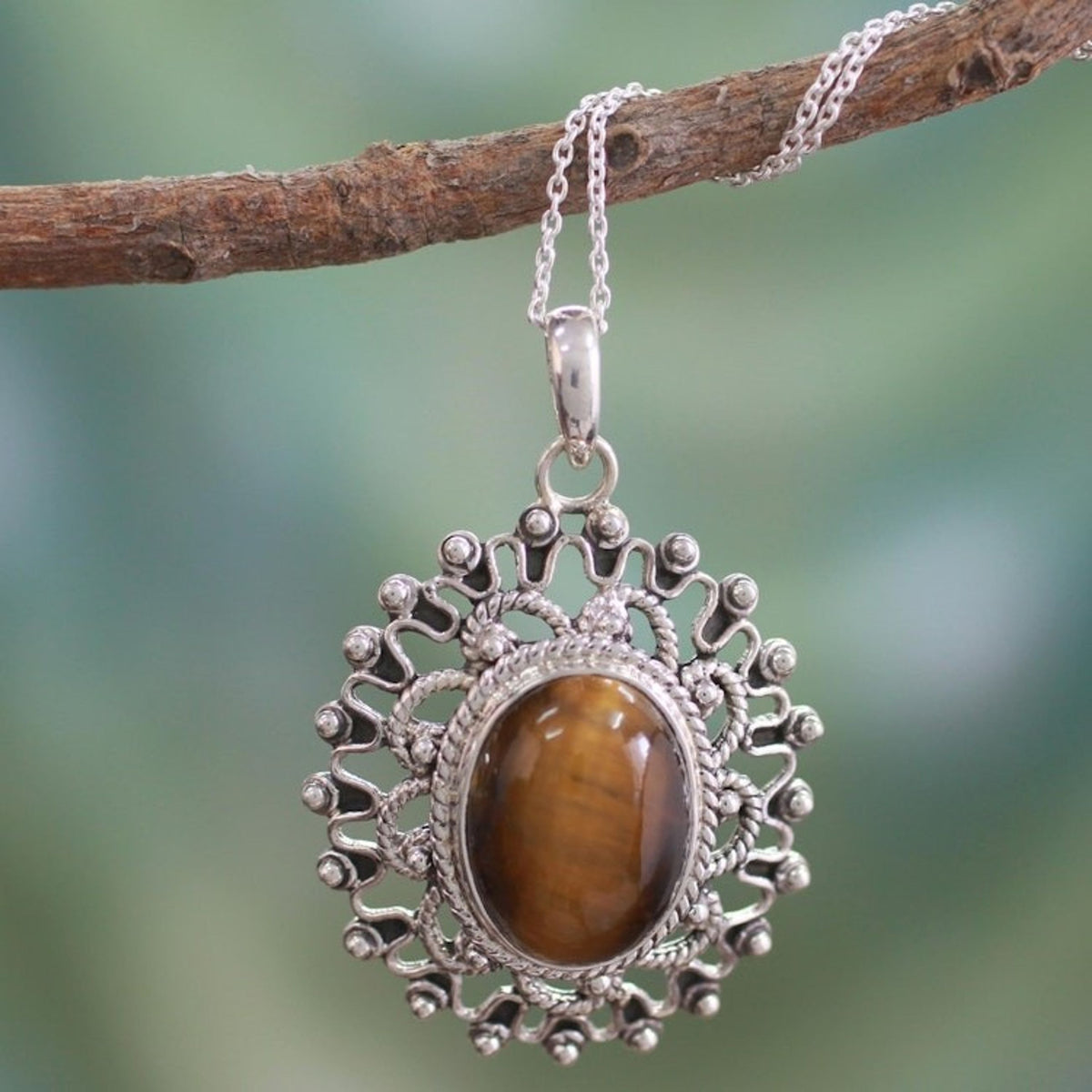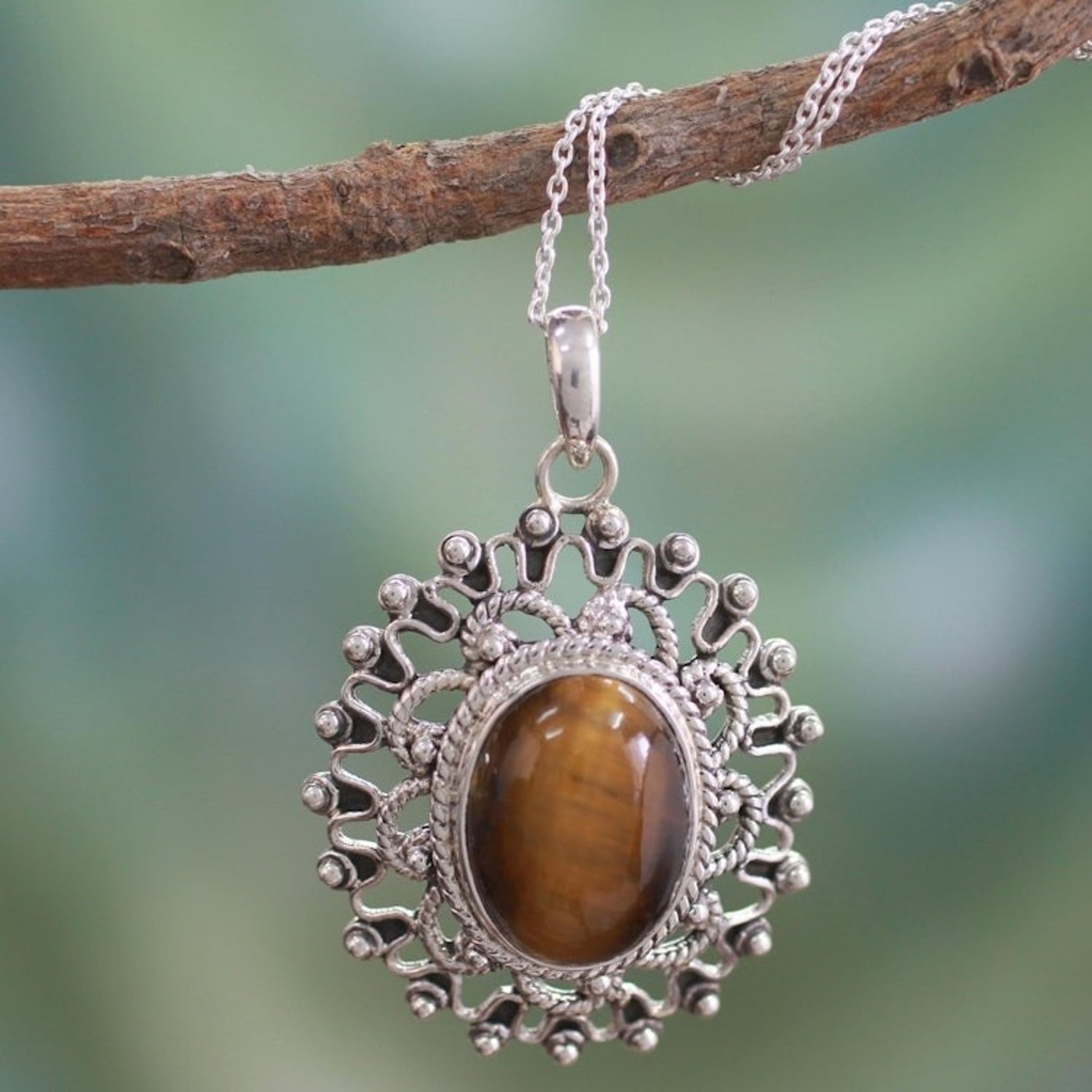 This Hand Crafted Sterling Silver and Tigers Eye Pendant Necklace 'Tawny Sun' by Bhavesh is an elegant necklace that showcases an oval of golden tiger's eye. Surrounded by stylized silver rays, the opulent necklace suggests India's ancient art. He is committed to crafting jewelry that reflects Jaipur’s cultural essence and connects with a global audience.