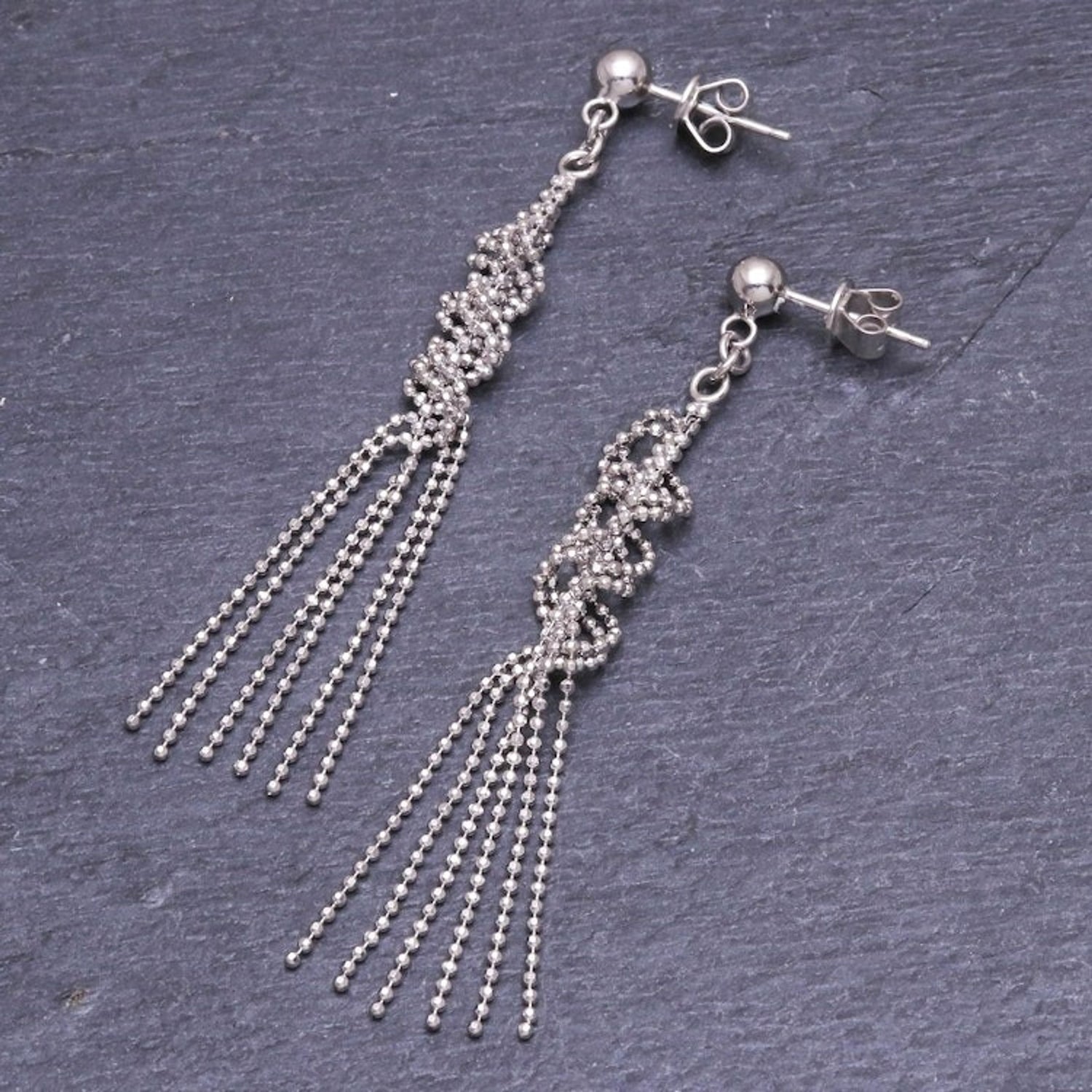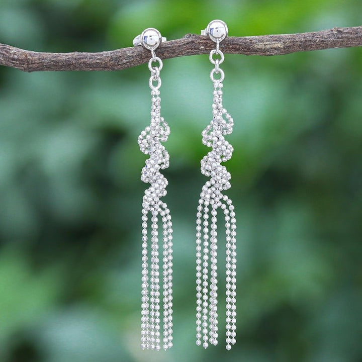 These Hand Crafted Sterling Silver Waterfall Earrings 'Silver Cascade' by Angels are a cascading pair of earrings that make it look like you're wearing a waterfall on your ears. The artisan uses strands of faceted sterling silver balls to create the pair, twisting each strand into a spiral then letting all six dangle freely. Her designs embody both tradition and refinement.