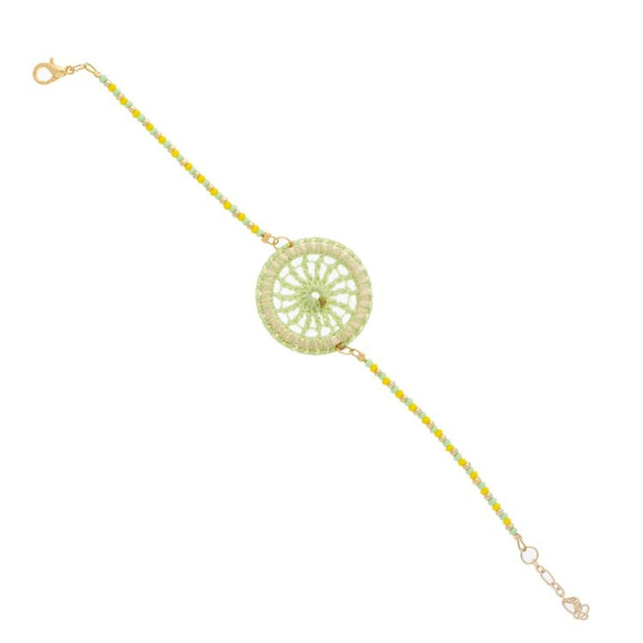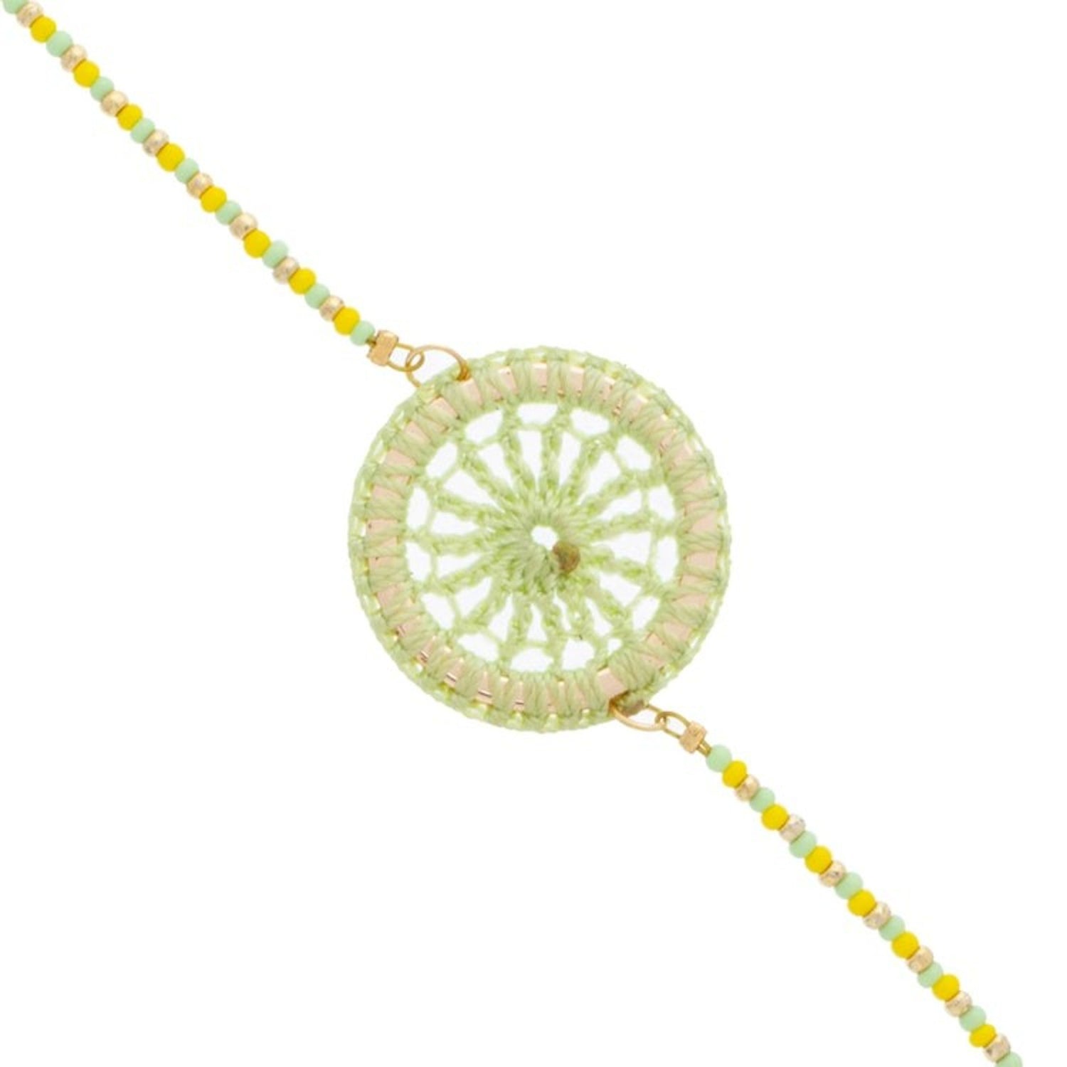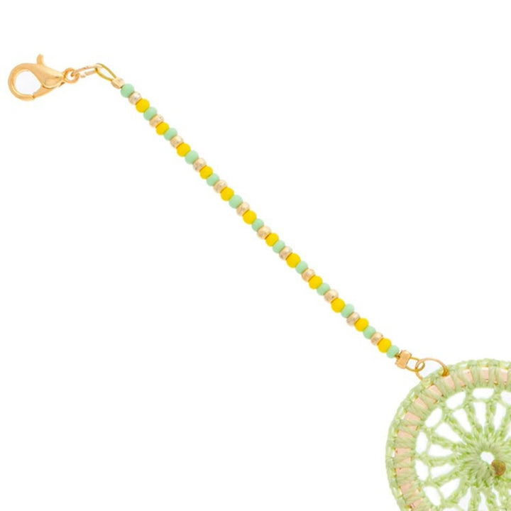 This Hand-Crocheted Pendant Bracelet with Gold Accents 'Daphne' by Monserrat Domínguez is a unique pendant bracelet inspired by Greek mythology. Named 'Daphne,' it features a round, hand-crocheted pendant in pistachio, flanked by strands of glass beads and 14k gold-plated beads. Her designs are precise yet playful.