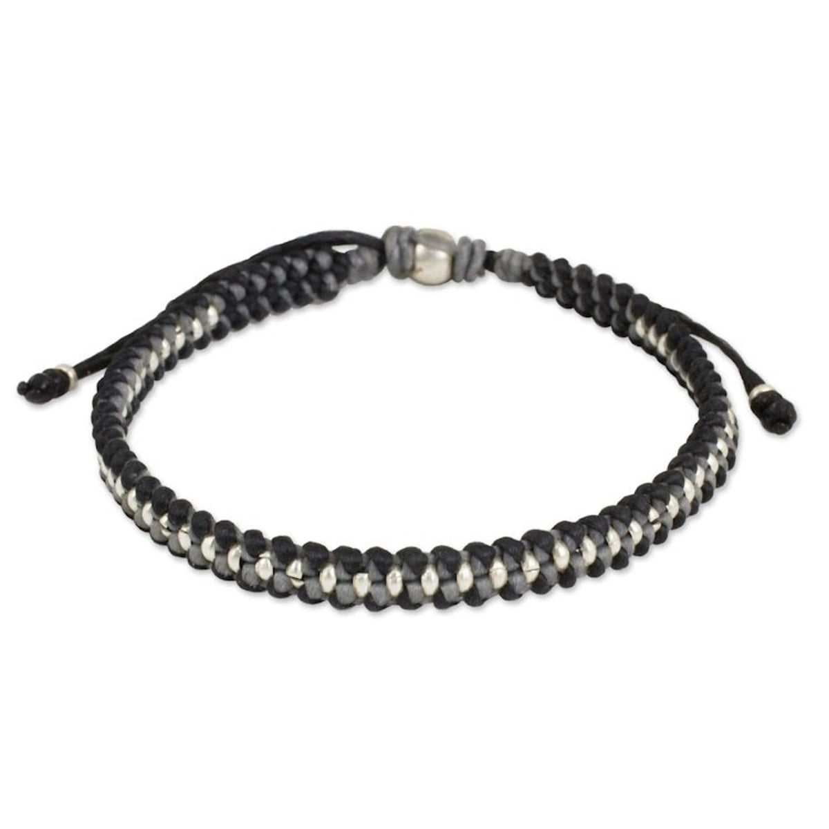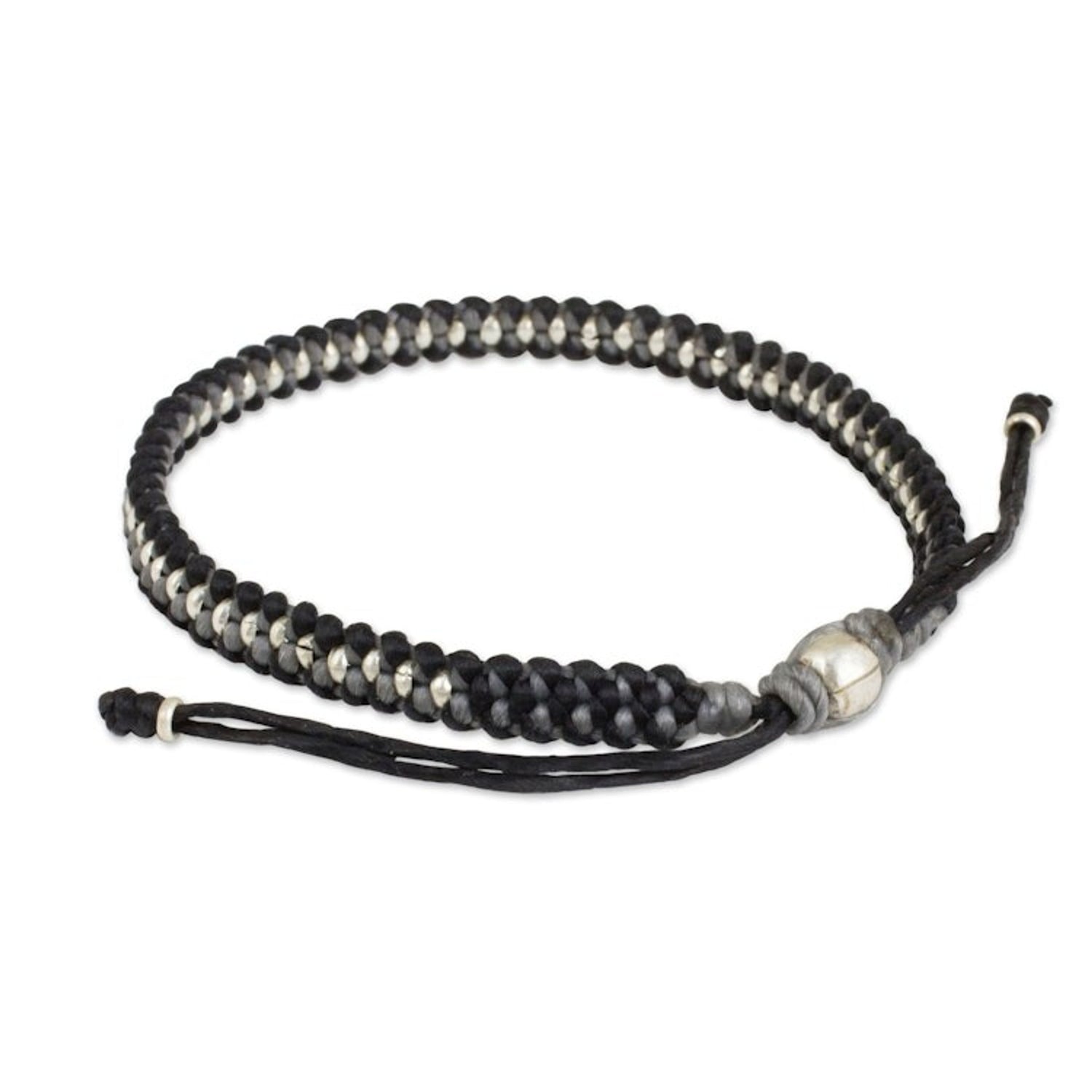 This Hand Knotted Macrame Bracelet with Hill Tribe Silver Beads 'Grey Black Progression' by Napapat is a wristband bracelet knotted by hand with 950 silver beads by hill tribe artisans. It combines grey and black cords to braid the design. Each of her creations reflects patience, imagination, and heartfelt artistry.