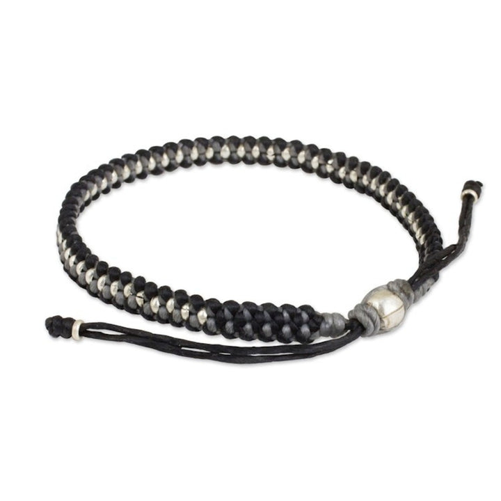 Hand Knotted Macrame Bracelet with Hill Tribe Silver Beads 'Grey Black Progression'