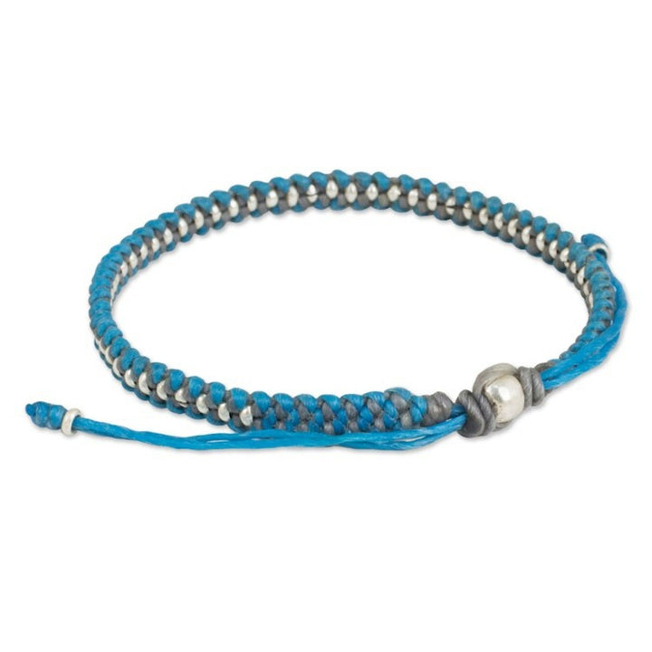 Hand Knotted Macrame Bracelet with Hill Tribe Silver Beads 'Blue Grey Progression'