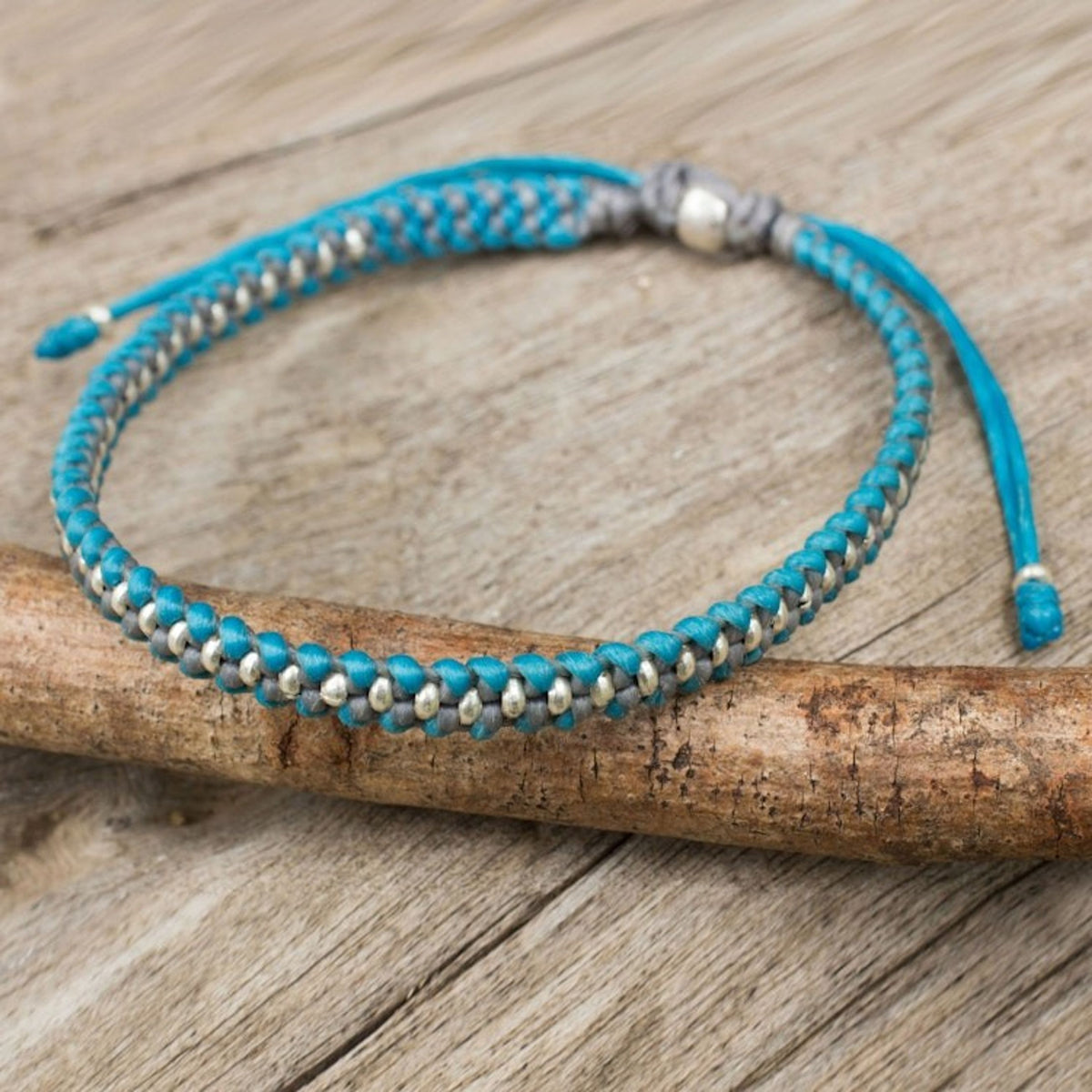This Hand Knotted Macrame Bracelet with Hill Tribe Silver Beads 'Blue Grey Progression' by Napapat is a wristband bracelet knotted by hand with 950 silver beads by hill tribe artisans. It combines turquoise blue and grey cords to braid the design. Now based in Chiang Mai, she collaborates with local artisans.
