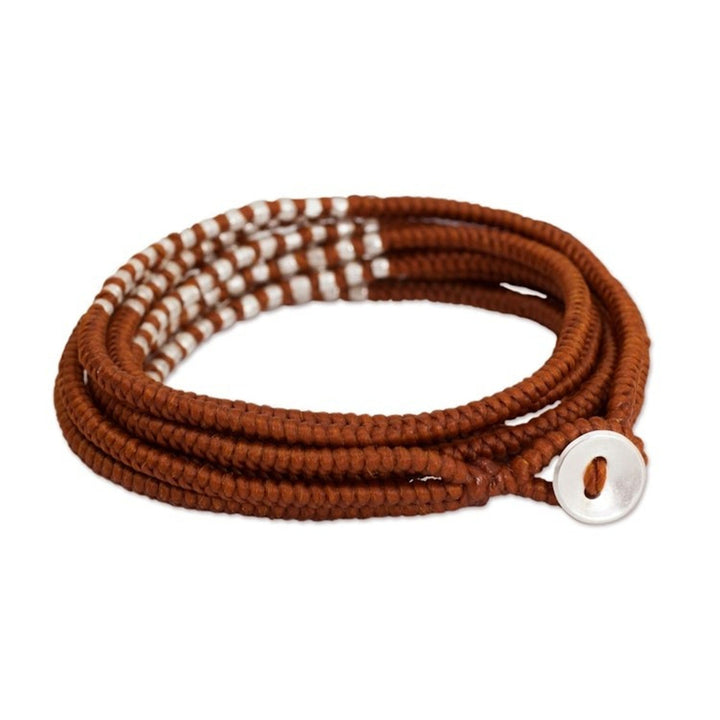 This Hand Knotted Wrap Bracelet with Silver Accents 'Karen Honey Chic' by Napapat is a trendy wrap bracelet in rich honey brown. She unites three strands into a loop and clasp, knotting them each by hand. Florid beads of sterling silver plated brass contrast with feminine elegance. They are crafted by Karen hill tribe artisans.
