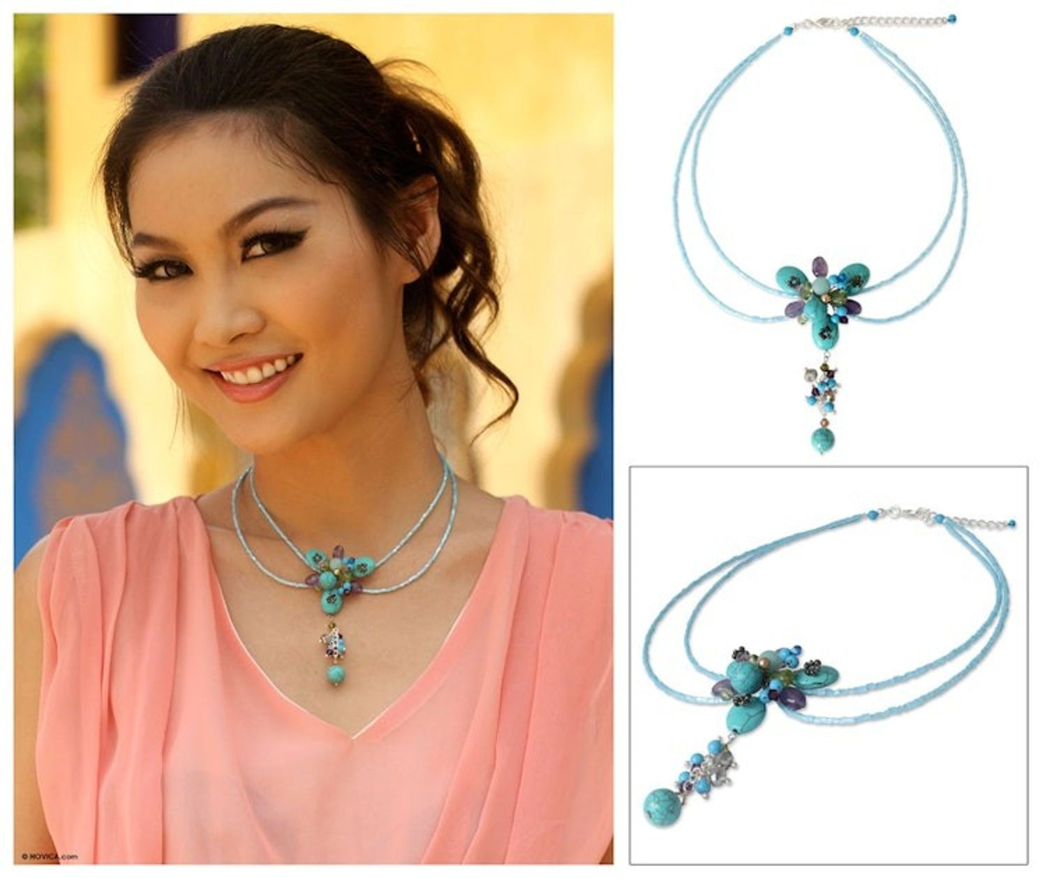This Hand Made Beaded Turquoise Colored Necklace 'Sweet Serenade' by Busarin Hutawarakorn is a necklace where colorful gemstones cluster in an enchanting array on twin strands. Blue calcite, cool amazonite, peridot, and amethyst are selected to craft this feminine necklace. She donates part of her earnings to support orphaned children.