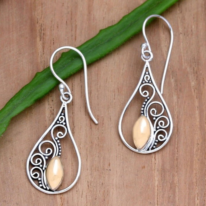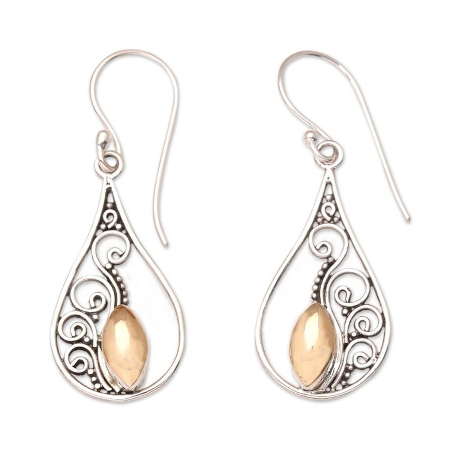 These Hand Made Gold-Accented Dangle Earrings 'Golden Vision' by Made Suyana have glowing, otherworldly golden accents. The Balinese artisan hand crafts openwork designs from sterling silver that curl asymmetrically around 18k gold-plated sterling silver accents. He continues to create meaningful designs that sustain his family, community, and Balinese silversmithing legacy.