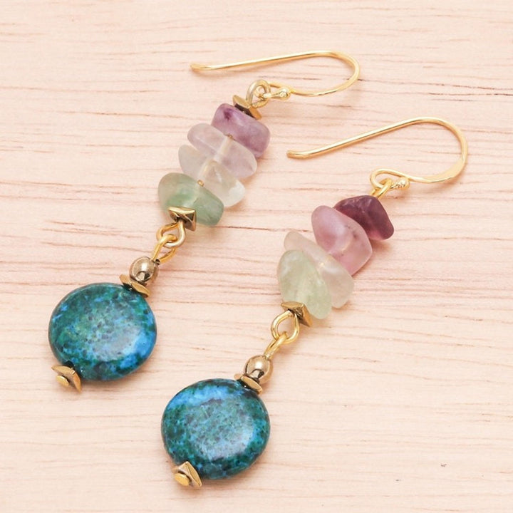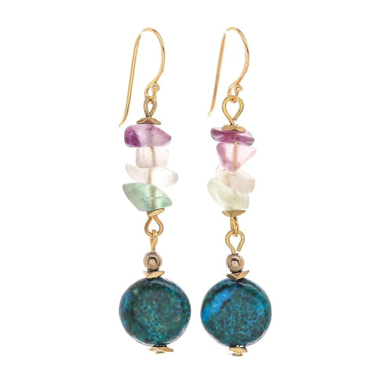 These Hand Made Gold-Plated Multi-Gemstone Dangle Earrings 'Venus Garden' by Tipa are lovely dangle earrings to wear for a celebration. A deep green serpentine orb hangs from a row of multi-hued fluorite chips, while shining hematite beads make pretty accents. The earrings are finished with 24k gold-plated 925 sterling silver hooks. His designs emphasize elegance and versatility.
