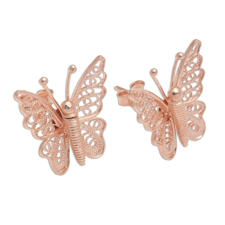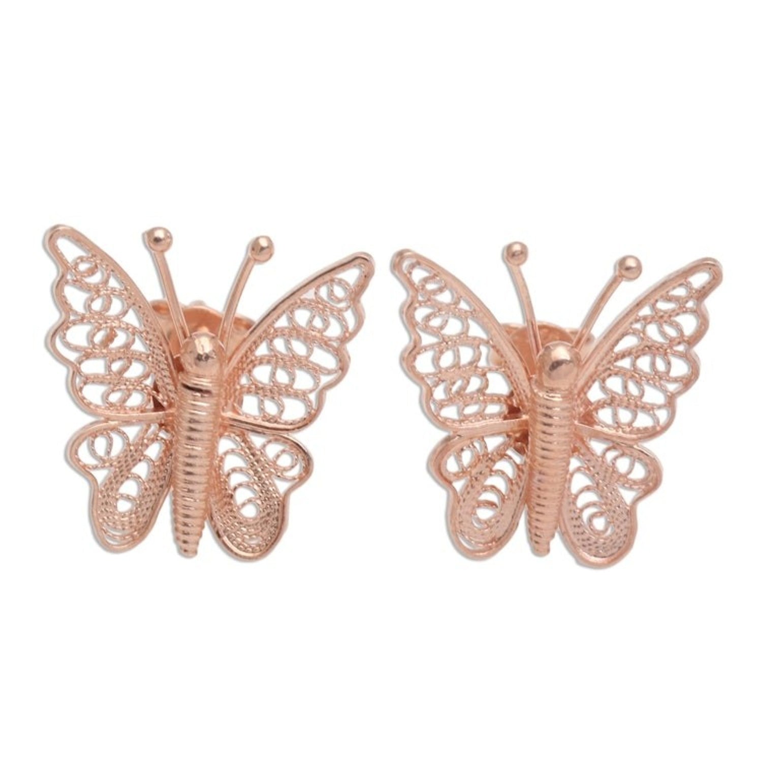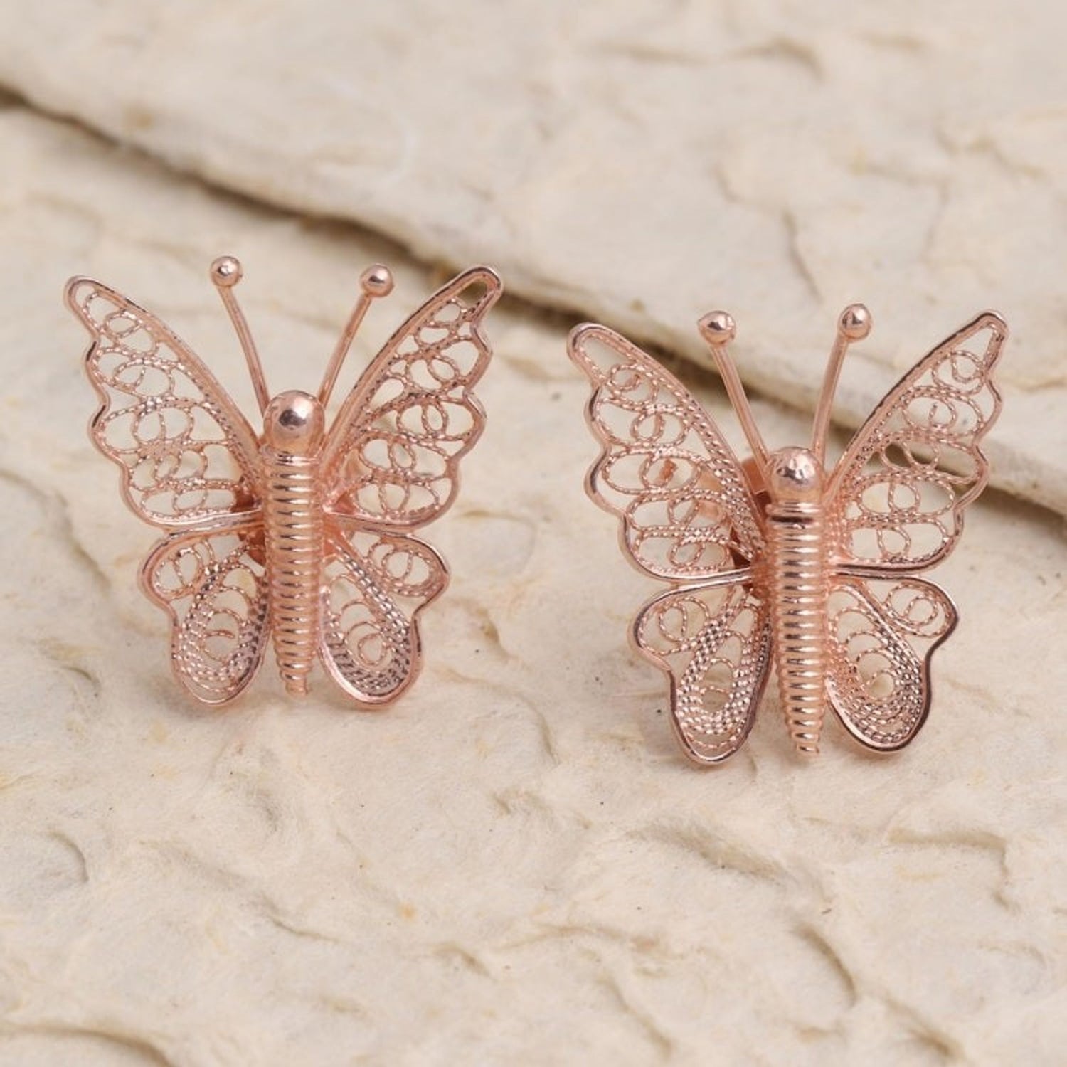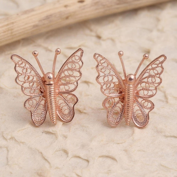 These Hand Made Rose Gold Plated Butterfly Button Earrings 'Bright Butterflies' by Yuniati are pretty button earrings with two butterflies fluttering breezily. Crafted from 18k rose gold-plated sterling silver, the wings feature fine filigree work with a combination finish. For her, jewelry-making is a way to carry forward her ancestors' legacy.