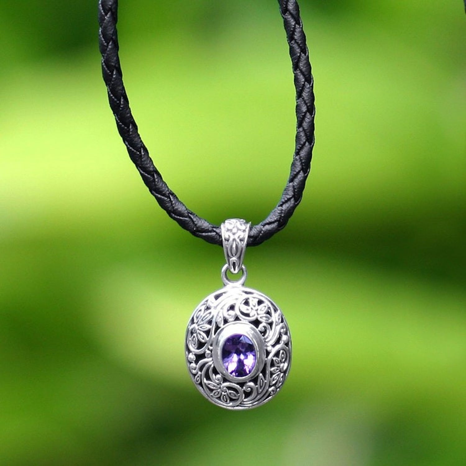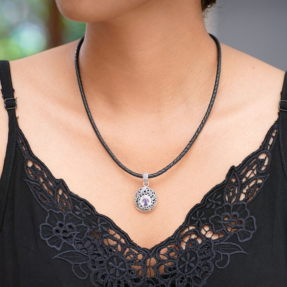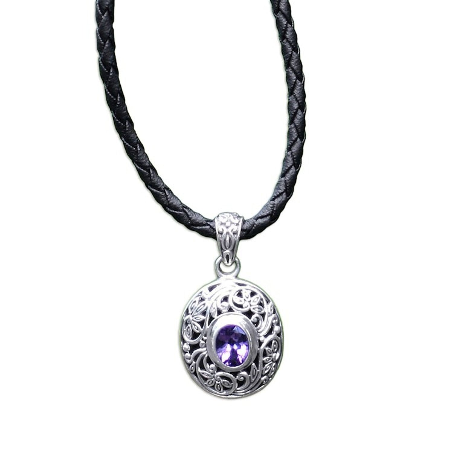 Handcrafted in sterling silver, leather, and amethyst with a combination finish, this necklace weighs 0.34 oz. The necklace is 18 inches L and 0.1 inches W, with a spring ring clasp. The pendant measures 1.4 inches L x 0.7 inches W.
