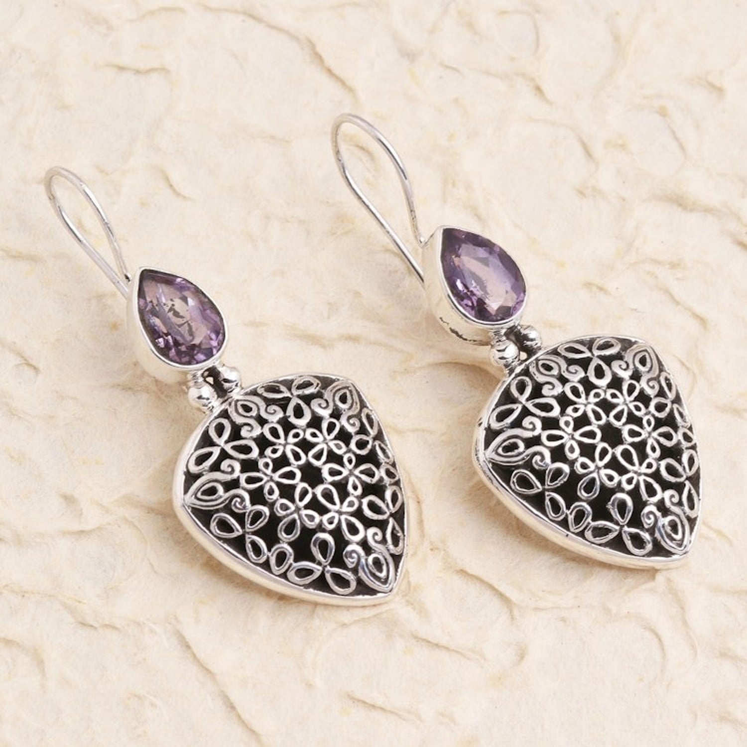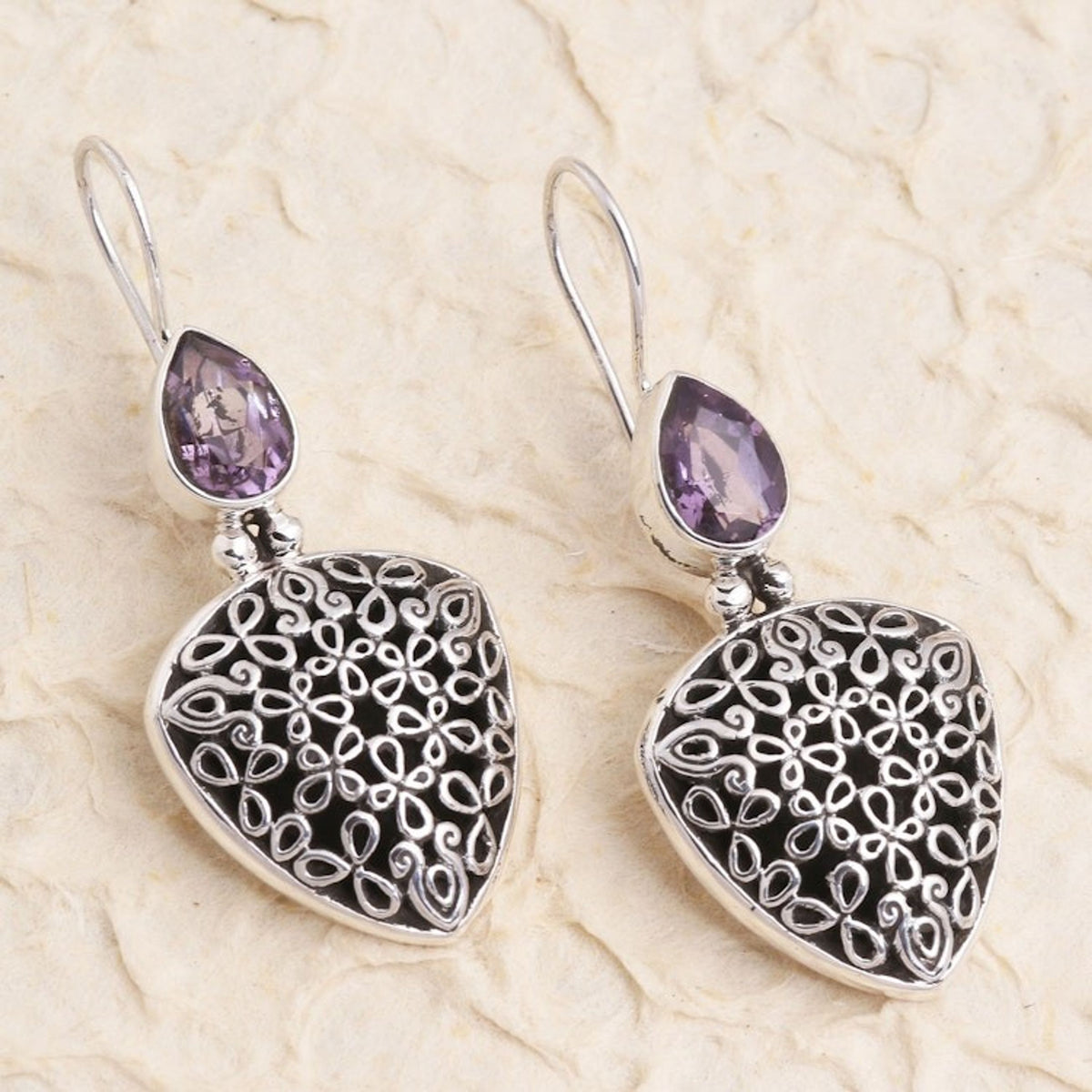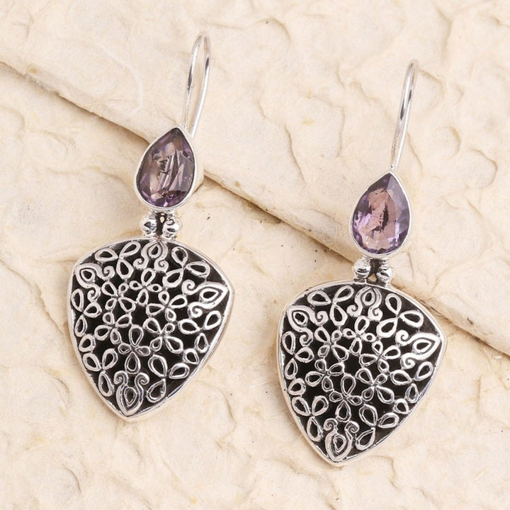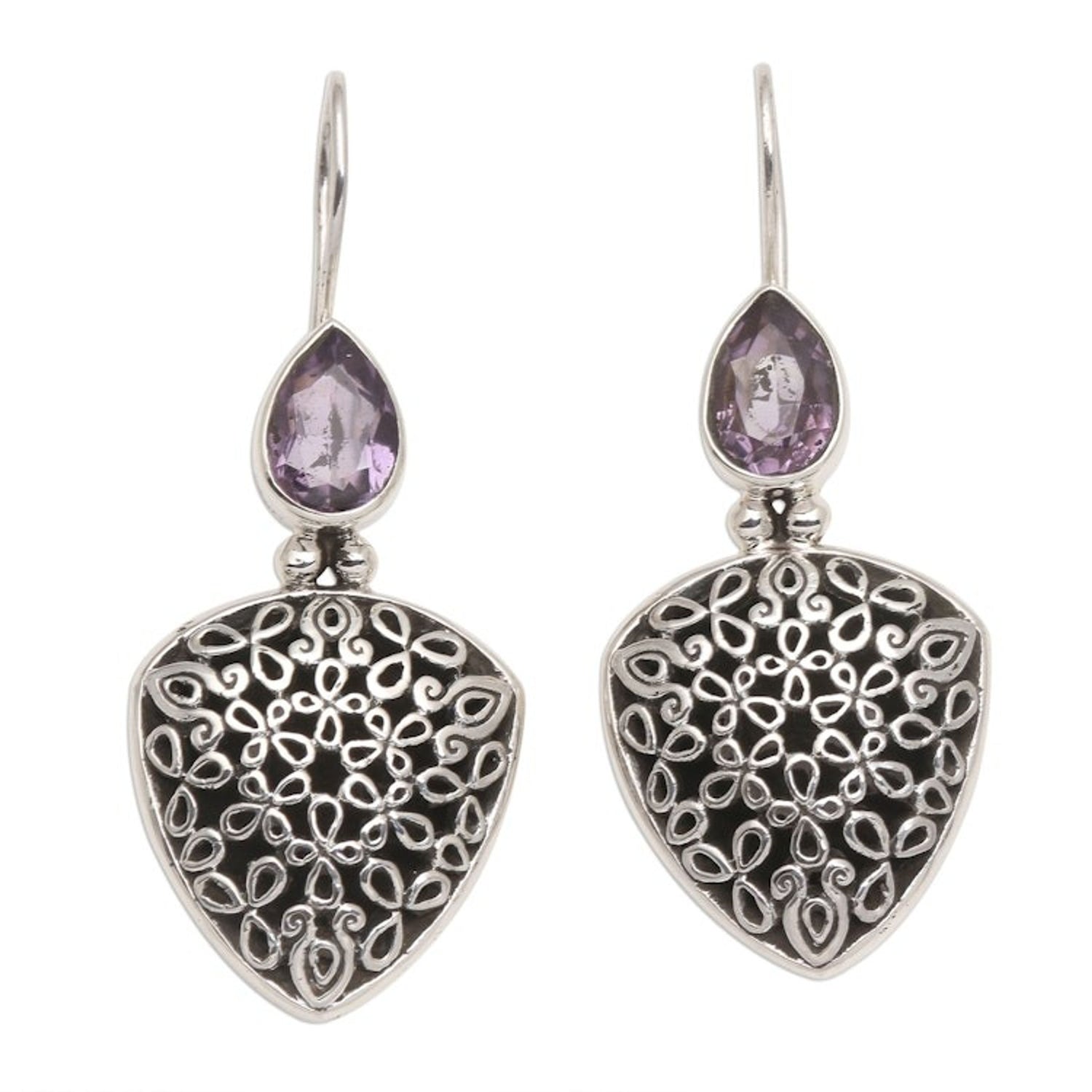 These Hand Made Sterling Silver Amethyst Drop Earrings 'Fly Away' by Yuniati are a lovely pair of drop earrings with pear-shaped amethyst stones in bezel settings. Hand crafted from sterling silver, the earrings feature intricate designs with a combination finish. Her jewelry-making is a testament to dedication, cultural pride, and creative passion.