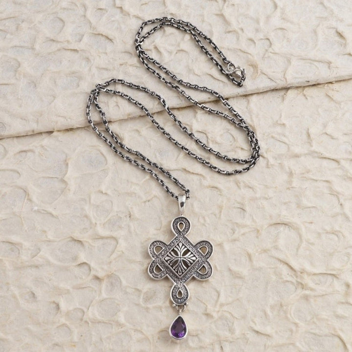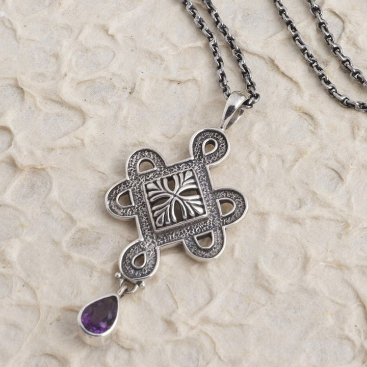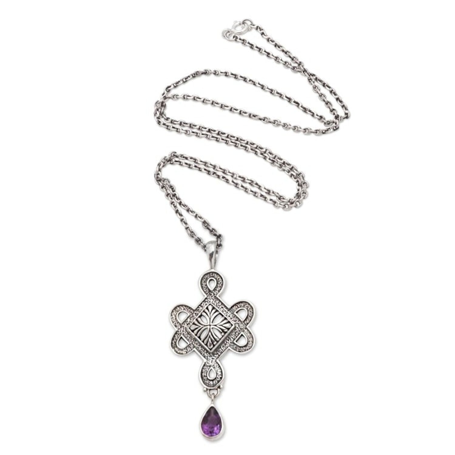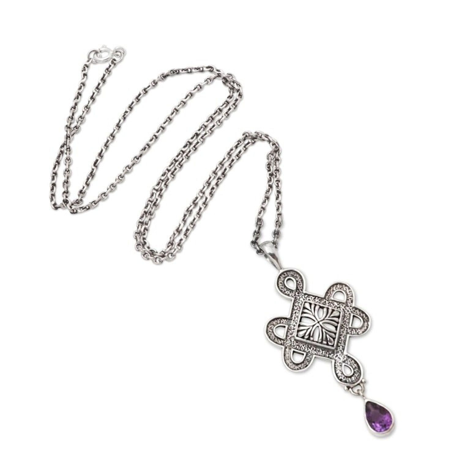 This Hand Made Sterling Silver Amethyst Pendant Necklace 'Ocean Blaze' by Yuniati is a fetching necklace with a single pear-shaped amethyst gemstone in a bezel setting swinging from a decorative silver pendant. Crafted from sterling silver, it's completed with a cable chain and combination finish. She works to balance traditional motifs with modern appeal.