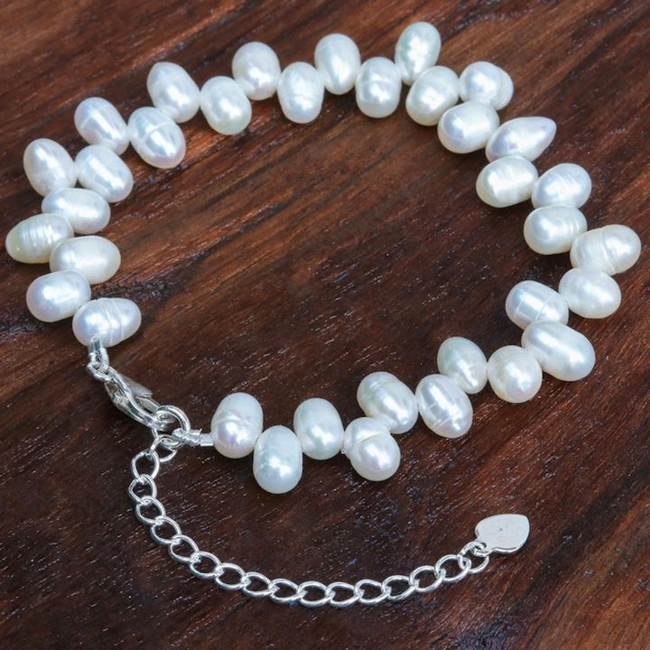 This Hand Made Sterling Silver and Cultured Pearl Bracelet 'Sea Breath in White' by Srimuang is a lovely bracelet with a row of glowing pearls that says classic taste. The artisan hand strings naturally white cultured freshwater pearls in an alternating pattern, while a sterling silver lobster clasp and extender chain finish the bracelet in style. Happiness is found in steady work, family bonds, and the joy of crafting jewelry.