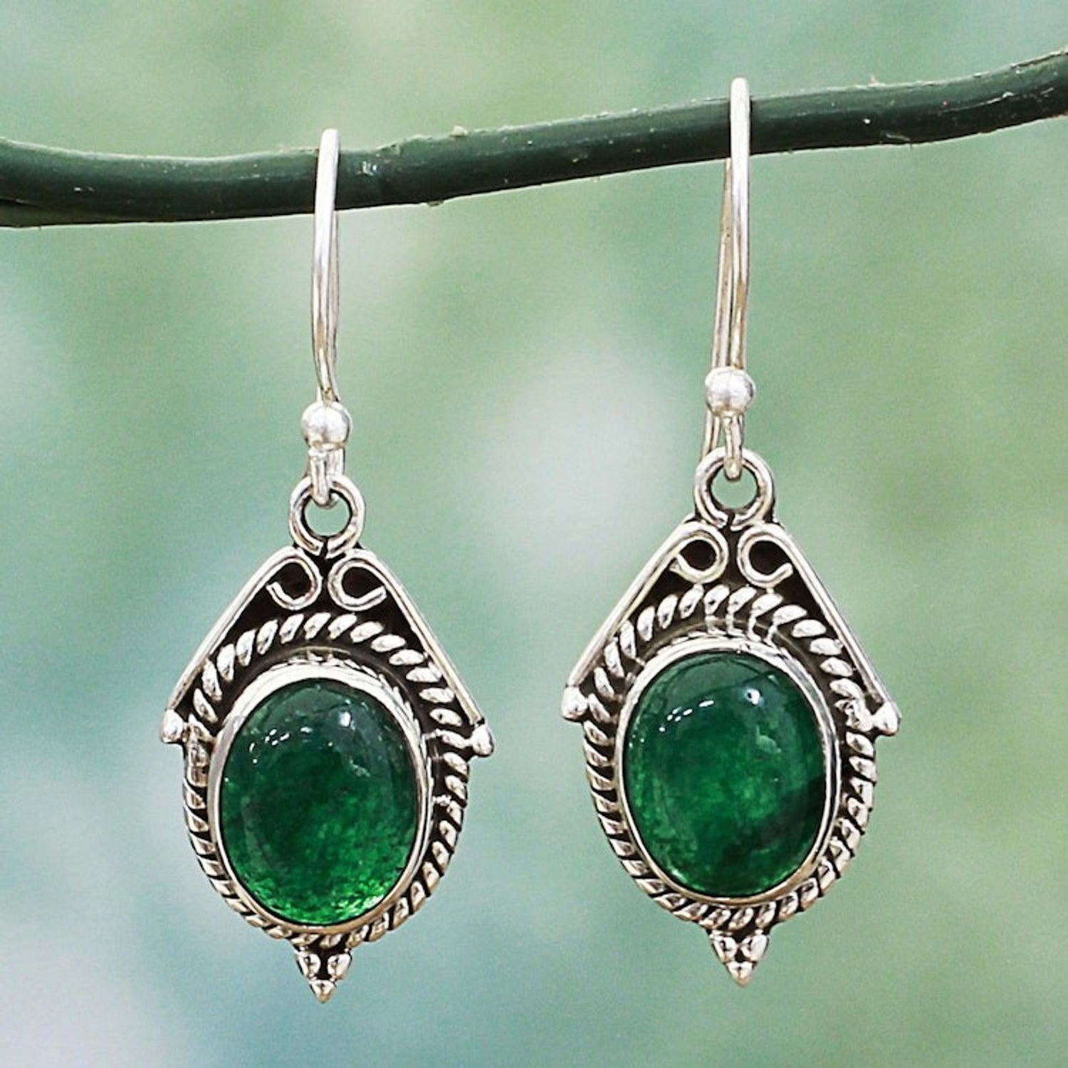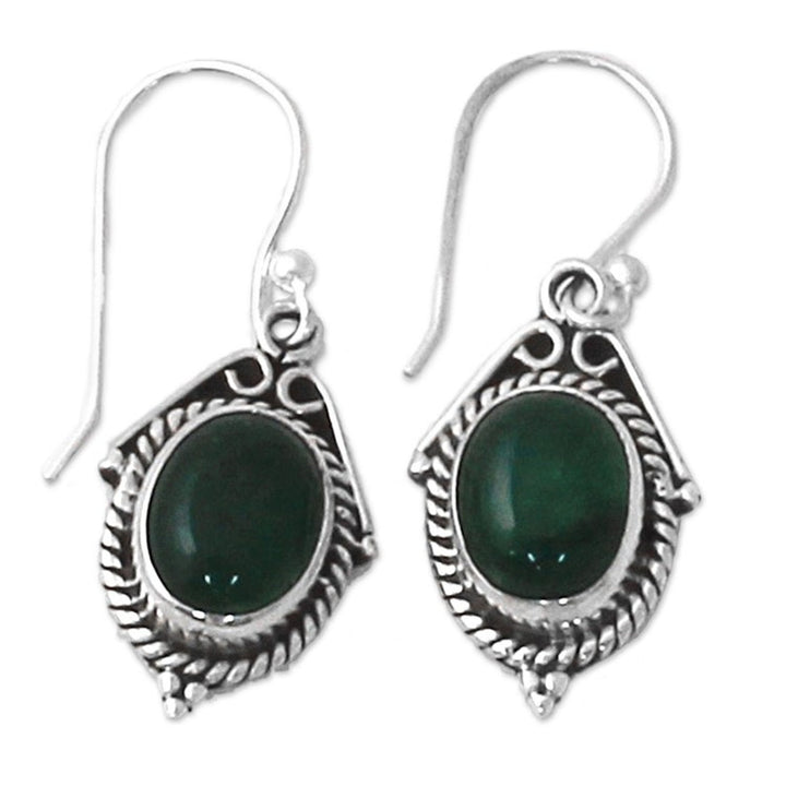 Hand Made Sterling Silver Green Onyx Dangle Earrings India 'Charming Green'
