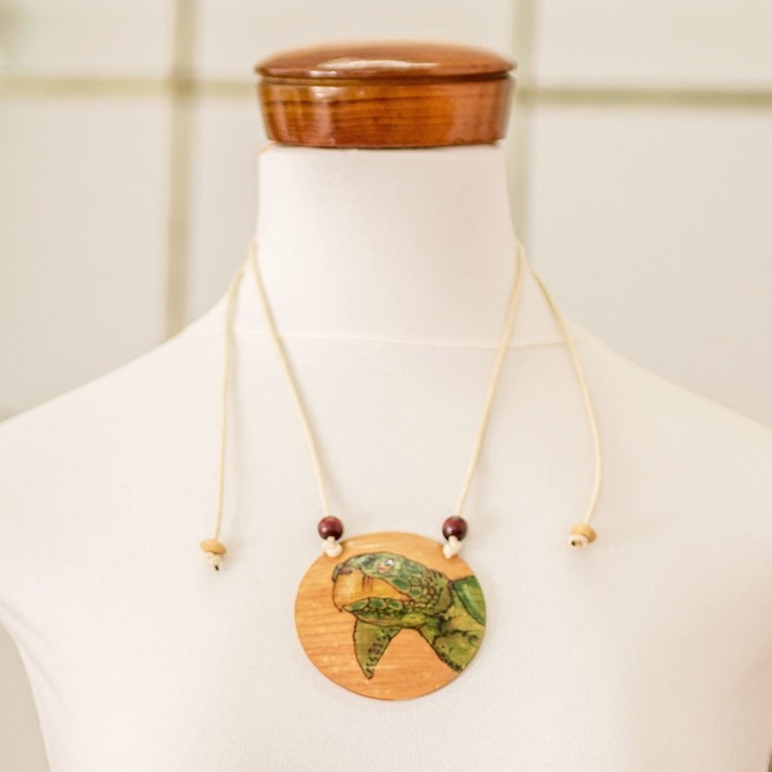 Handcrafted from calabash gourd, pinewood beads, and a polyester cord chain. The pendant measures 2.8 inches long x 2.7 inches wide x 0.1 inches deep. The adjustable cord is 16.5 inches to 34 inches long and 2 mm wide. Due to its handcrafted nature, color, size, and/or motif may vary slightly.