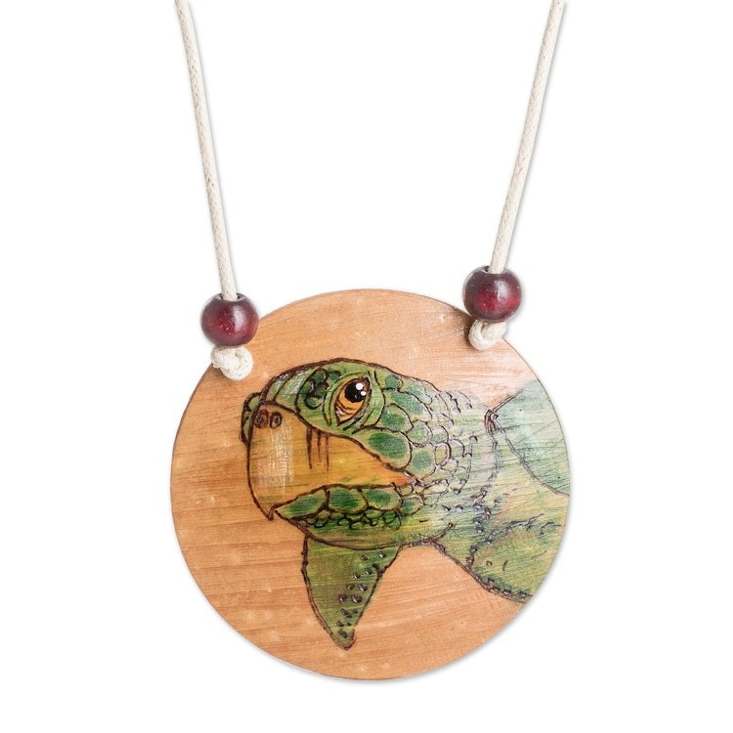 This 'Wisdom Portrayal' Calabash Gourd Sea Turtle Pendant Necklace by Independent Artisans is a majestic accessory that honors the beauty of Costa Rica's marine life. Artisan Ruth Guevara Vega has painted a magnificent sea turtle onto a lightweight calabash gourd, a symbol of wisdom and endurance. This necklace is an expression of the artist's love for nature's rustic beauty and her commitment to eco-friendly design. It's an ideal piece for those who appreciate the profound connection between art, nature, and symbolic meaning.