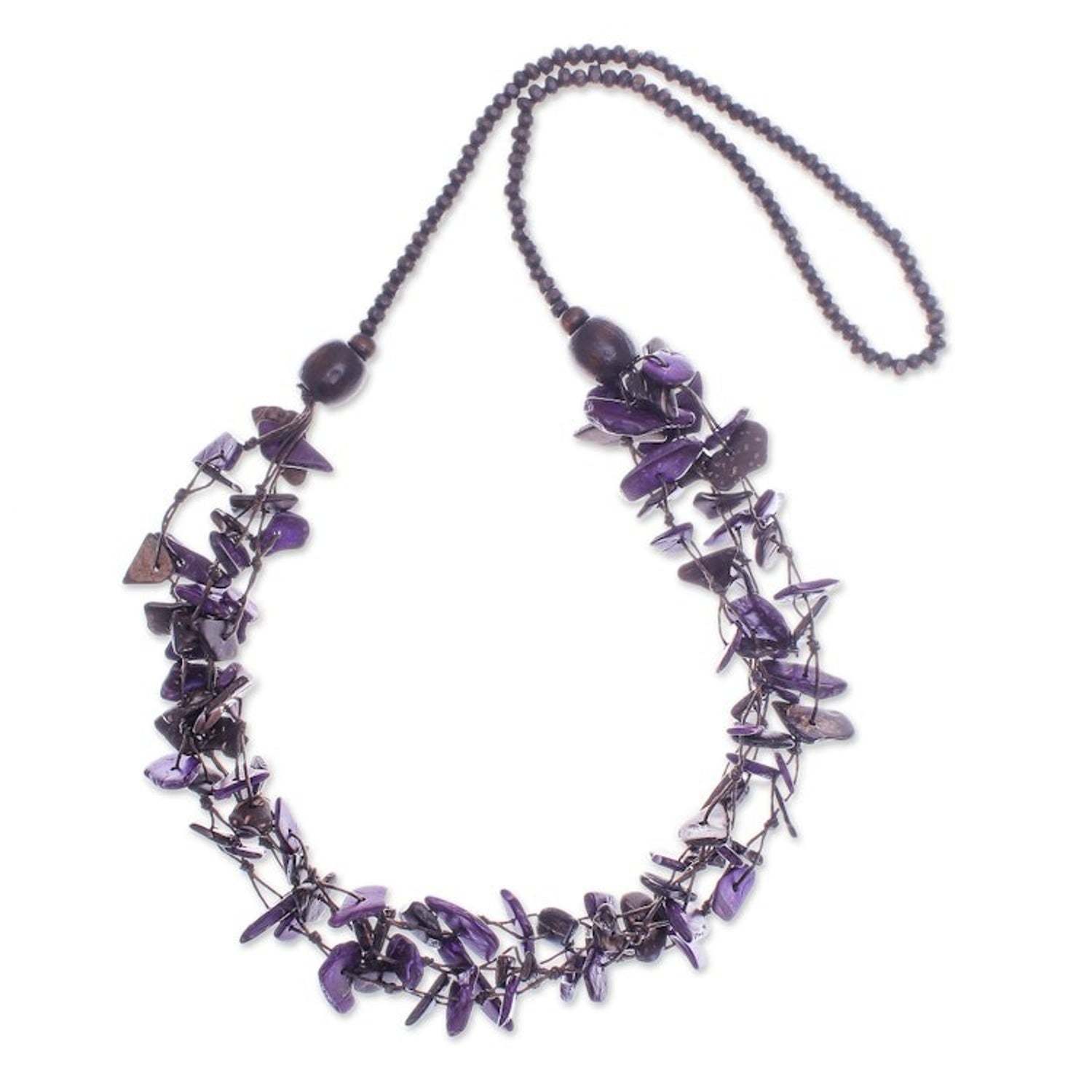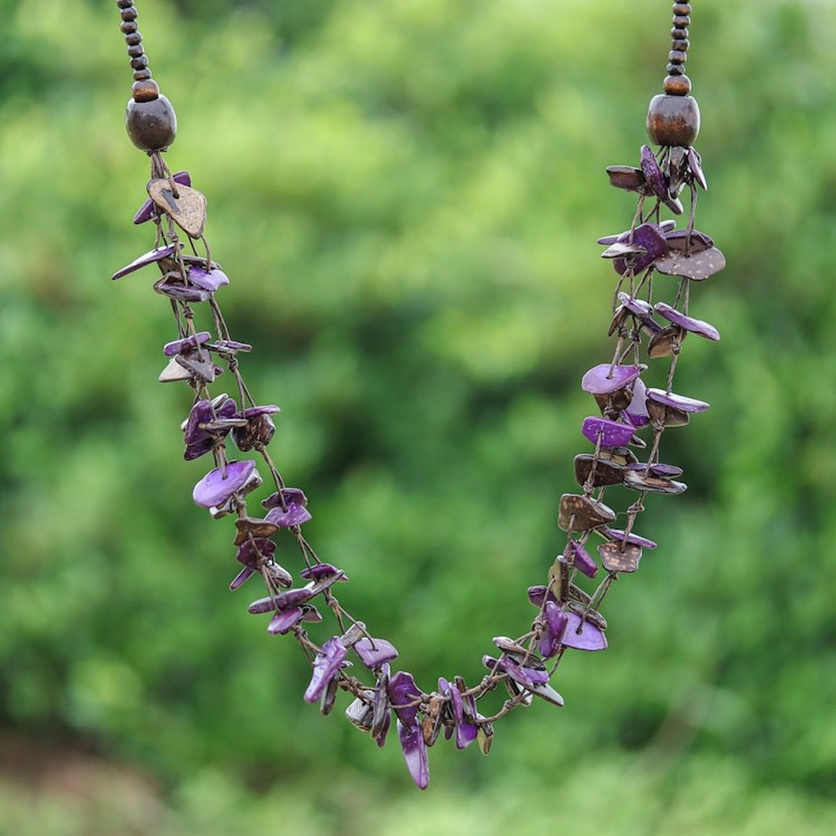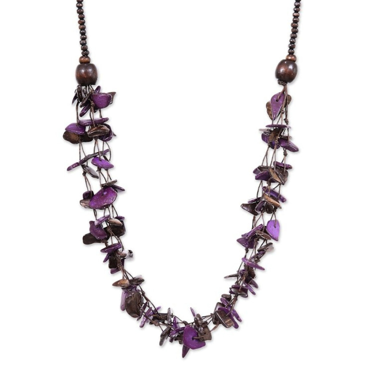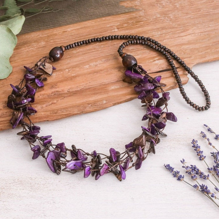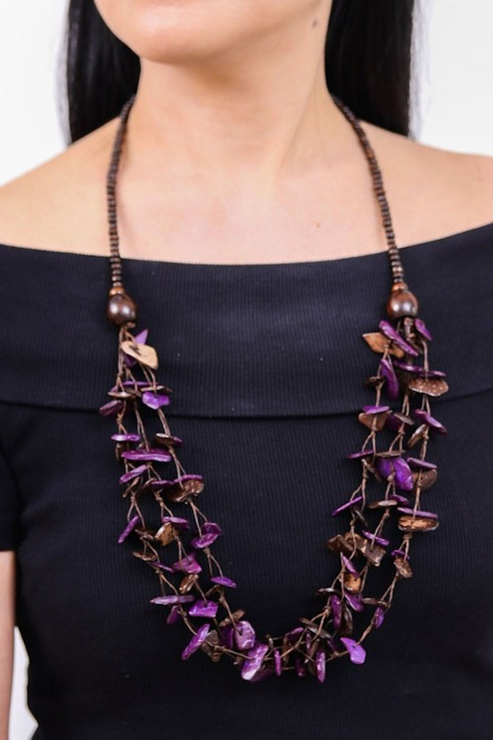 This Hand-Painted Purple and Brown Beaded Three-Strand Necklace by Independent Artisans is an enchanting piece that transforms humble materials into a magical work of art. The three-strand design features petite coconut shell pieces in purple and dark brown hues, complemented by little leaf wood beads. Inspired by the natural beauty of Thailand's flowers and textiles, this necklace embodies a rustic, bohemian elegance. It is a testament to the artisan's journey of turning simple beauty into a livelihood, celebrating both Thai craftsmanship and community empowerment.