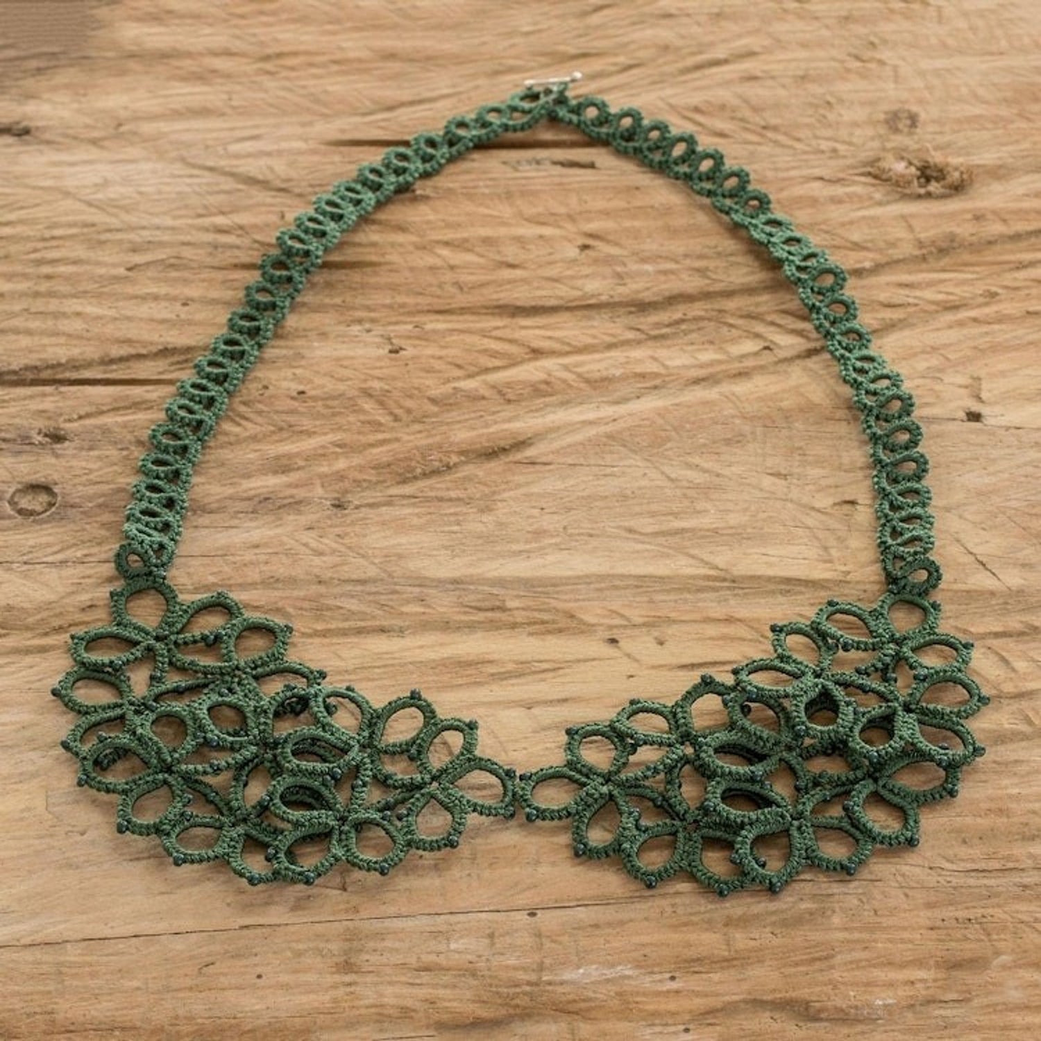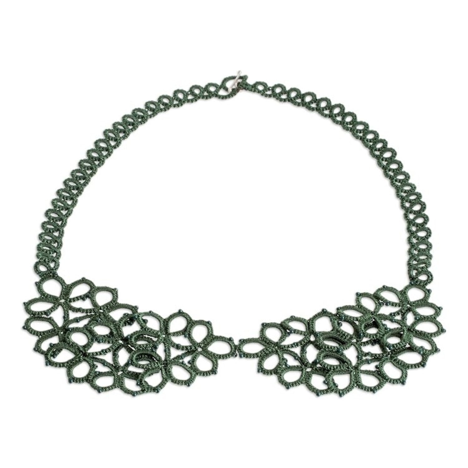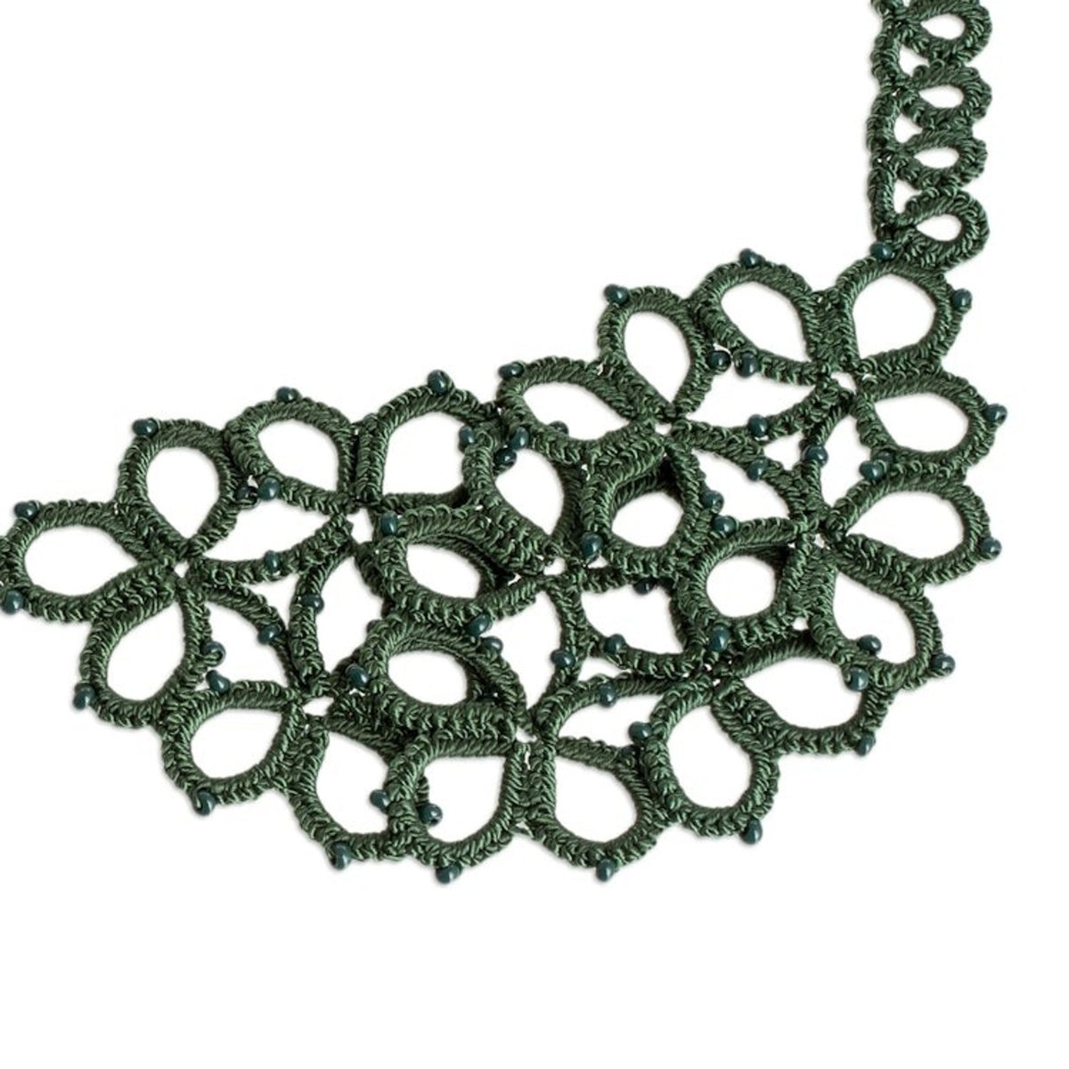 Hand-Tatted Green Statement Necklace with Glass Beads 'Green Breeze'