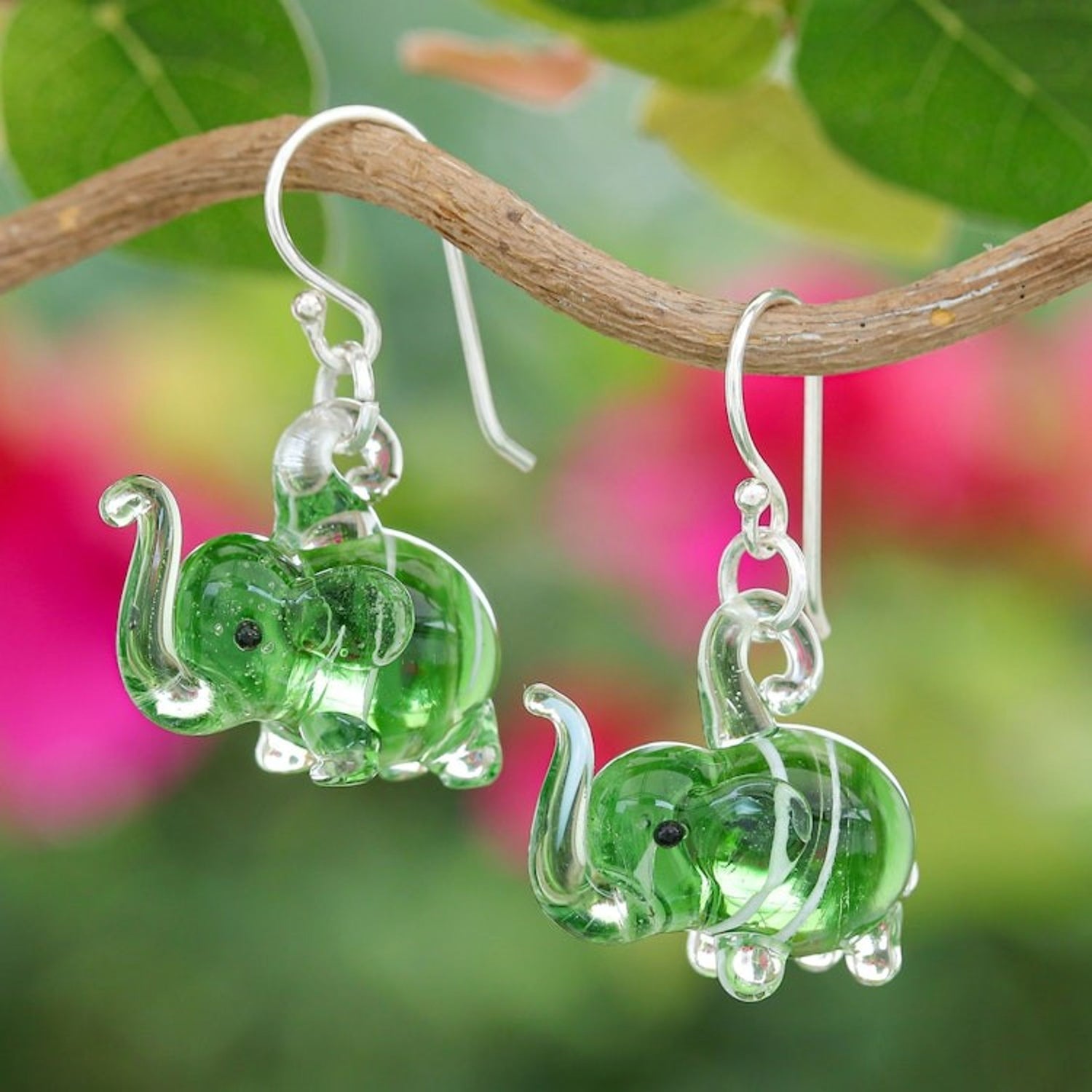 Handblown Striped Green Glass Elephant Dangle Earrings 'Elephant Vitality'