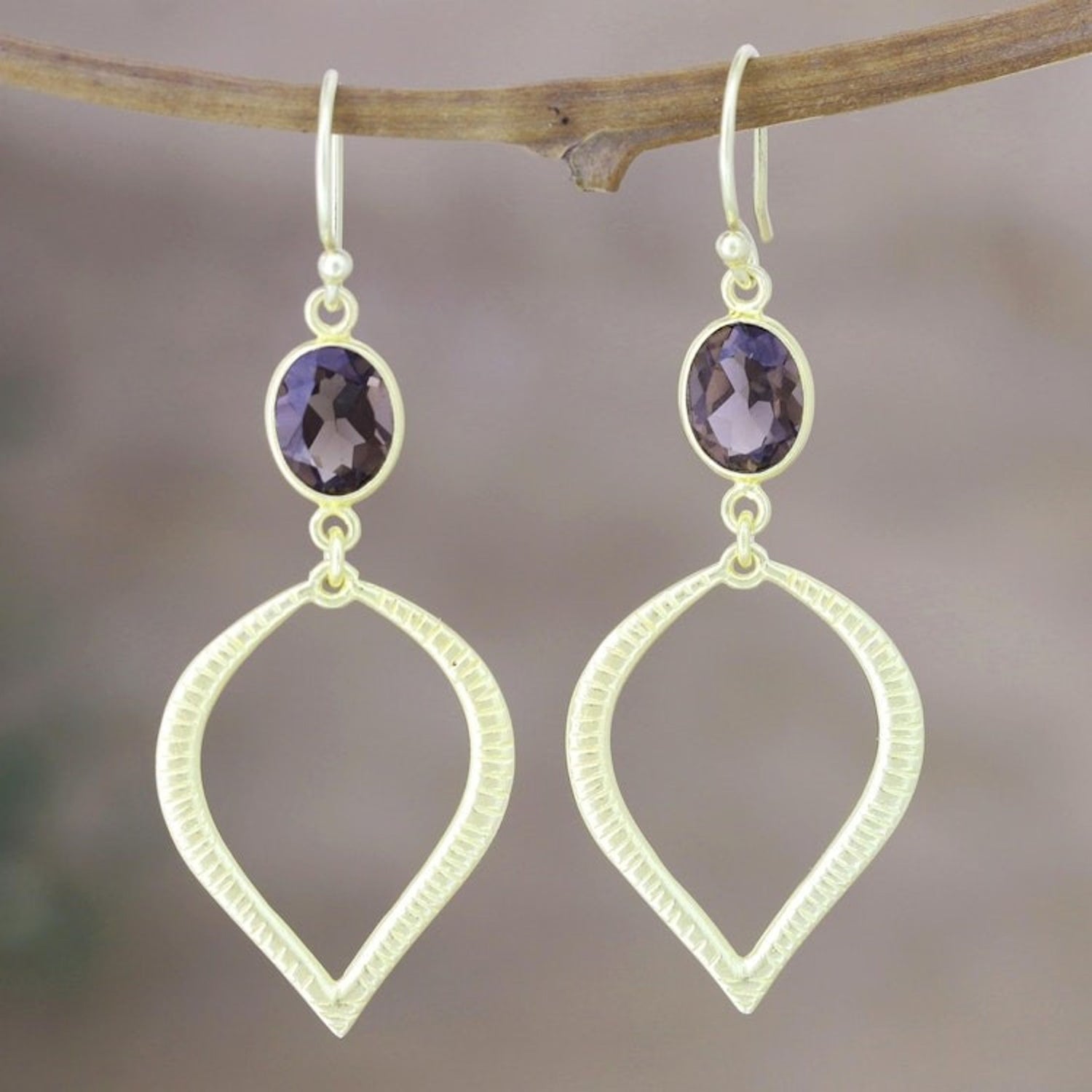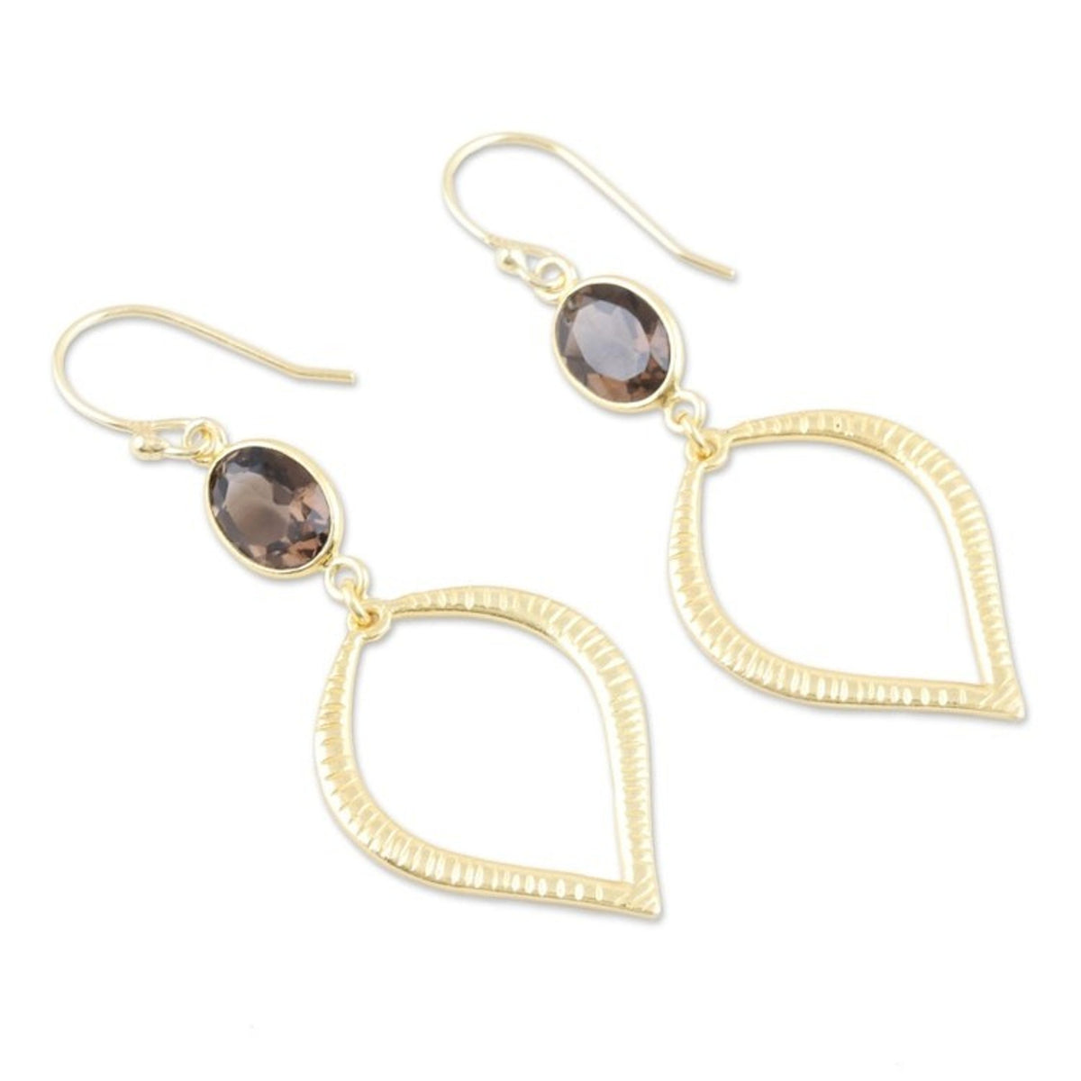These hook earrings are handcrafted in India from 22k gold-plated .925 sterling silver and feature faceted smoky quartz stones totaling five carats. Each earring measures 2.2 inches L x 0.9 inches W x 0.1 inches D with a high-polish finish.
