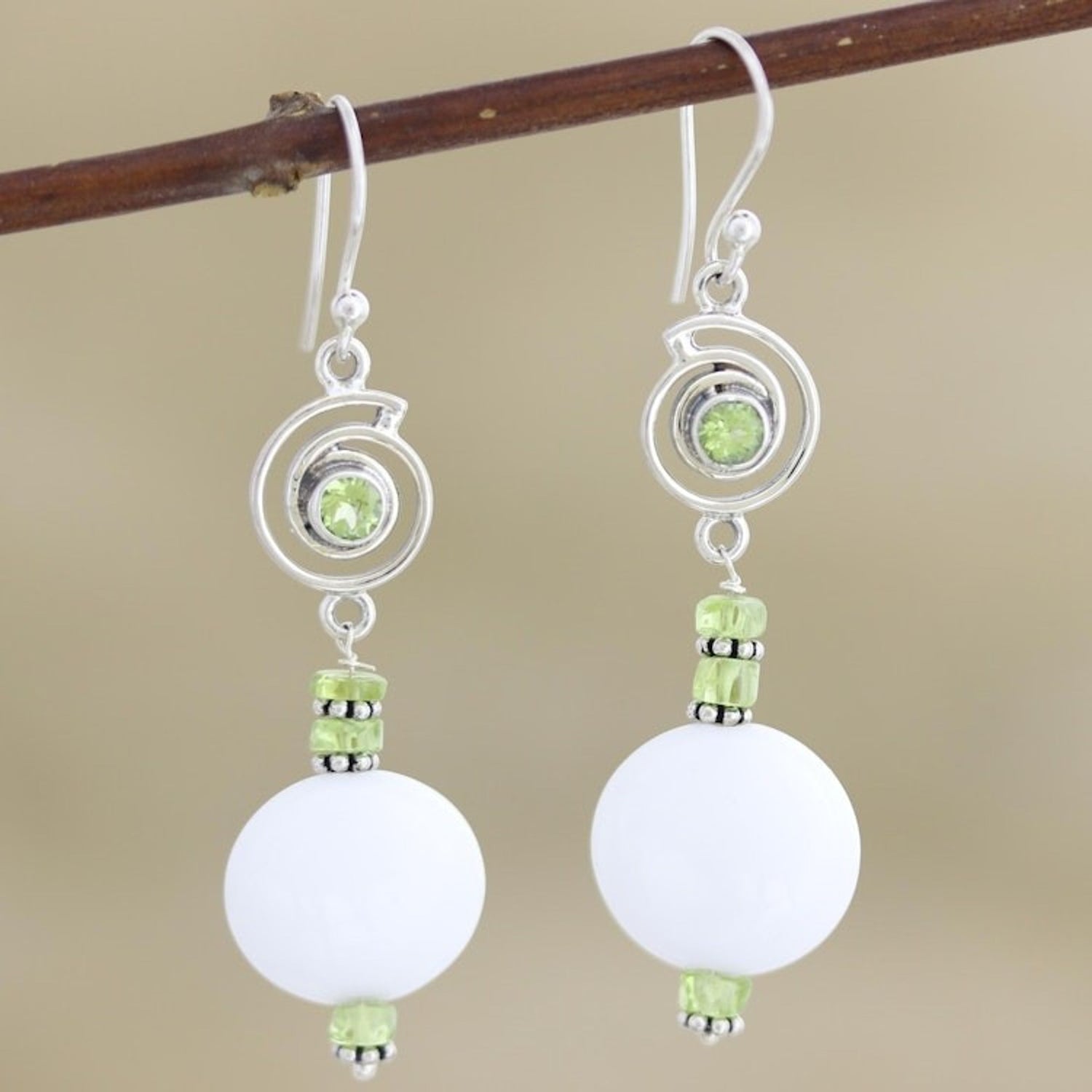 These Handcrafted Agate and Peridot Dangle Earrings from India by Independent Artisans offer a breath of fresh air, perfect for the first days of spring. The bright dangle earrings are a harmonious composition of sterling silver and vibrant gemstones. White agate globes hang from delicate sterling silver spirals, which are topped by peridot gemstones and beads. The design reflects the artisan's journey of discovering her passion later in life, celebrating the idea that it's never too late to embrace one's true calling. The combination finish adds a touch of rustic charm to this elegant piece.