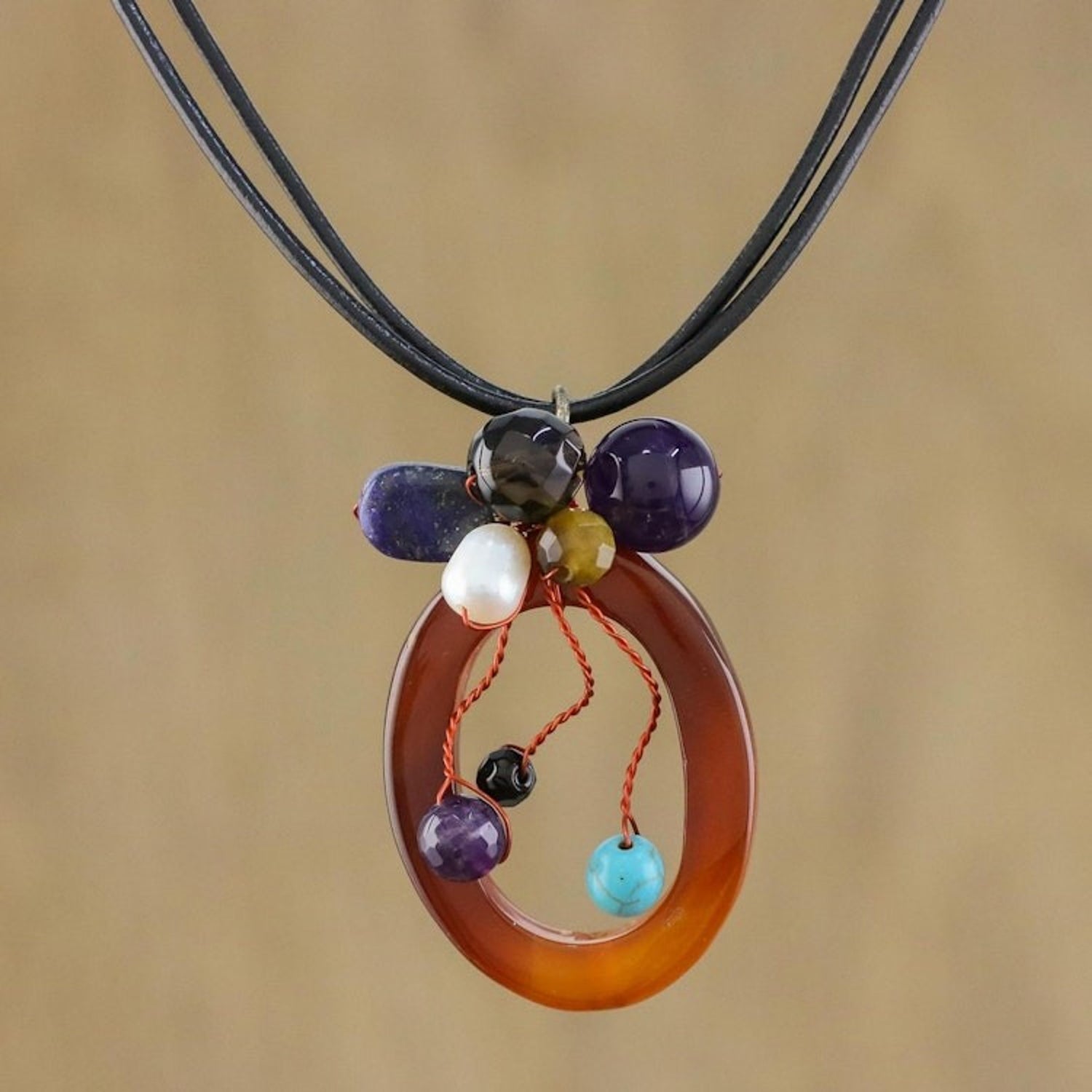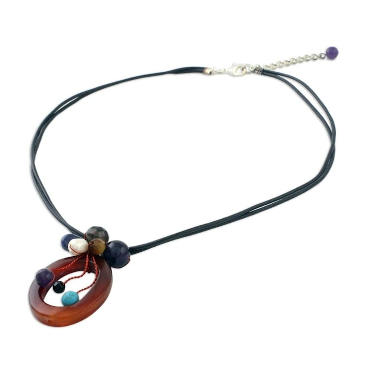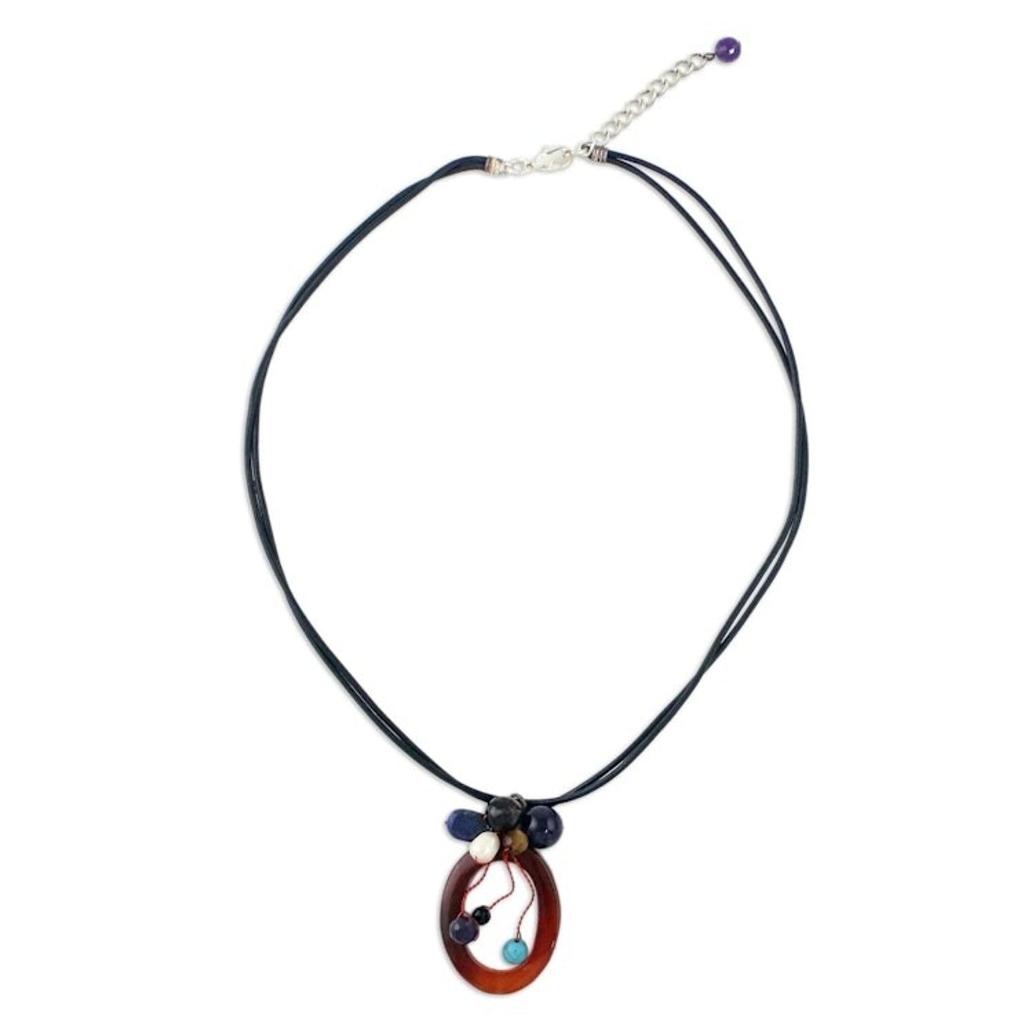 Handcrafted in Thailand, this necklace is made with black leather cords and copper wires, and features agate, lapis lazuli, smoky quartz, tiger's eye, freshwater pearl, dyed magnesite, and amethyst gemstones. It is secured with a silver-plated brass lobster claw clasp and extender chain. The necklace is adjustable from 17.8 to 20 inches in length, and the central pendant measures 2 inches L x 1 inch W x 0.4 inches D.