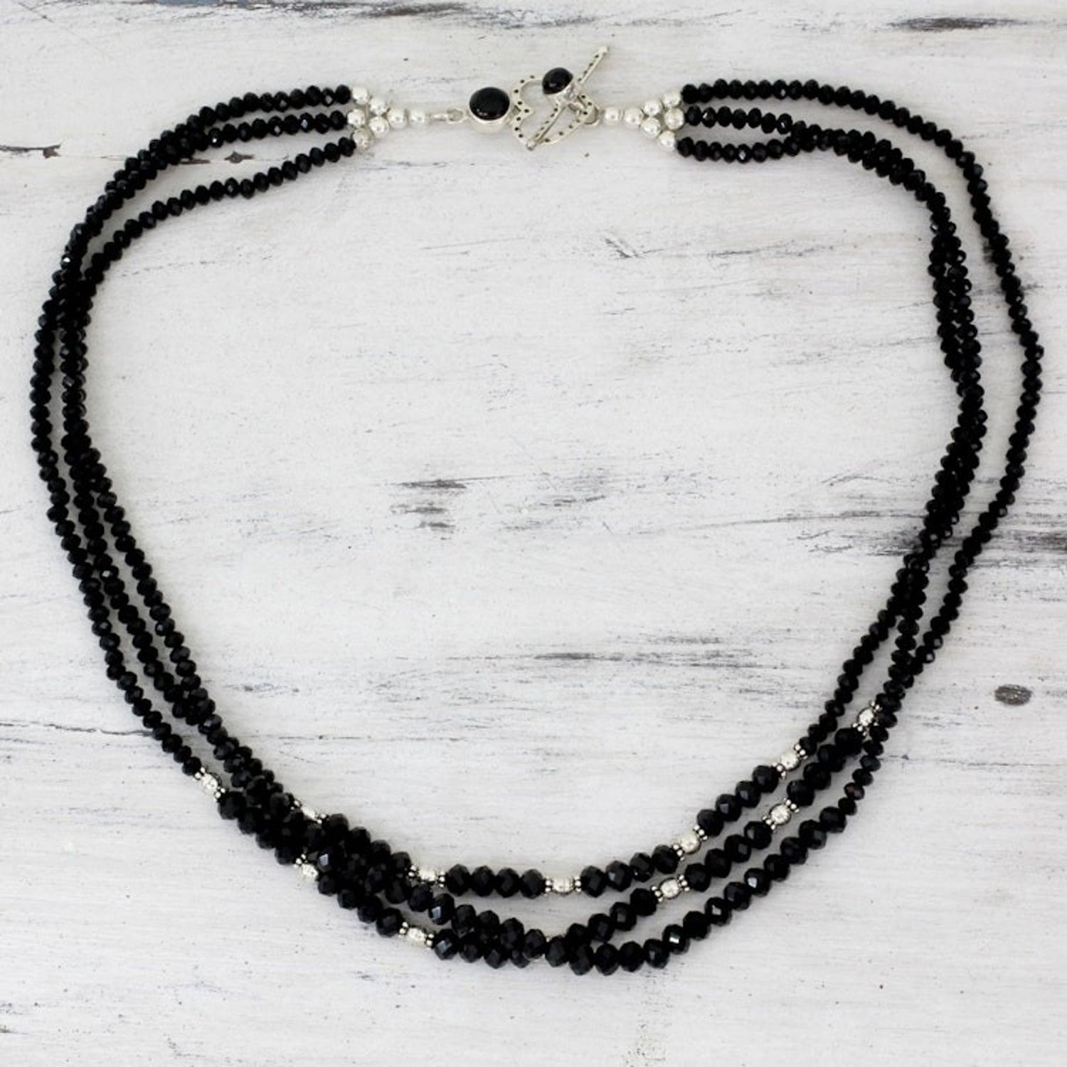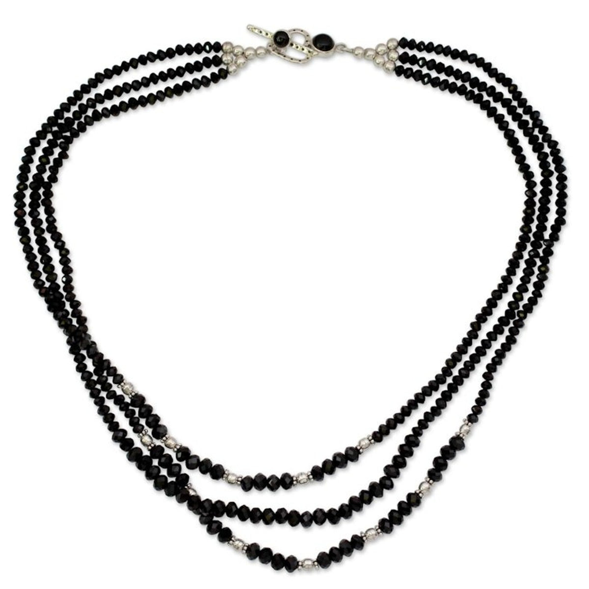 This Handcrafted Black Onyx Triple Strand Necklace 'Ebony Elegance' by Independent Artisans is a statement of refined grace and sophistication. Narayannii selects the classic elegance of black onyx for this design, which features three strands of faceted stones that encircle the neck. The ornate silver beads add a beautiful contrast, focusing attention on the natural beauty of the gemstones. This necklace reflects the artisan's innate elegance and her belief that it is never too late to uncover one’s true passions. It is a timeless piece that carries the intimate spirit of family, tradition, and artistry.