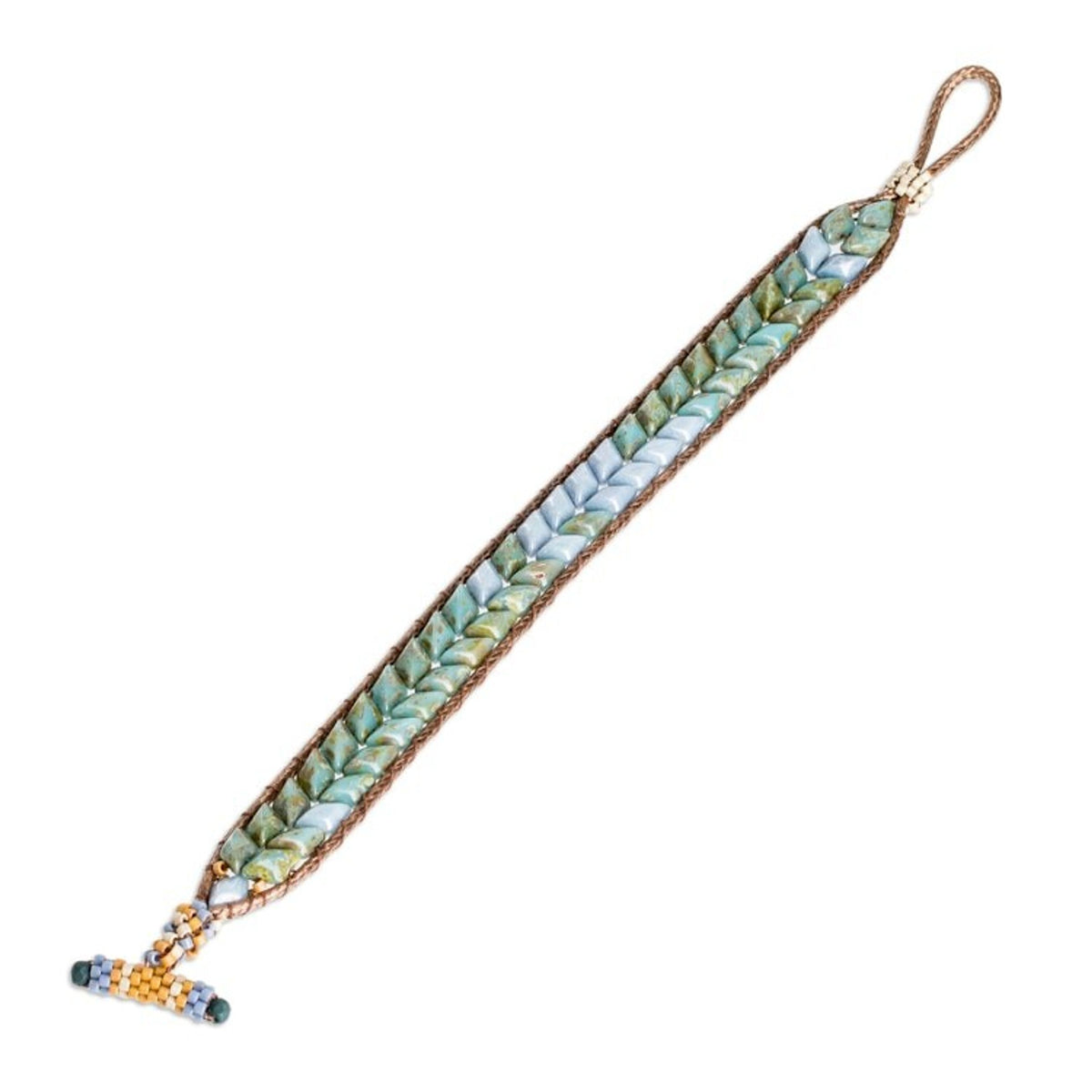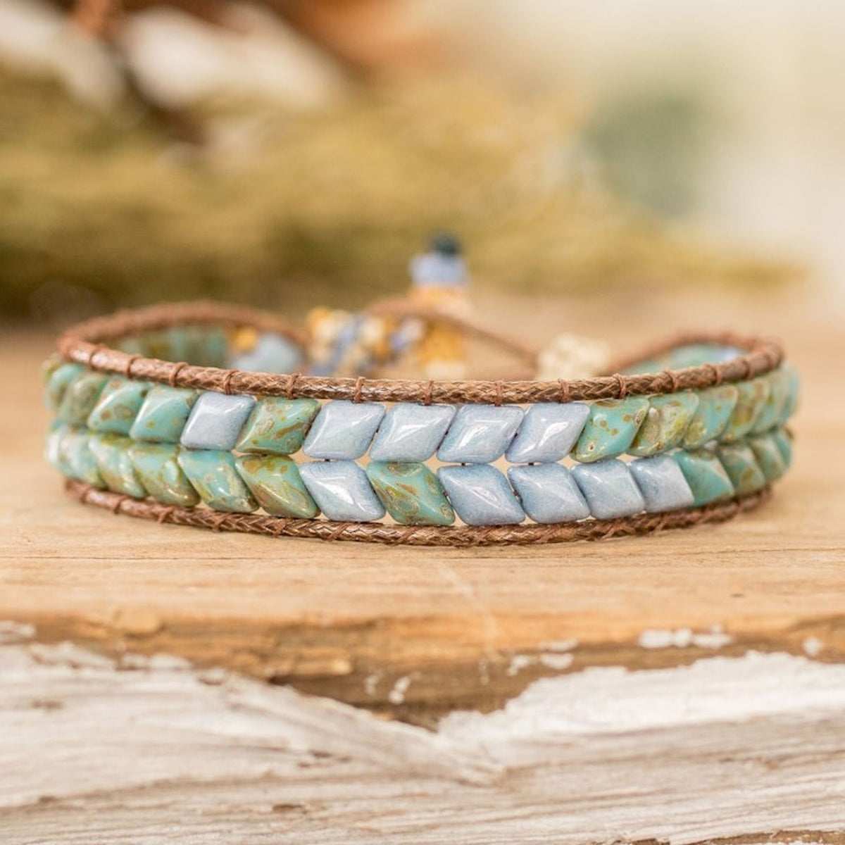 This Handcrafted Blue and Green Glass Beaded Wristband Bracelet 'Celestial Current' by Independent Artisans is a sublime piece that evokes the ethereal rivers of Guatemala. Handwoven from waxed nylon cords, the bracelet features a gorgeous combination of diamond-shaped glass beads in blue and green hues, symbolizing the colors of Guatemalan waters. The design is a beautiful display of natural beauty and cultural heritage, reflecting the artisan's journey of resilience and love for color. It is equipped with a toggle clasp adorned with a mosaic-inspired pattern, adding a unique and artistic touch.