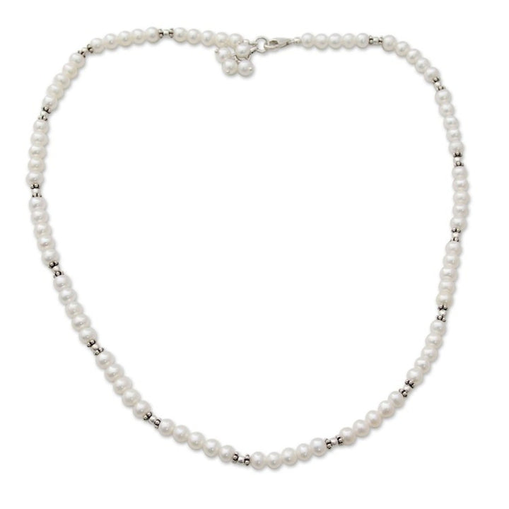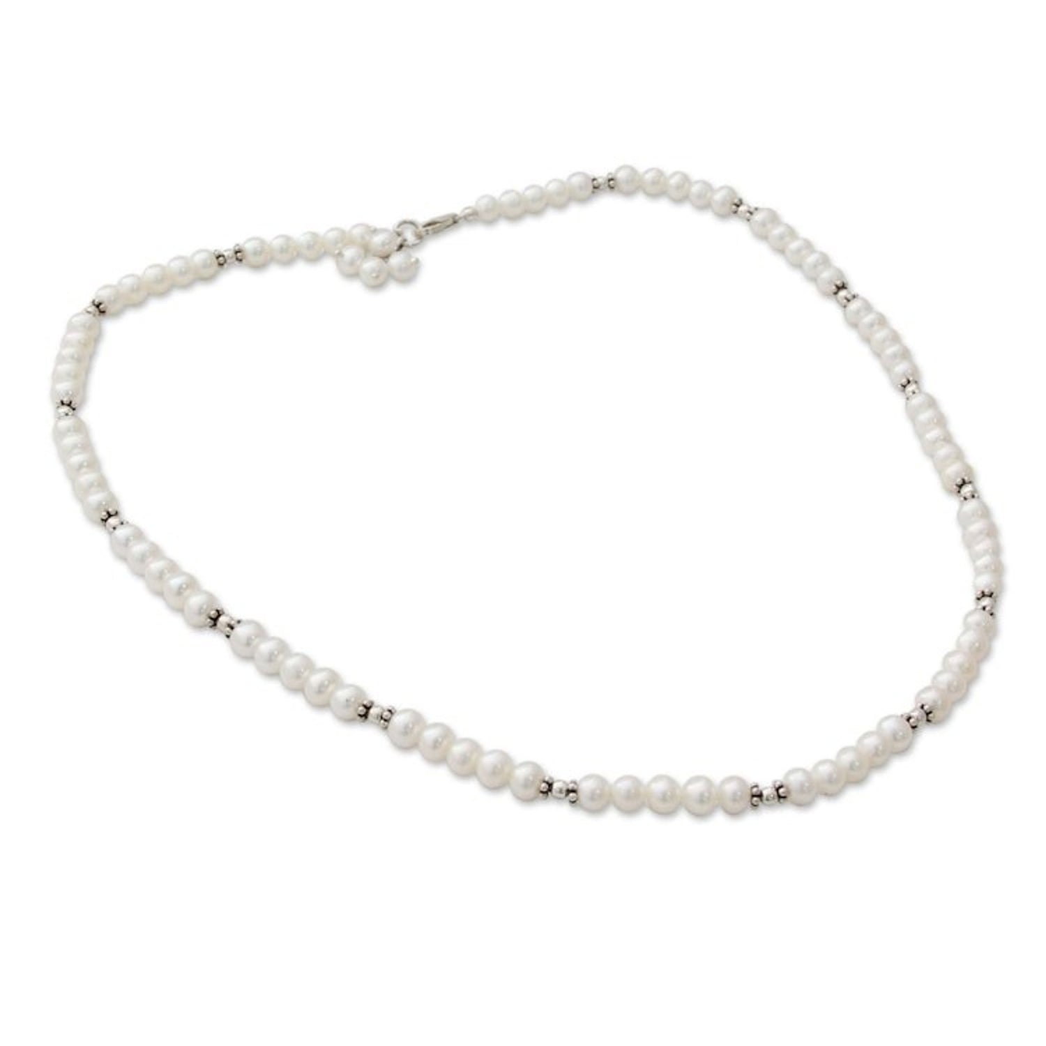 This necklace is handcrafted in India from sterling silver and freshwater pearls. It measures 19.8 inches in length.