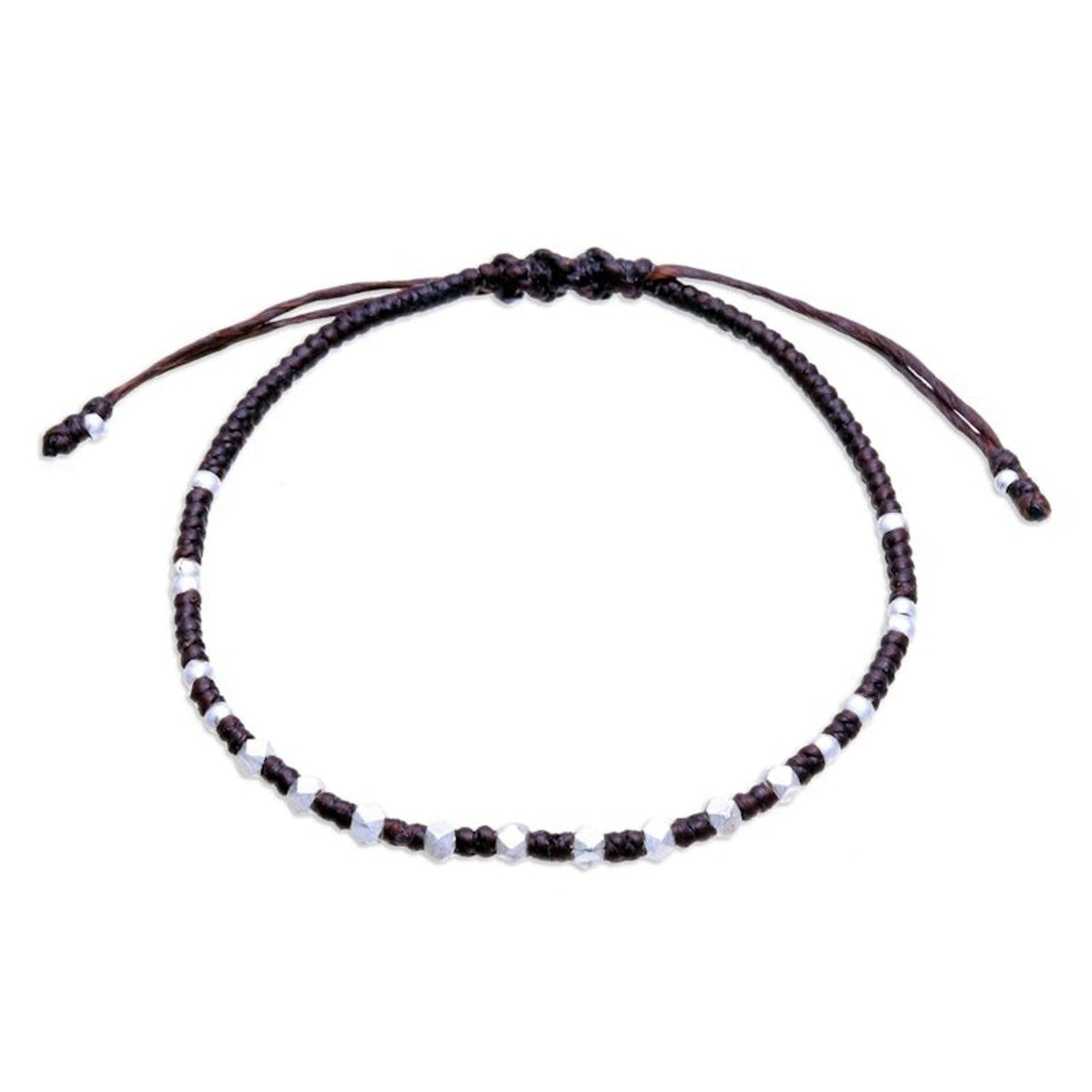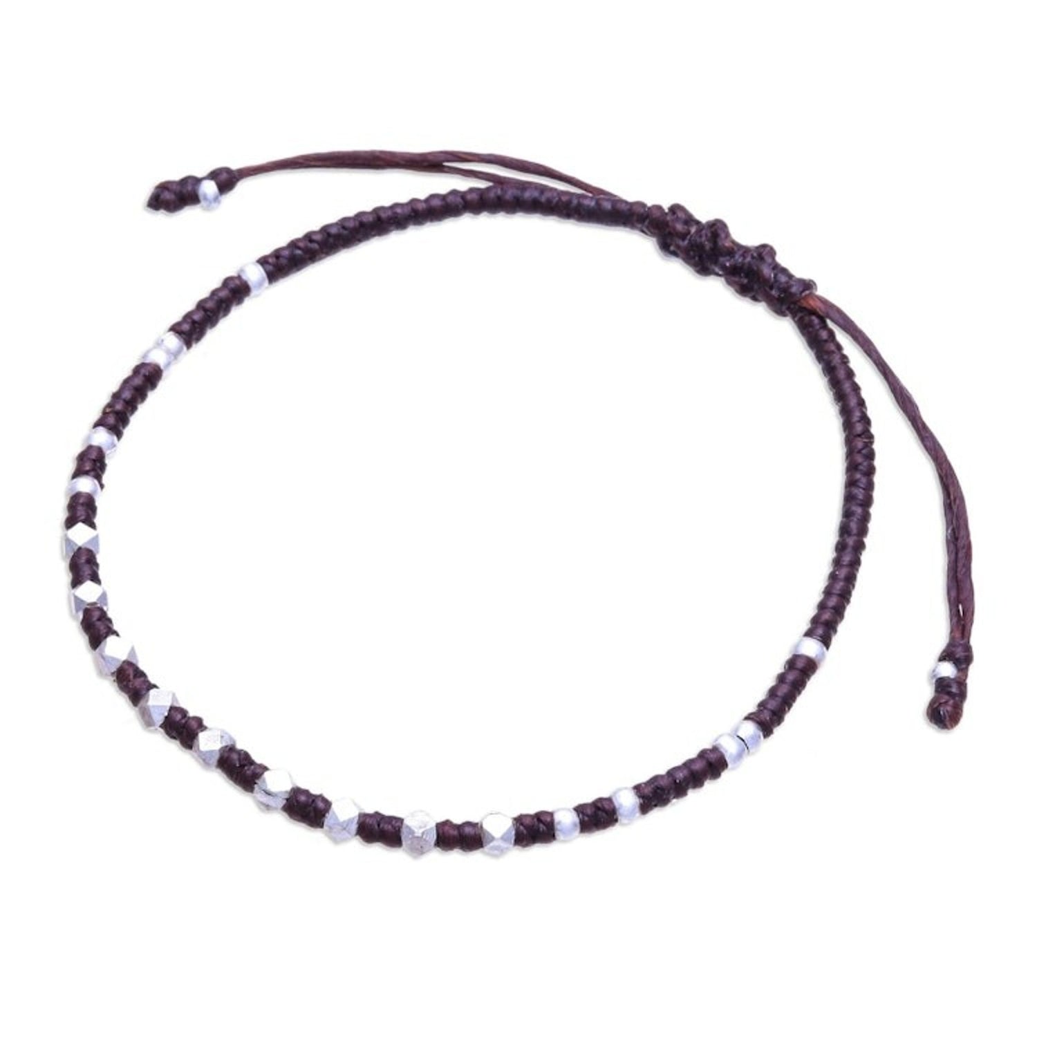 This Handcrafted Brown Adjustable Bracelet with Silver Beads 'Youthful Geometry' by Independent Artisans is a youthful design that adds an elegant aura to any style. Hand-braided with brown waxed polyester cord, the bracelet is embellished with geometric .950 silver beads. The sliding knot allows for easy length adjustment, making it a versatile and comfortable accessory. This piece showcases the artisan’s skill in preserving generational knowledge while creating beautifully crafted designs.