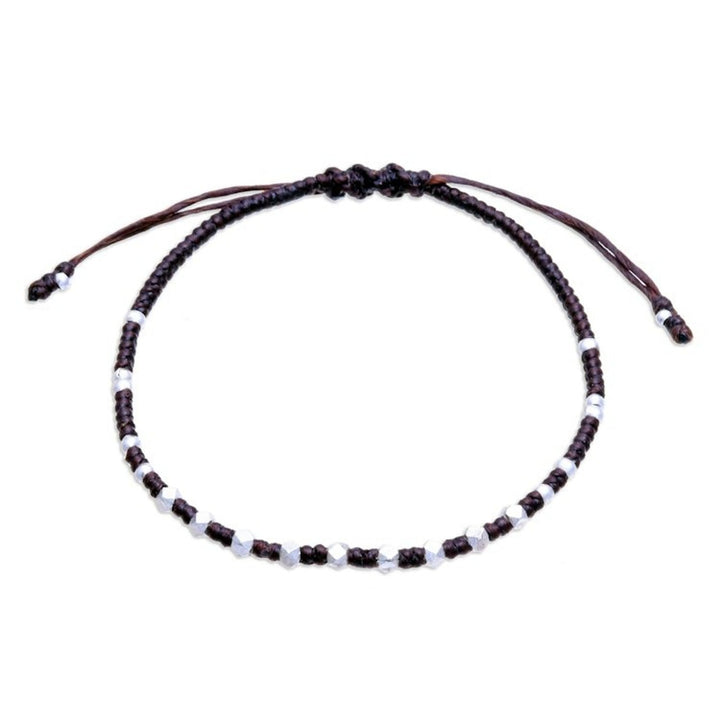 Handcrafted Brown Adjustable Bracelet with Silver Beads 'Youthful Geometry'