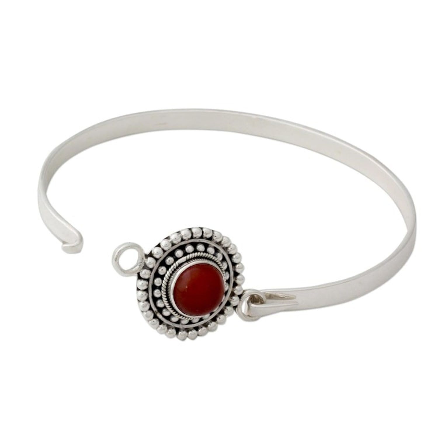 This bangle bracelet is handcrafted in India from .925 sterling silver and carnelian. It has a combination finish and a fishhook clasp. The inner circumference is 7.3 inches and the central medallion measures 1.2 inches L x 0.7 inches W x 0.3 inches D.