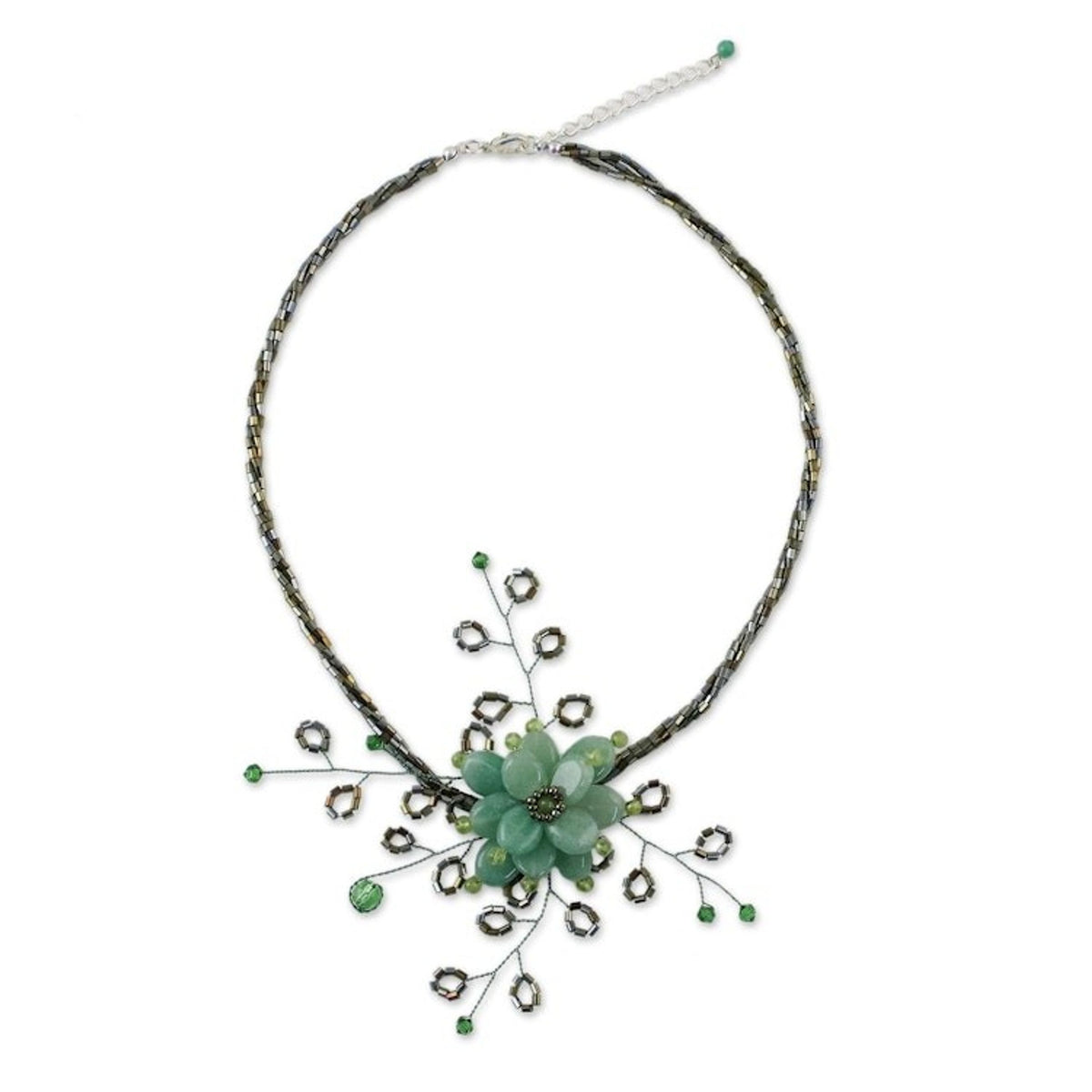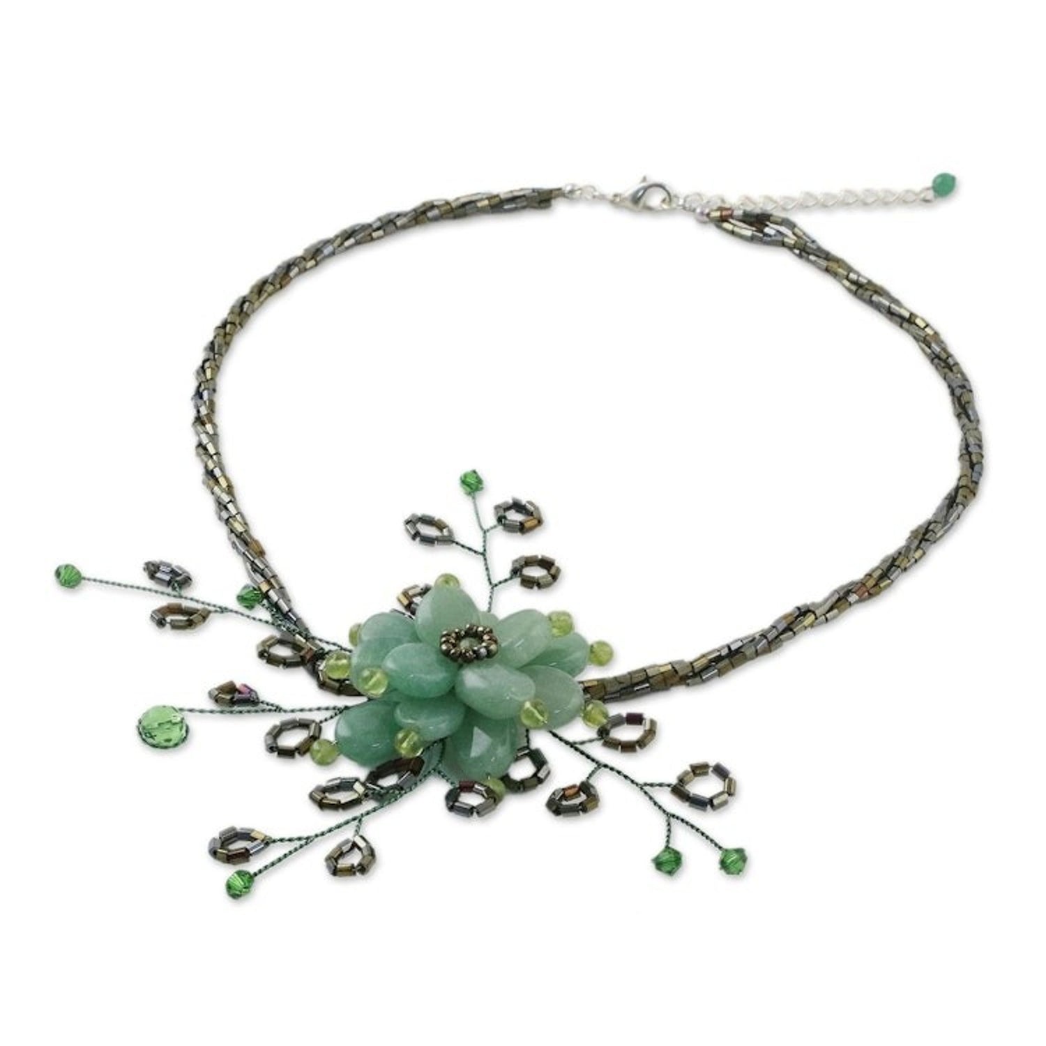 Handcrafted in Thailand with stainless steel, dyed quartzite, peridot, and glass, this necklace features a lobster claw clasp and is adjustable from 15.8 to 18 inches in length.