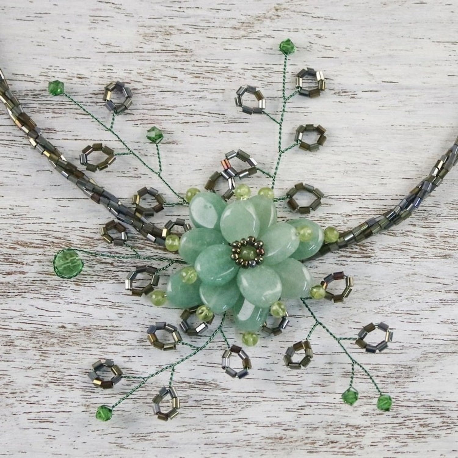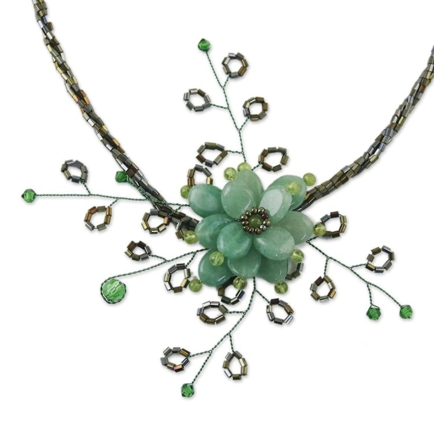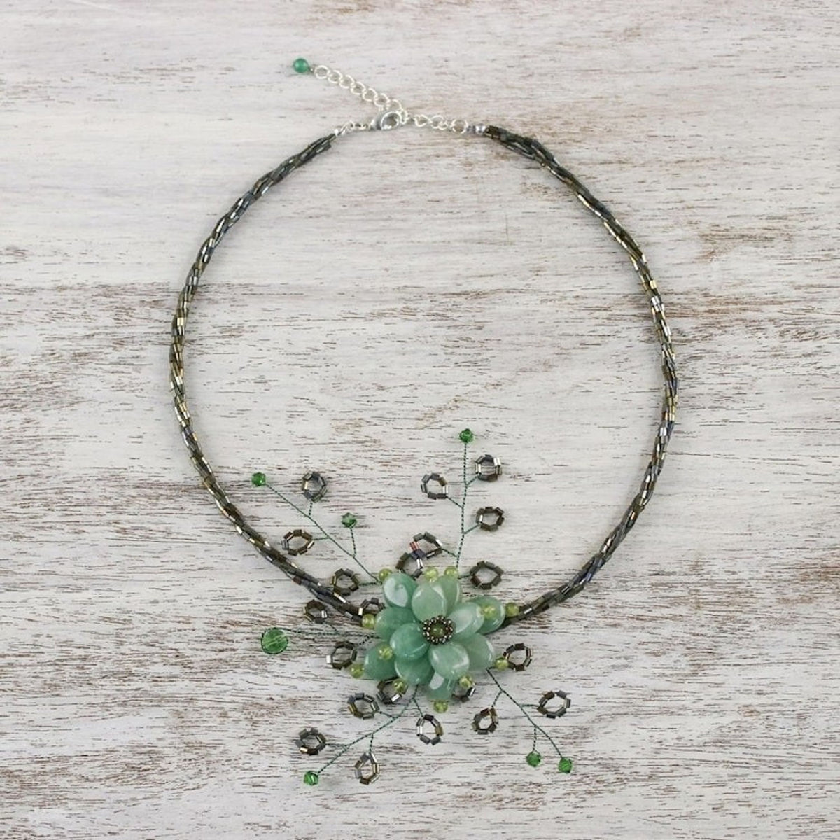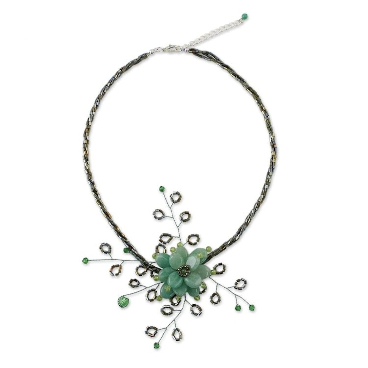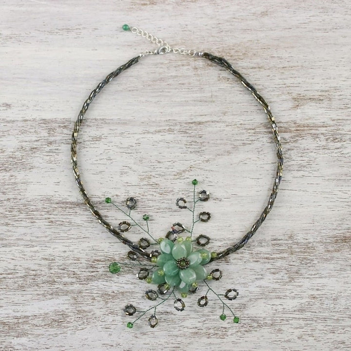 This Handcrafted Floral Beaded Quartz Necklace 'Elusive Blossom' by Independent Artisans is an ethereal choker that captures the essence of a jungle flower. Anusara selects green quartzite for this piece, adding details in natural peridot to create a blossom at the center. The design is infused with nature, tradition, and cultural pride, reflecting the artisan's commitment to both her craft and her community.