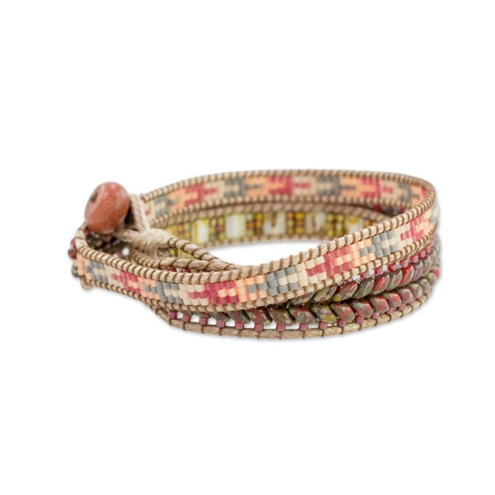 This Handcrafted Glass Beaded Wrap Bracelet from Guatemala 'Country Land' by Independent Artisans is an eternal wrap bracelet that features the soft beauty of the artisan's homeland. The bracelet is decorated with petite glass beads in tones of grey, peach, and pink, strung between two lengths of slate cord. The piece carries the spirit of freedom and cultural heritage, and closes with an aventurine gemstone button, adding a touch of natural elegance.