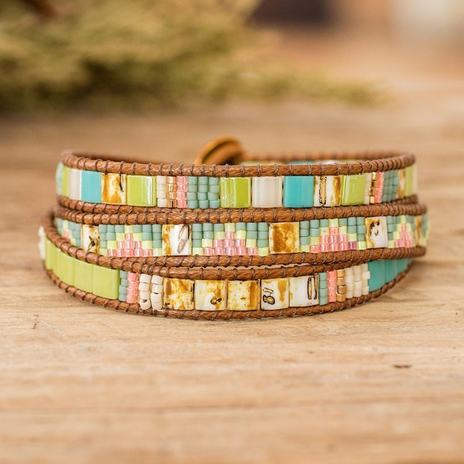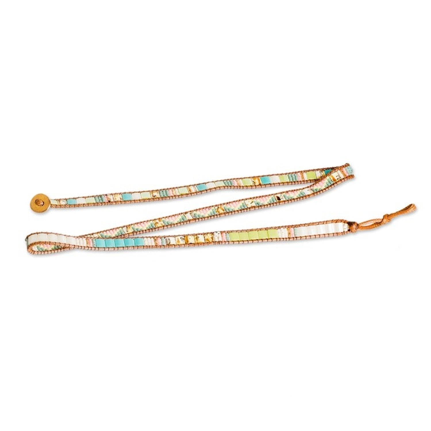 This Handcrafted Glass Beaded Wrap Bracelet from Guatemala 'Santa Fe' by Independent Artisans is a stunning piece that infuses a subtle pop of color into any outfit. Skillfully crafted by Cristobal Ramirez, each glass bead is intricately threaded along waxed cords using a specialized loom. The gorgeous pastel shades and antiqued Tibetan-style pewter button add a touch of sophistication, guaranteeing you will make a statement wherever you go.