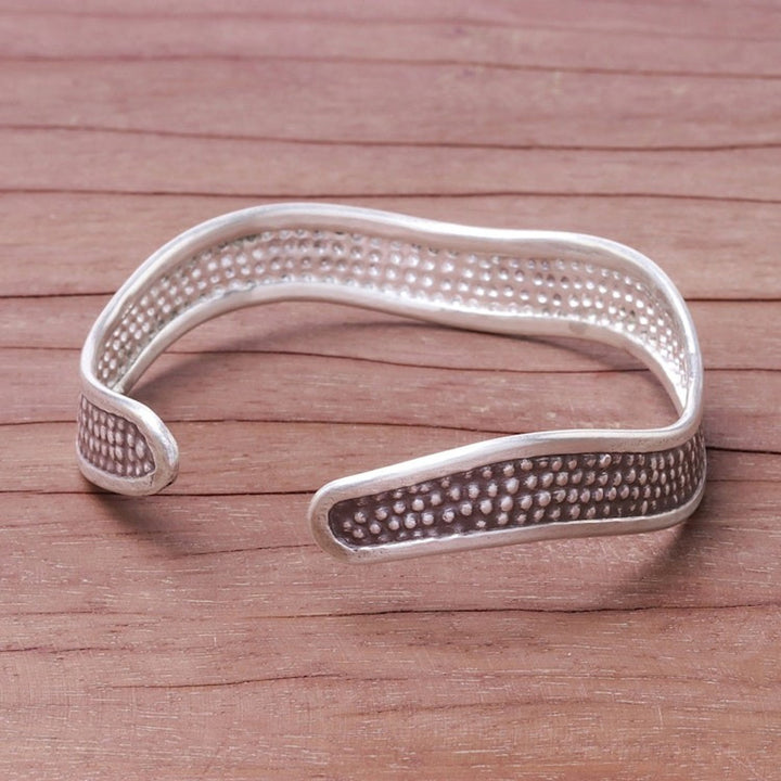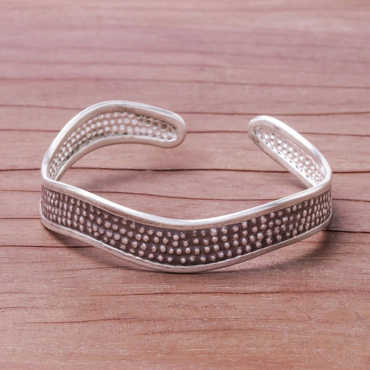 This Handcrafted Karen Silver Textured Wave Cuff Bracelet 'Texture Wave' by Independent Artisans is a unique accessory that bridges heritage and contemporary elegance. Designed by Achara, the cuff bracelet is made of Karen hill tribe silver and is formed into an undulating wave with a stippled finish. The piece reflects the artisans' mission to sustain Thai and hill tribe culture while supporting artisans with fair opportunities.
