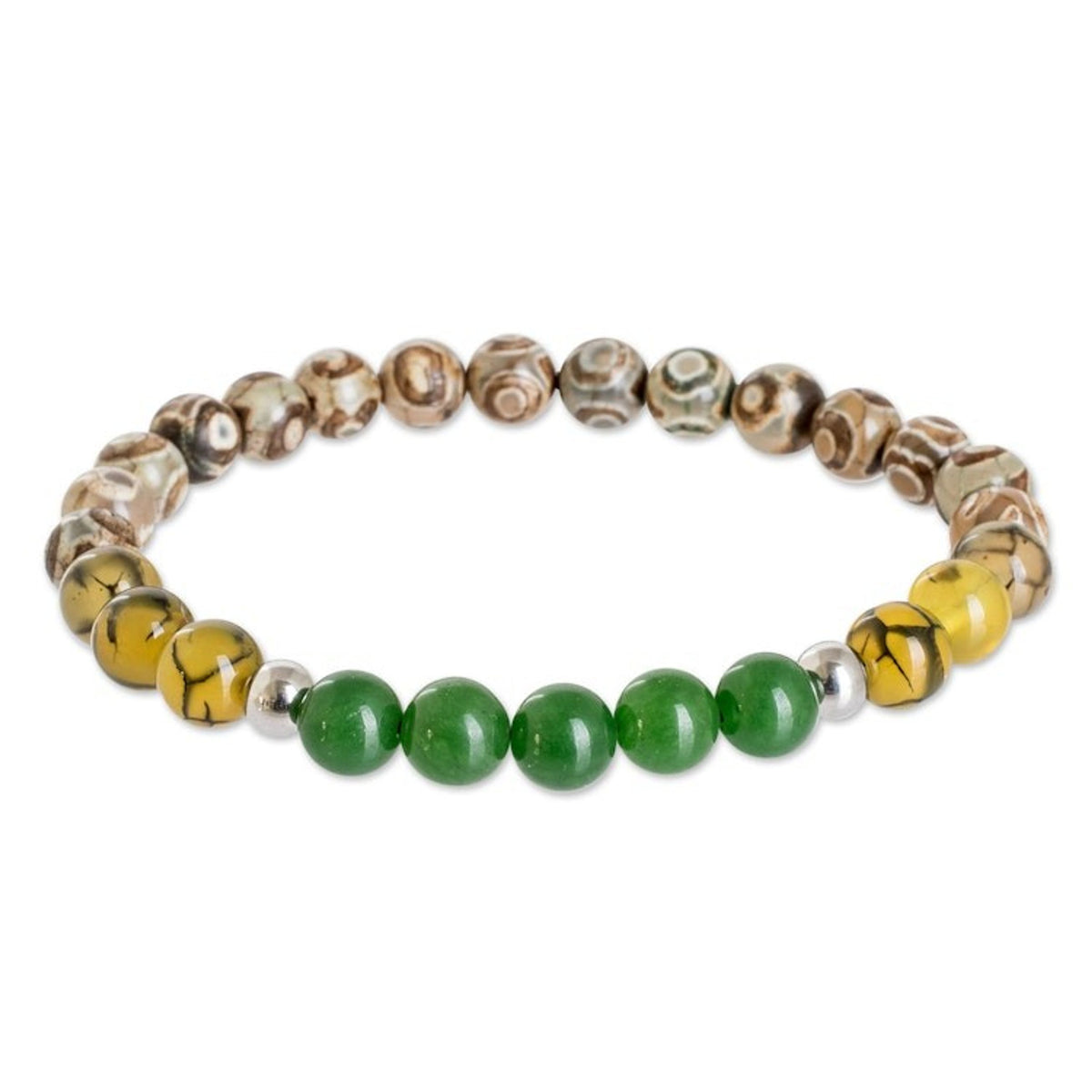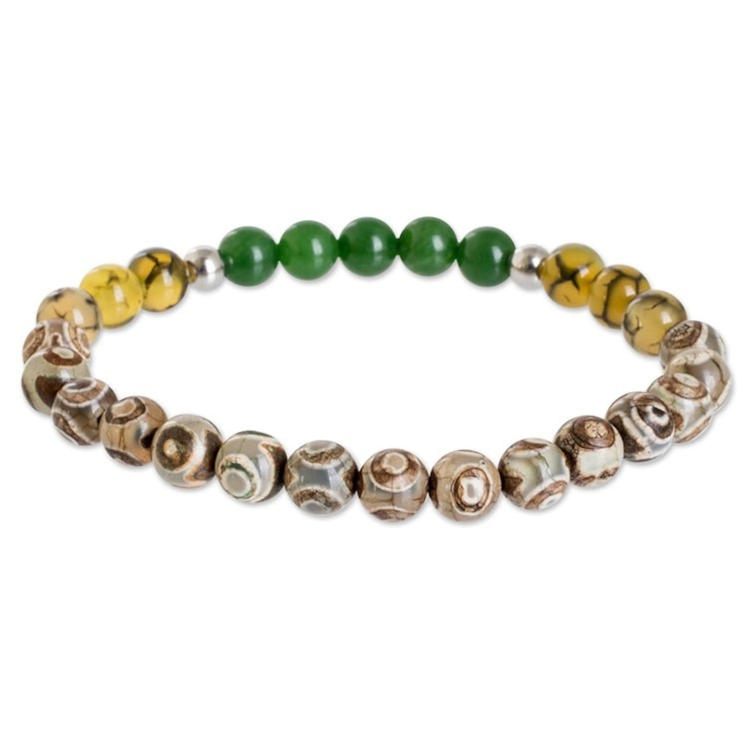 Handcrafted in Costa Rica from agate, jade, and stainless steel beads on an elastic cord, this bracelet has a high-polish finish. It has an inner circumference of 7.8 inches. Colors may vary slightly.