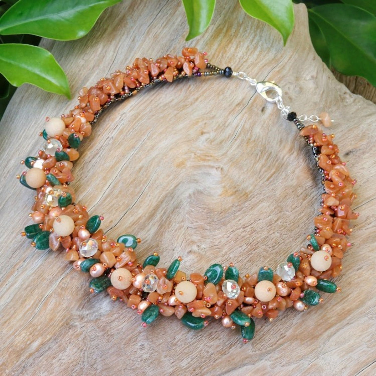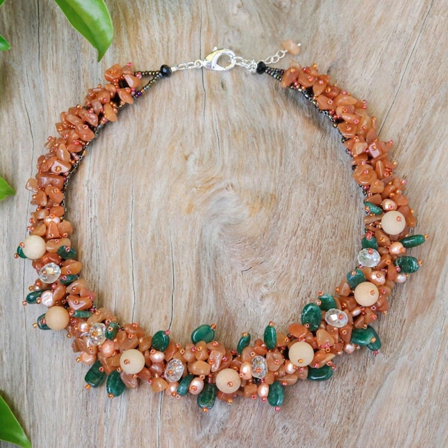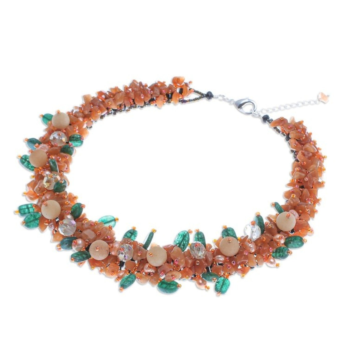 This Handcrafted Multi-Gemstone Orange Beaded Necklace 'Orange Paradise' by Independent Artisans is a dazzling creation that follows a stylish color scheme. Designed by Nareerat, the necklace brings together cultured pearls, aventurine chips, and quartz beads in a joyful orange tone that symbolizes warmth and freedom. The piece reflects the artisan's expertise and her mission to keep the art of handmade jewelry alive for future generations.