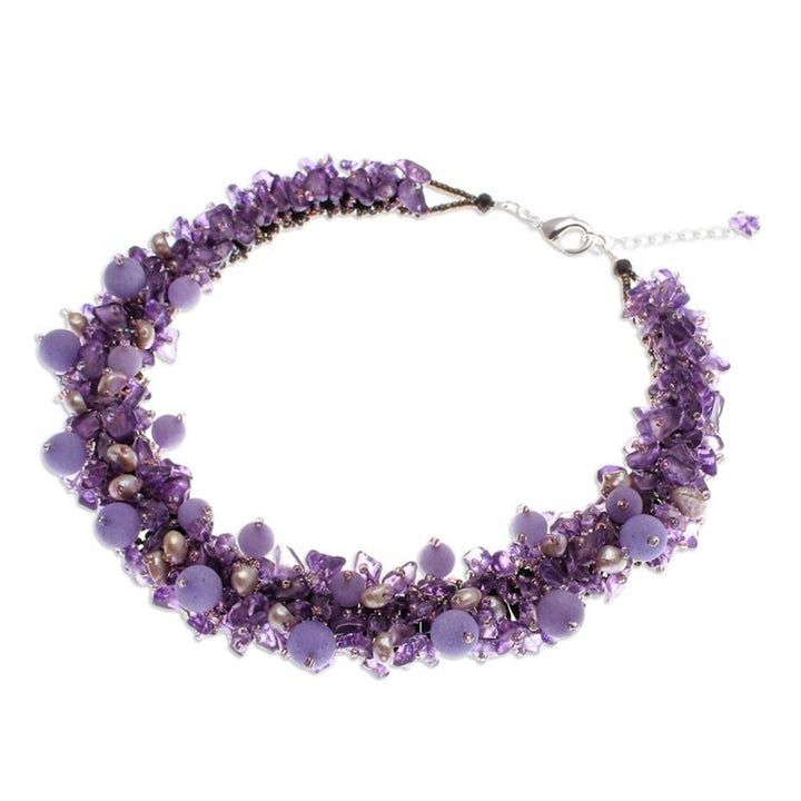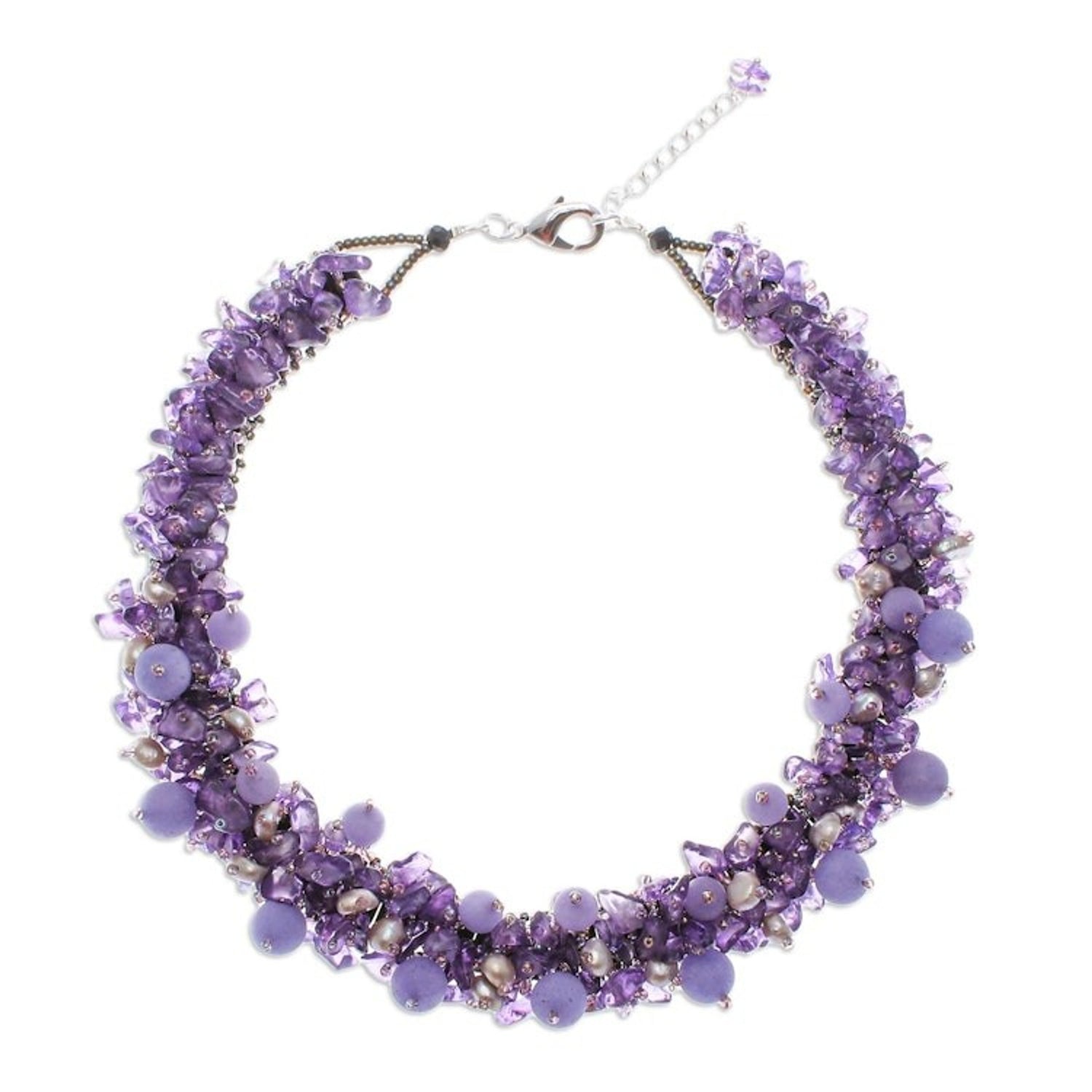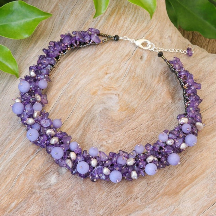 This Handcrafted Multi-Gemstone Purple Beaded Necklace 'Purple Paradise' by Independent Artisans is a marvelous and luxurious accessory. Designed by Nareerat, the necklace features cultured pearls, amethyst chips, and quartz beads in a mystic purple tone that symbolizes nobility and wisdom. The piece reflects the artisan's expertise and her passion for celebrating the beauty of nature and color.