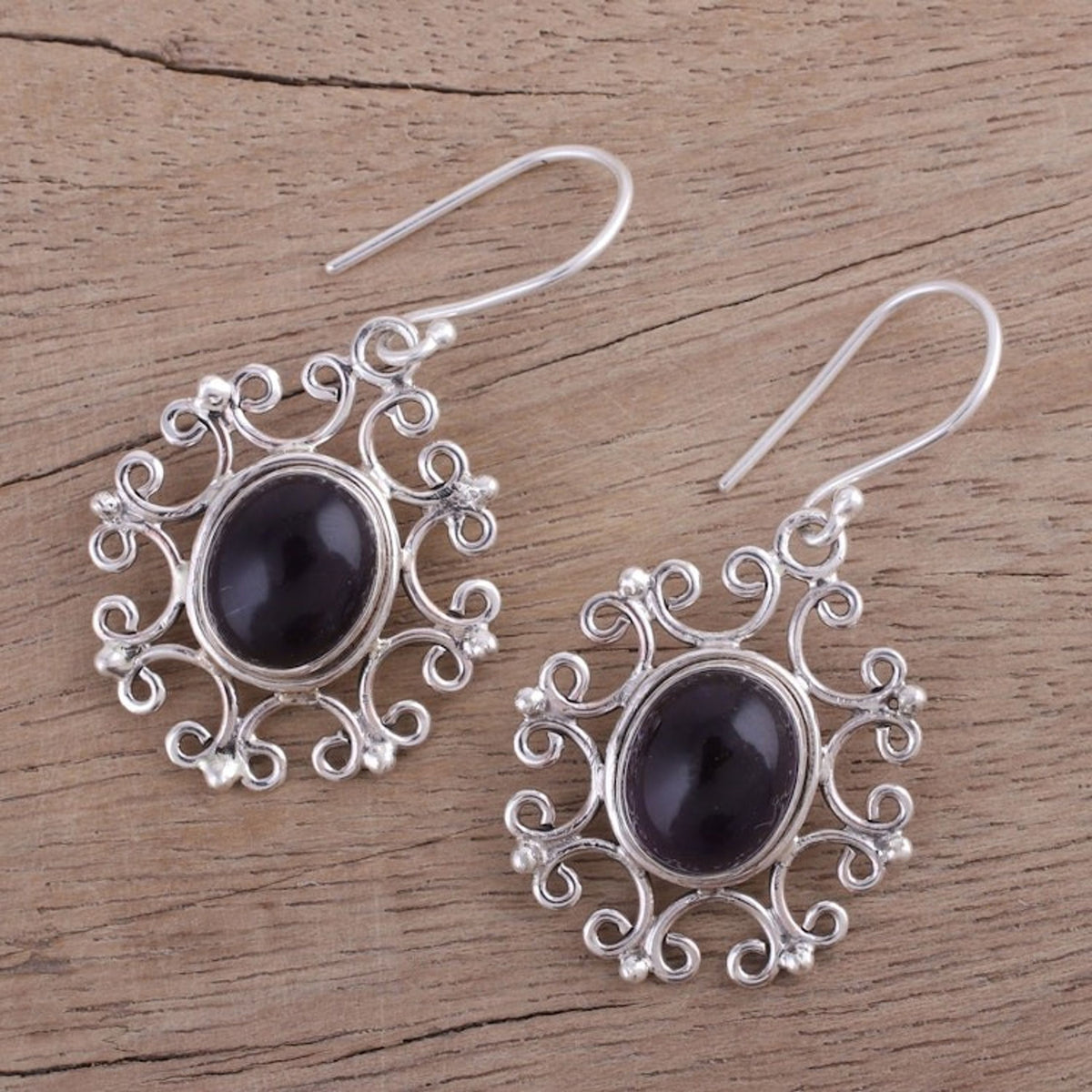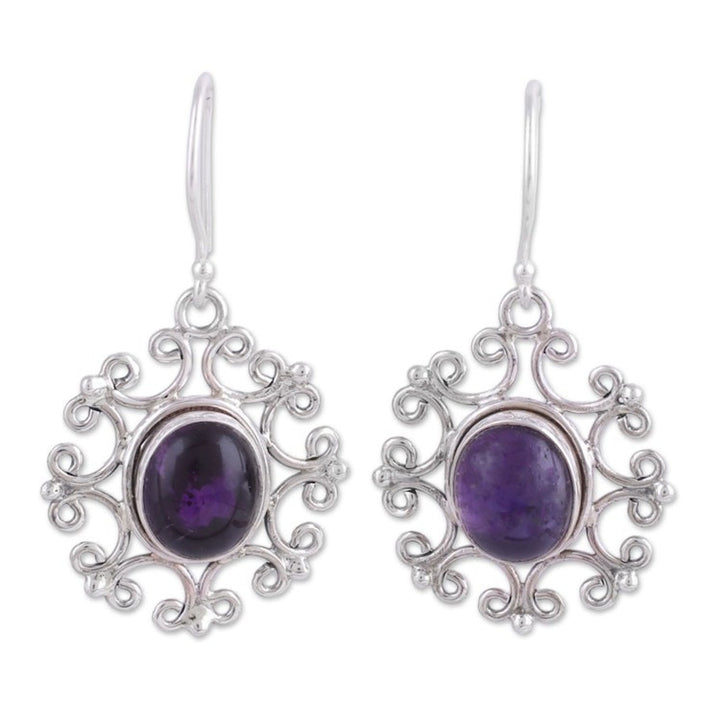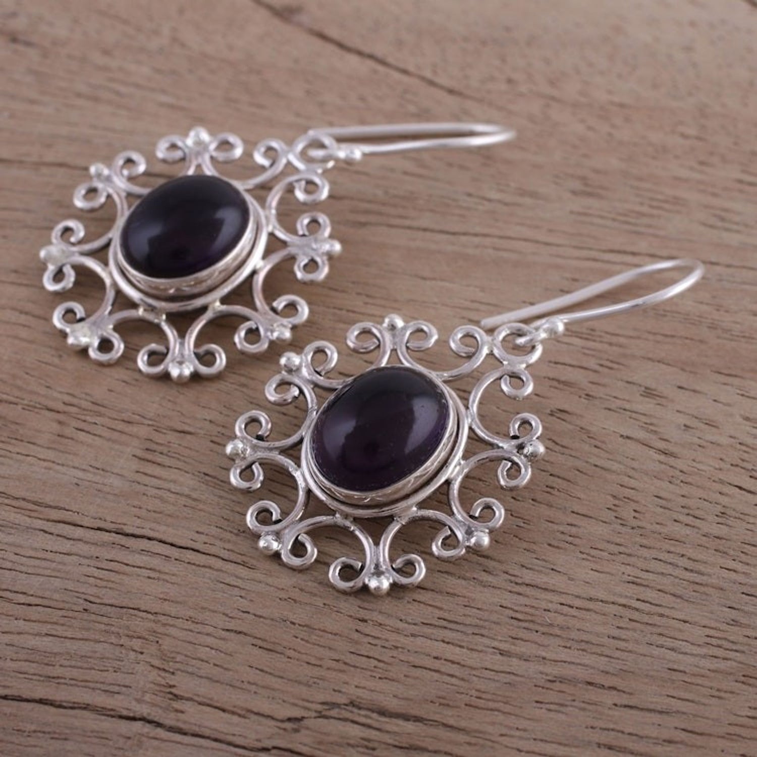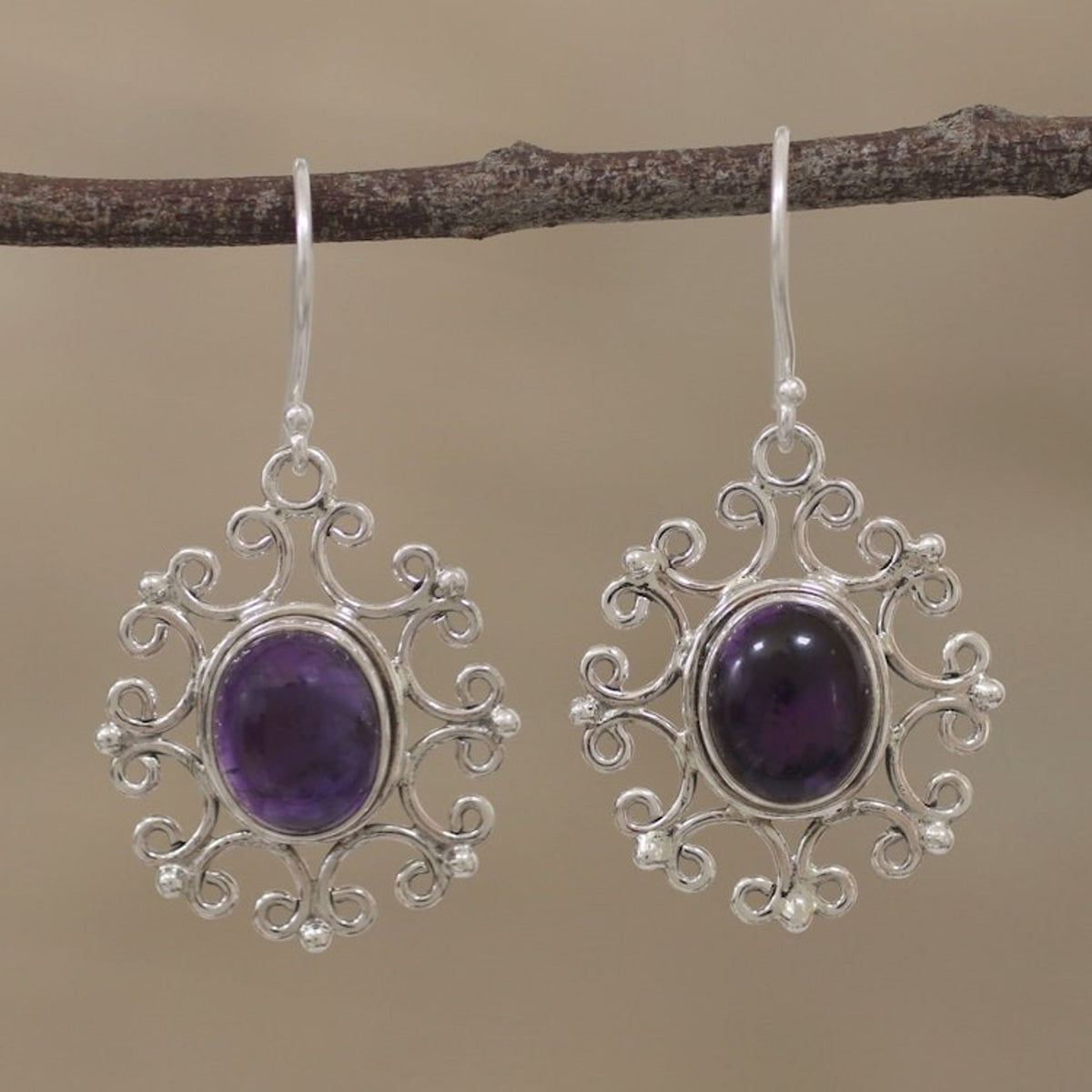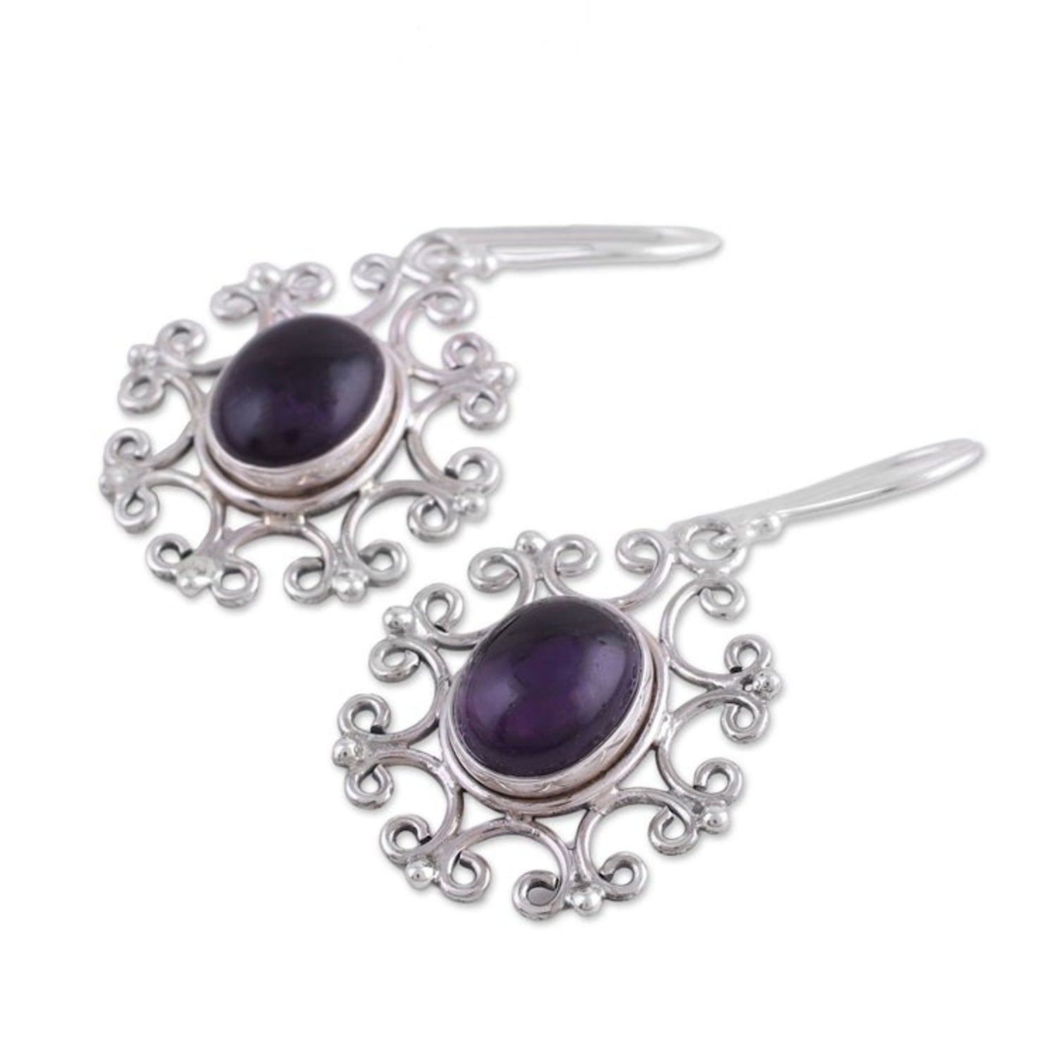 These Handcrafted Oval Amethyst Dangle Earrings from India 'Oval Majesty' by Independent Artisans are a beautiful and majestic accessory. Designed by Parul, the earrings feature oval cabochons of purple amethyst surrounded by handcrafted sterling silver wire that creates majestic patterns. The piece blends traditional Indian styles with modern touches, and reflects the artisan's dream of one day opening her own boutique.