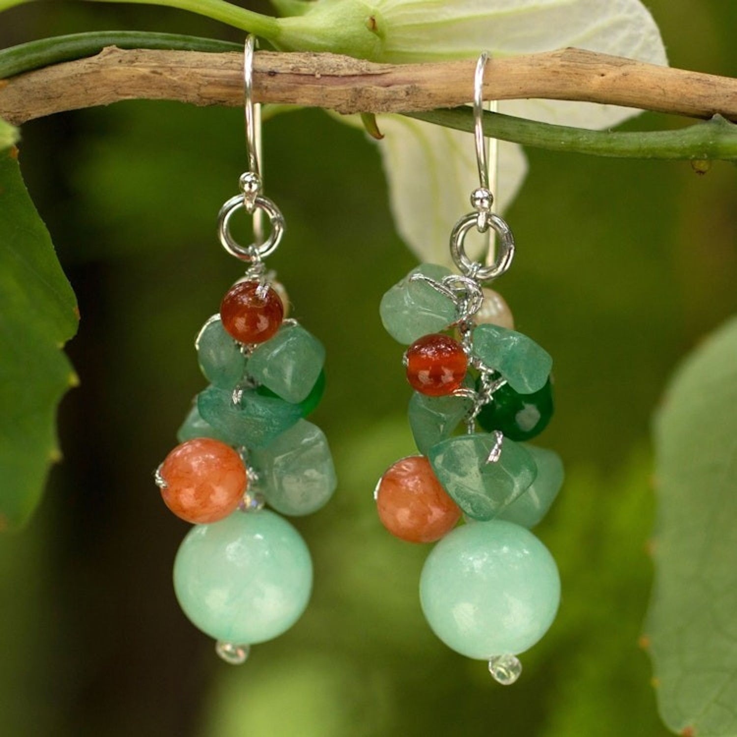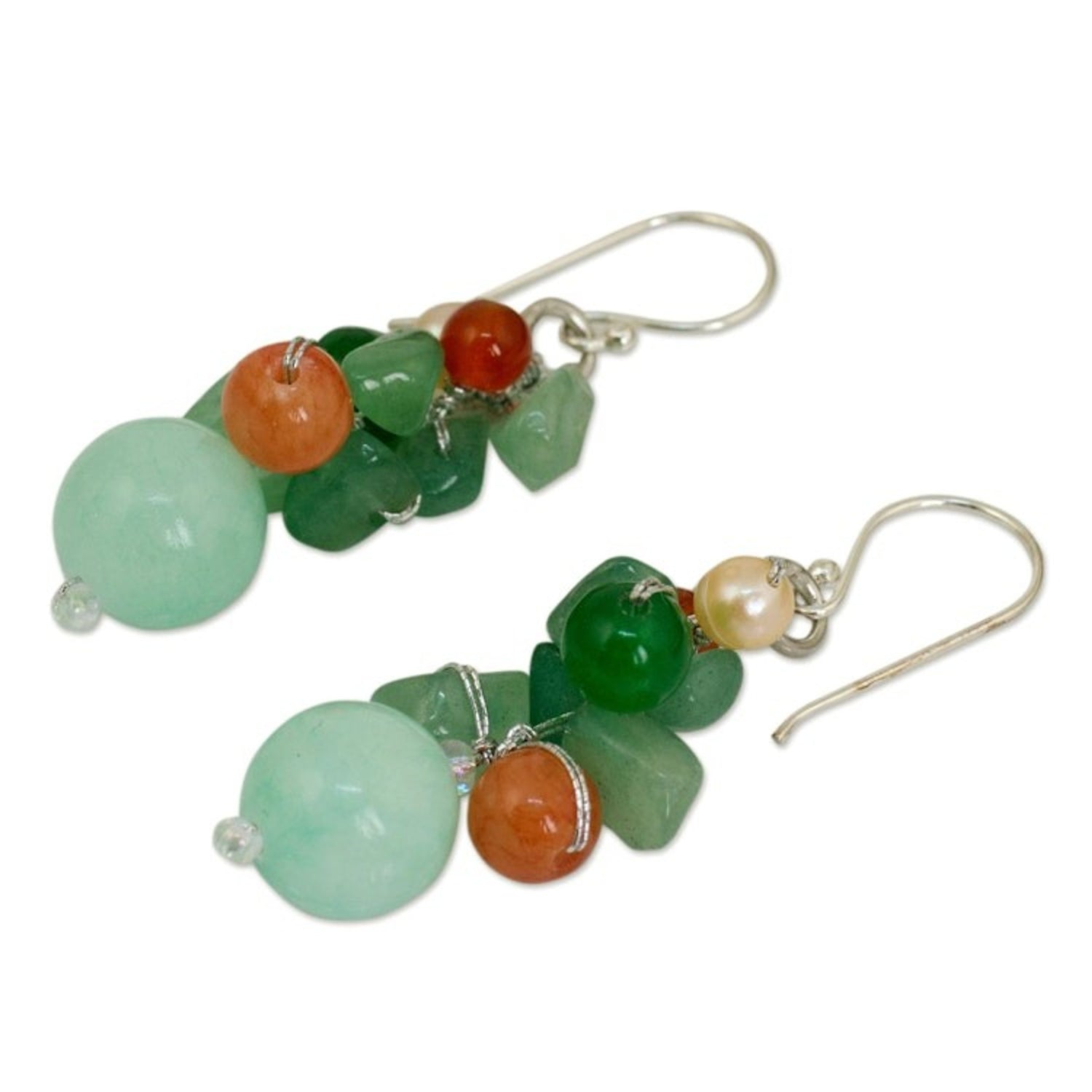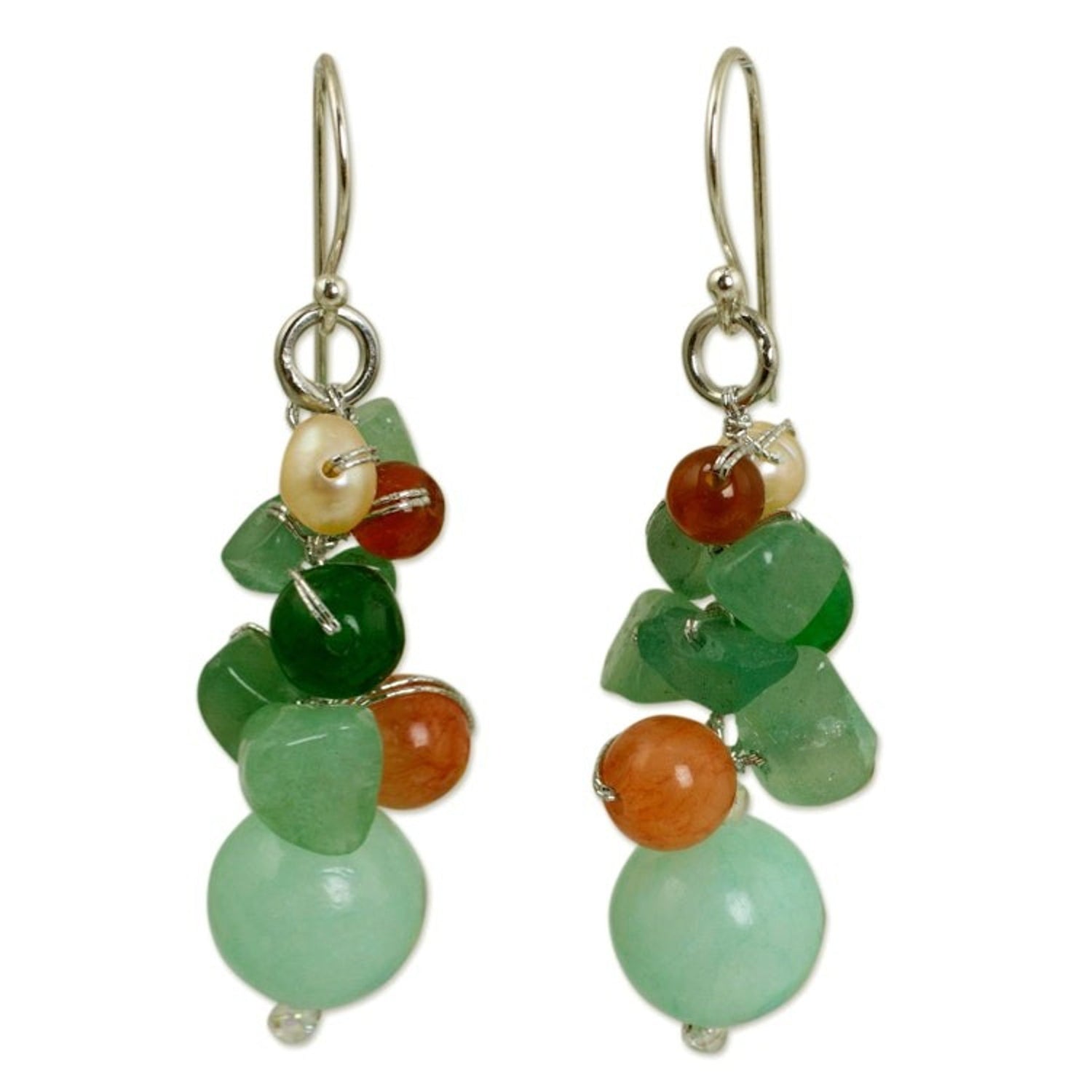 Handcrafted in Thailand with cultured freshwater pearls, dyed quartz, carnelian, and sterling silver hooks, these earrings are a beautiful cluster of gems. Each earring measures 1.8 inches in length and 0.5 inches in width.