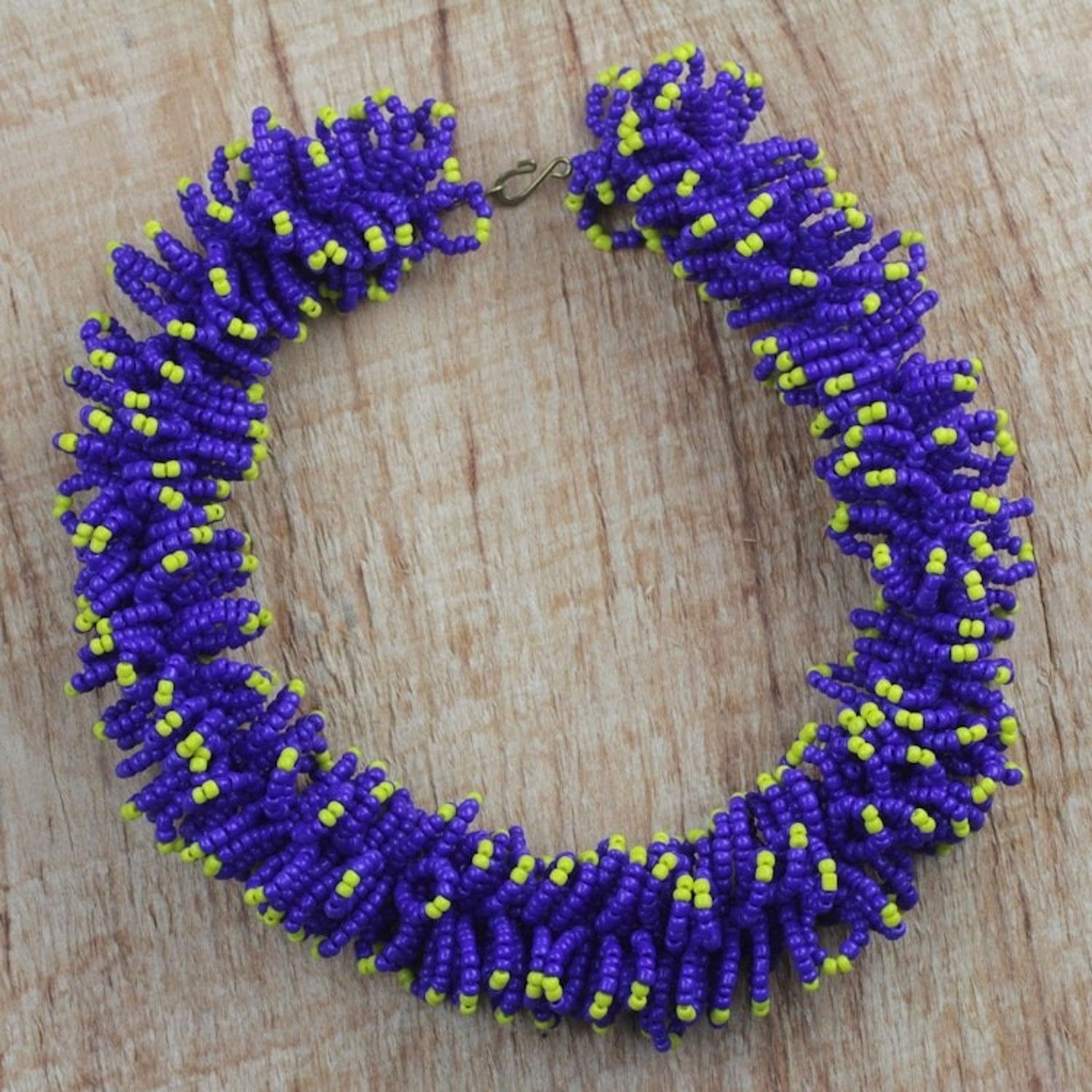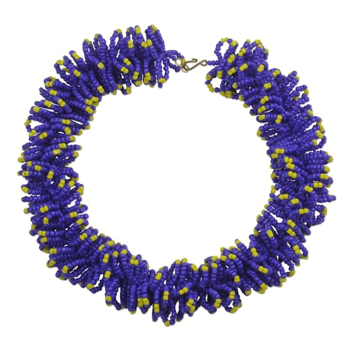 This Handcrafted Recycled Glass Beaded Necklace 'Bright Universe' by Independent Artisans is a one-of-a-kind and dramatic accessory. Designed by Kwaku Ofosuhene Apenteng, the stretch necklace is crafted by hand using recycled glass beads in shades of cobalt and goldenrod. The piece reflects the artisan's journey from business to wood carving, and his commitment to blending tradition with originality.