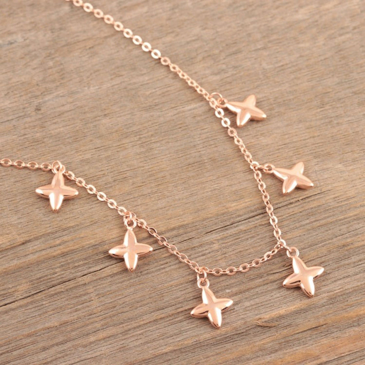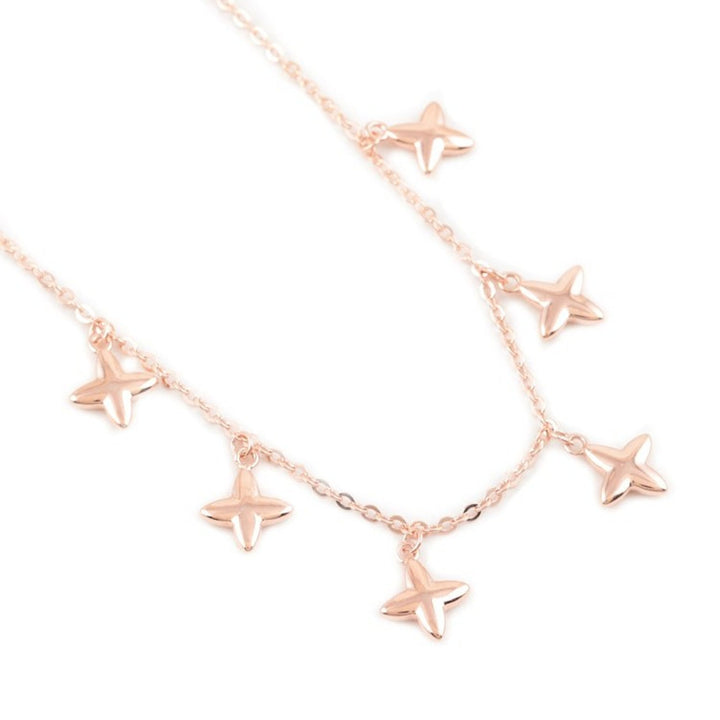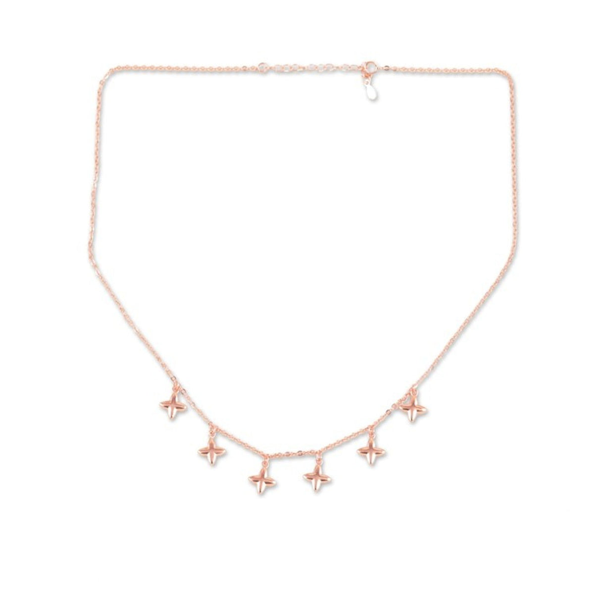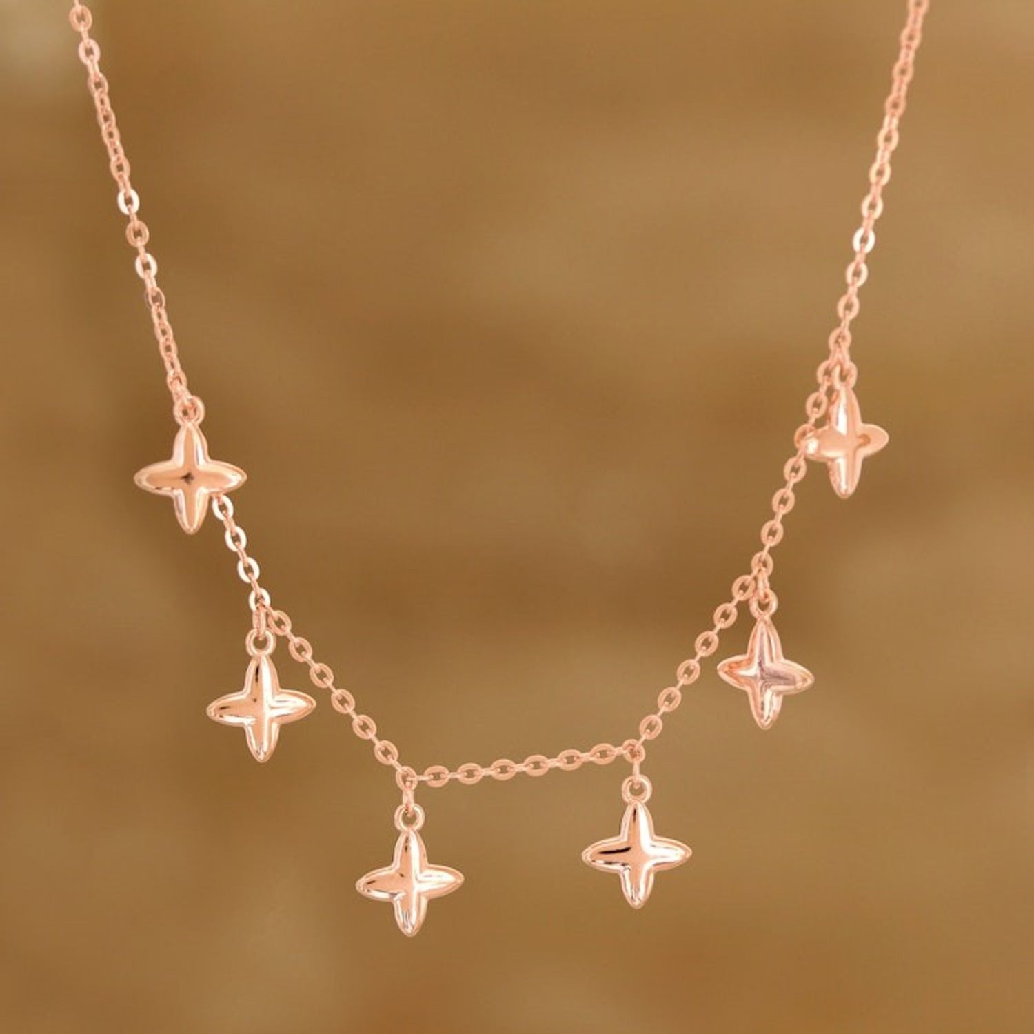 This Handcrafted Rose Gold-Plated Pendant Necklace 'Pink Starlet' by Independent Artisans is a warm and romantic accessory. Designed by Parul, the necklace is handcrafted from 14k rose gold-plated sterling silver and features six polished stars suspended from a sleek cable chain. The piece, which is accented with a pretty star motif, reflects the artisan's ability to blend traditional Indian styles with modern touches, creating jewelry that feels both classic and contemporary.