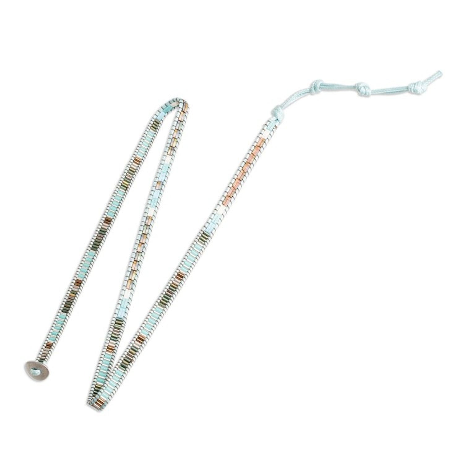Handcrafted in Guatemala with waxed nylon cords, glass beads, and a pewter button clasp, this wrap bracelet is adjustable from 20 to 21.5 inches in length. Colors may vary slightly.