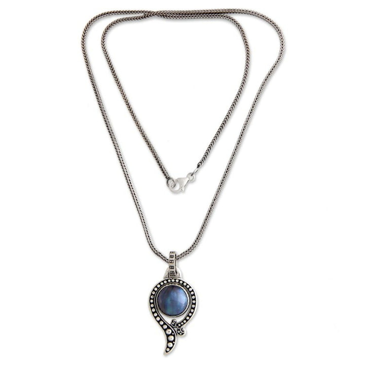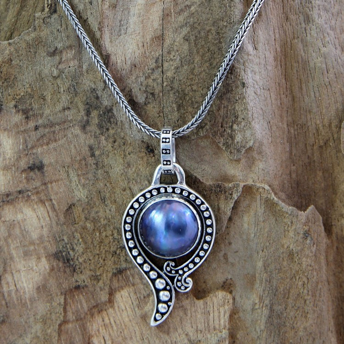 This Handcrafted Sterling Silver and Pearl Necklace 'Sky Catcher' by Independent Artisans is a lovely and feminine accessory. Designed by Kenari, the necklace features a luminous blue pearl, the June birthstone, embraced by a tiara of sterling silver as though catching a bit of the heavens. The piece, which is gracefully feminine, reflects the artisan's dedication and precision, balancing tradition with innovation.