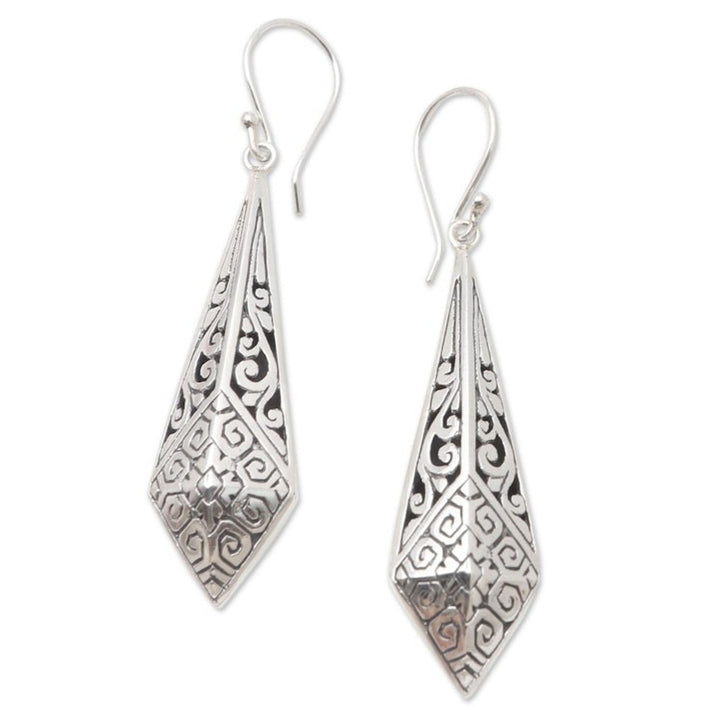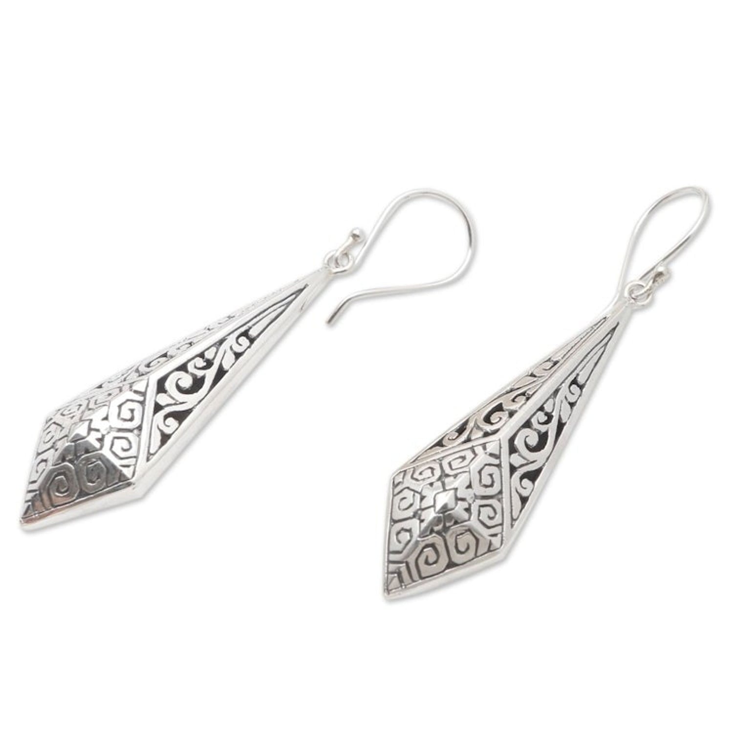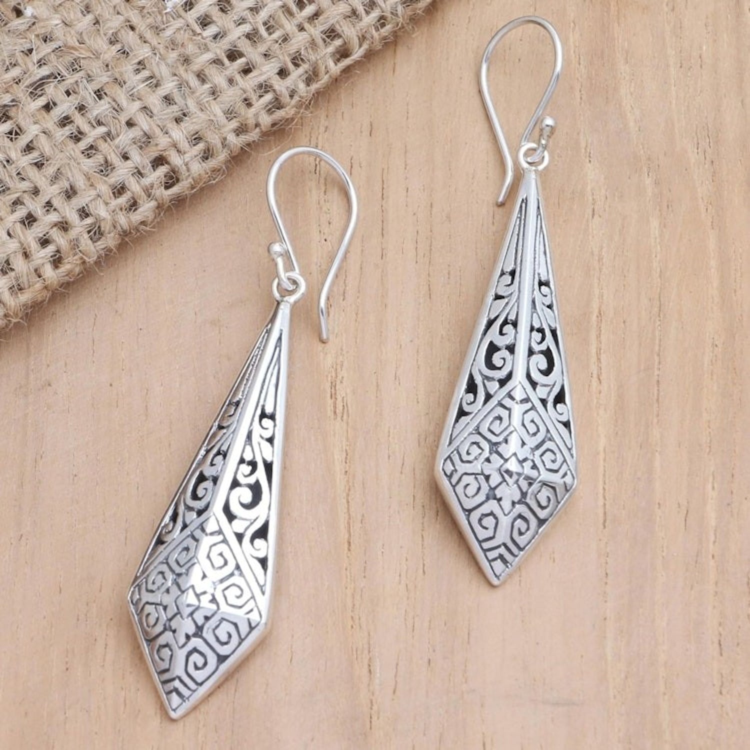 These Handcrafted Sterling Silver Dangle Earrings 'Dress Up' by Independent Artisans are an elegant and artistic accessory. Designed by Dewa Arimbawa, the dangle earrings are shaped like a men's tie and are engraved with geometric designs. The piece, which is handcrafted from sterling silver with openwork and oxidized designs, reflects the artisan's commitment to blending traditional Balinese architecture and weaving patterns with modern, elegant forms.